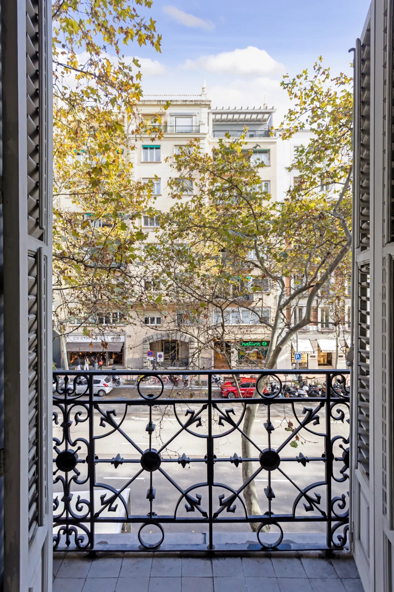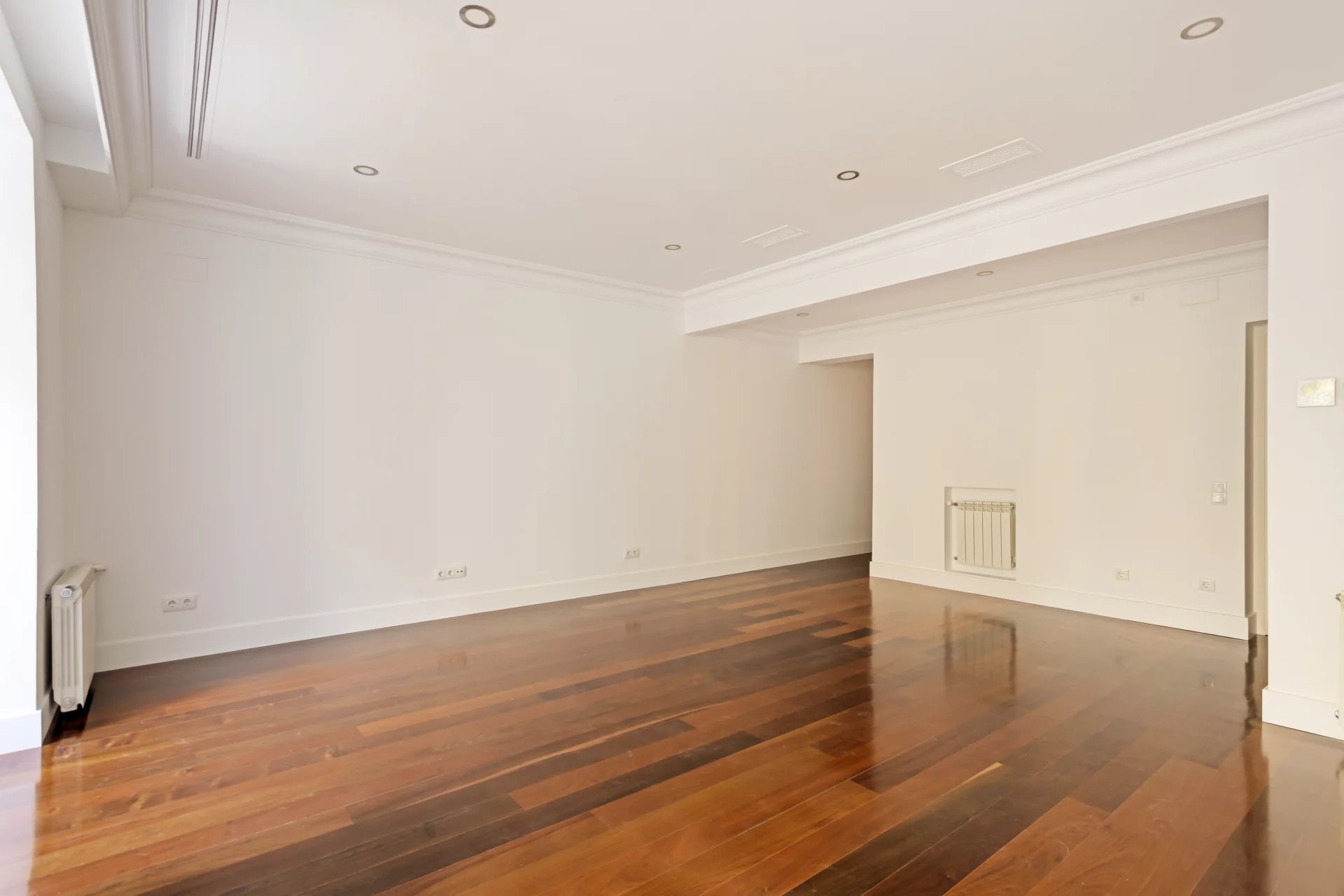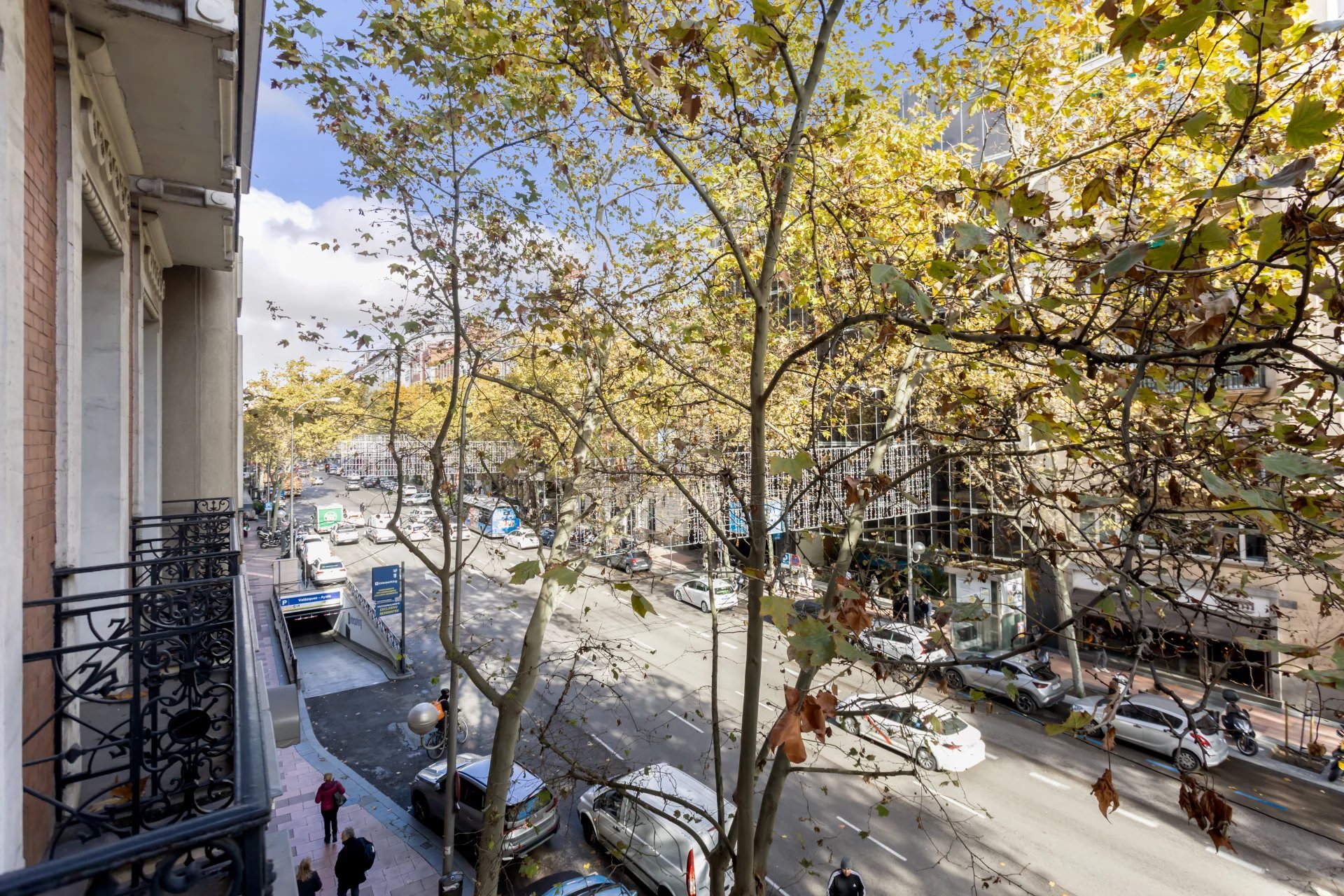 Le salon/salle à manger, spacieux et lumineux, donne sur la rue Velázquez et bénéficie d'une agréable lumière naturelle le matin (orientation est).