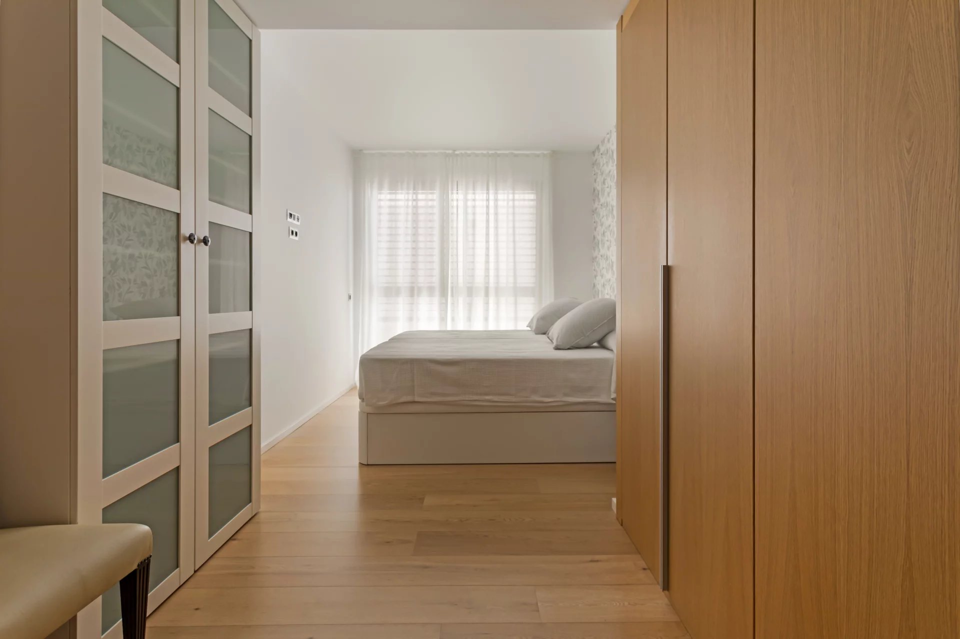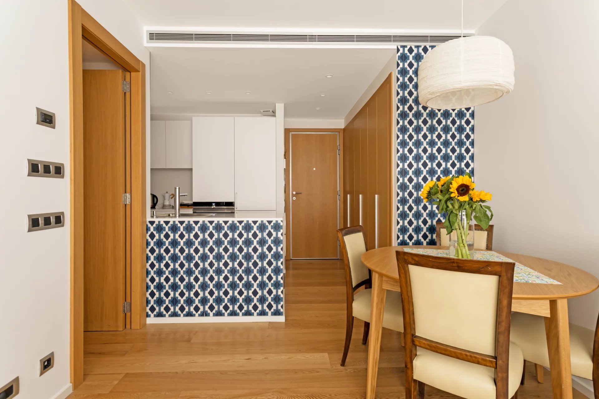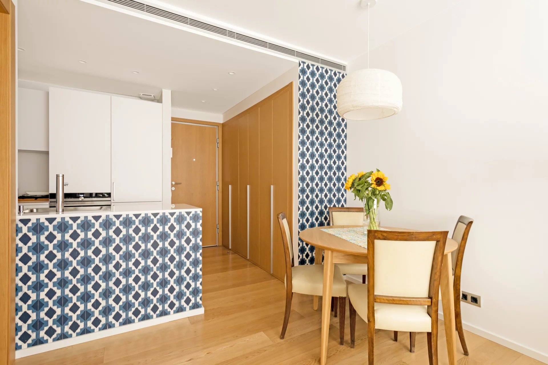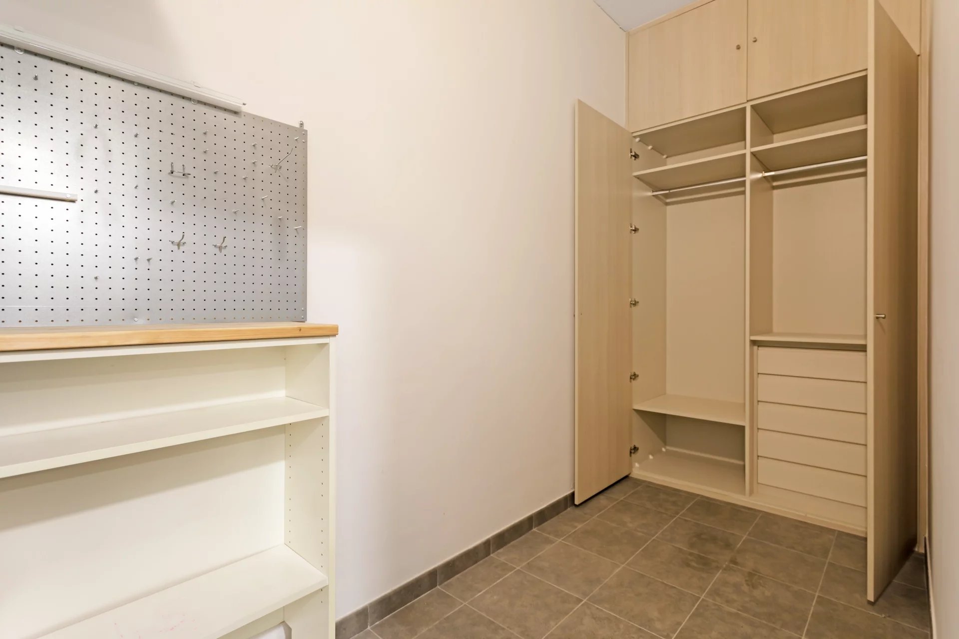 Cet appartement de 110m² au 4ème étage d'un immeuble datant de 2018 est divisé en un salon-salle à manger lumineux avec cuisine ouverte, une chambre principale avec armoires encastrées et salle de bain attenante, une autre chambre avec armoires encastrées et une salle de bain en face qui sert également de toilettes pour les invités.