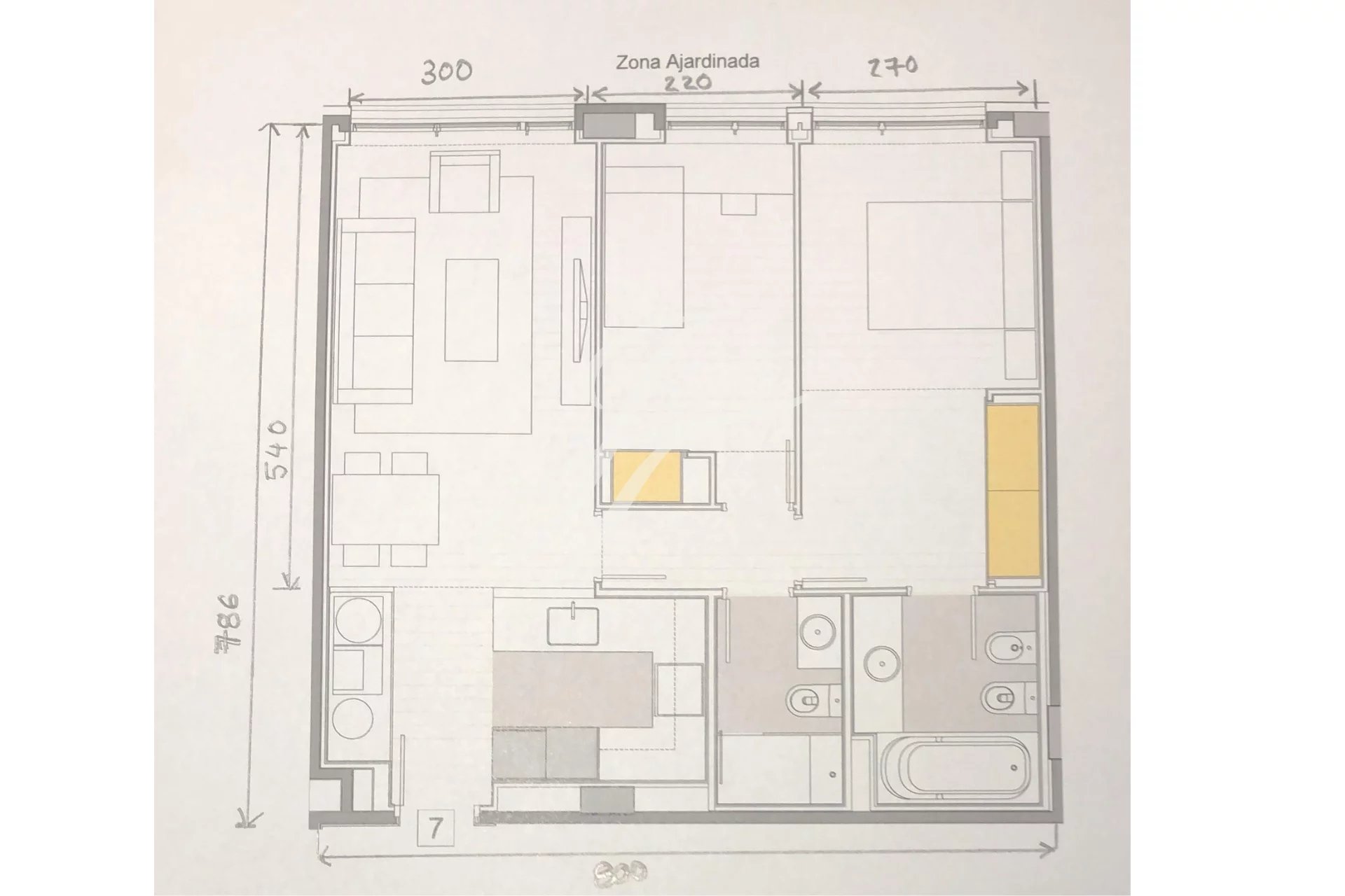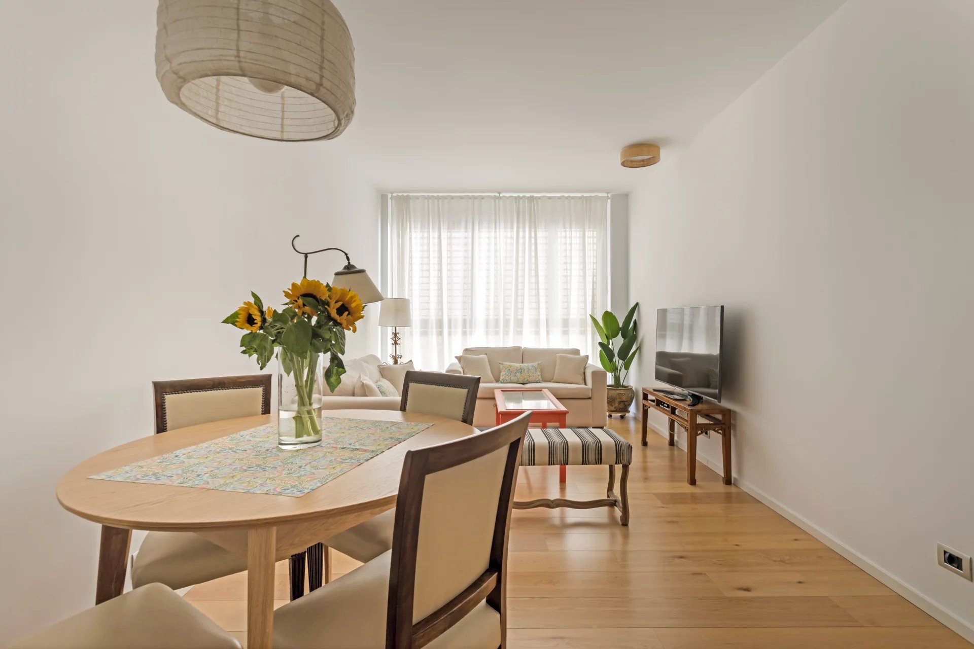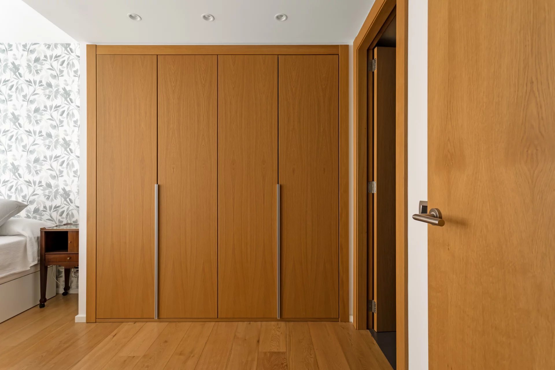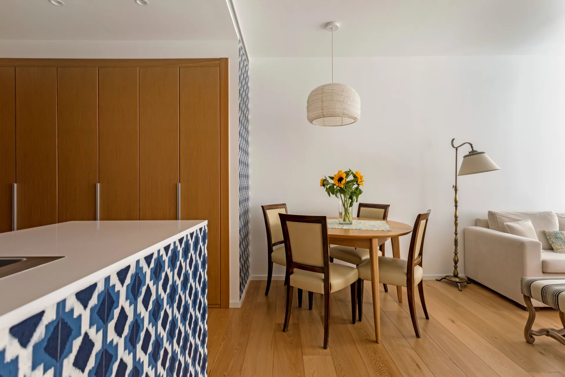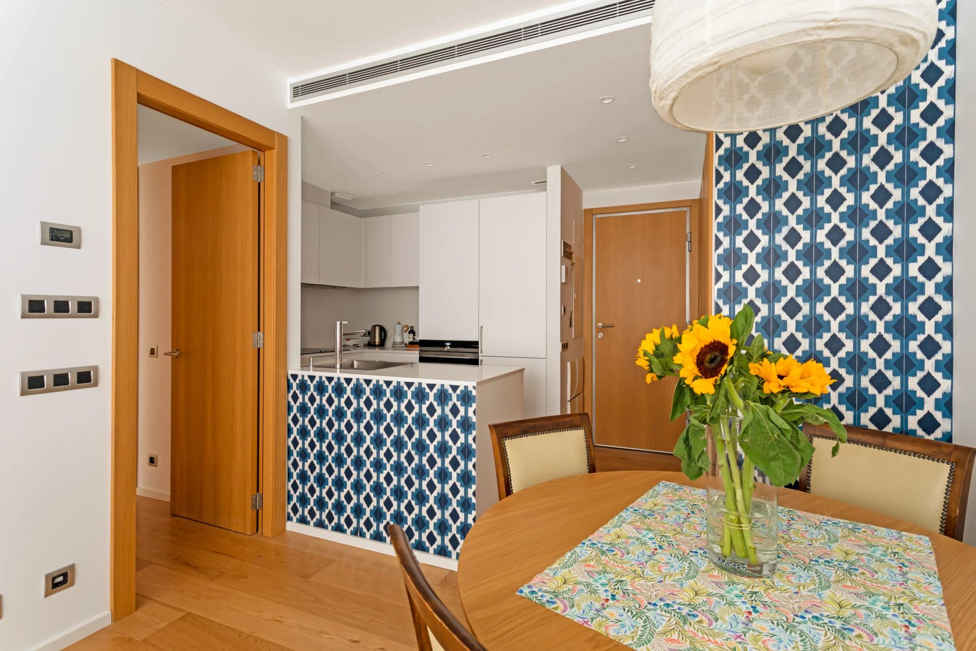 Cet appartement de 110m² au 4ème étage d'un immeuble datant de 2018 est divisé en un salon-salle à manger lumineux avec cuisine ouverte, une chambre principale avec armoires encastrées et salle de bain attenante, une autre chambre avec armoires encastrées et une salle de bain en face qui sert également de toilettes pour les invités.