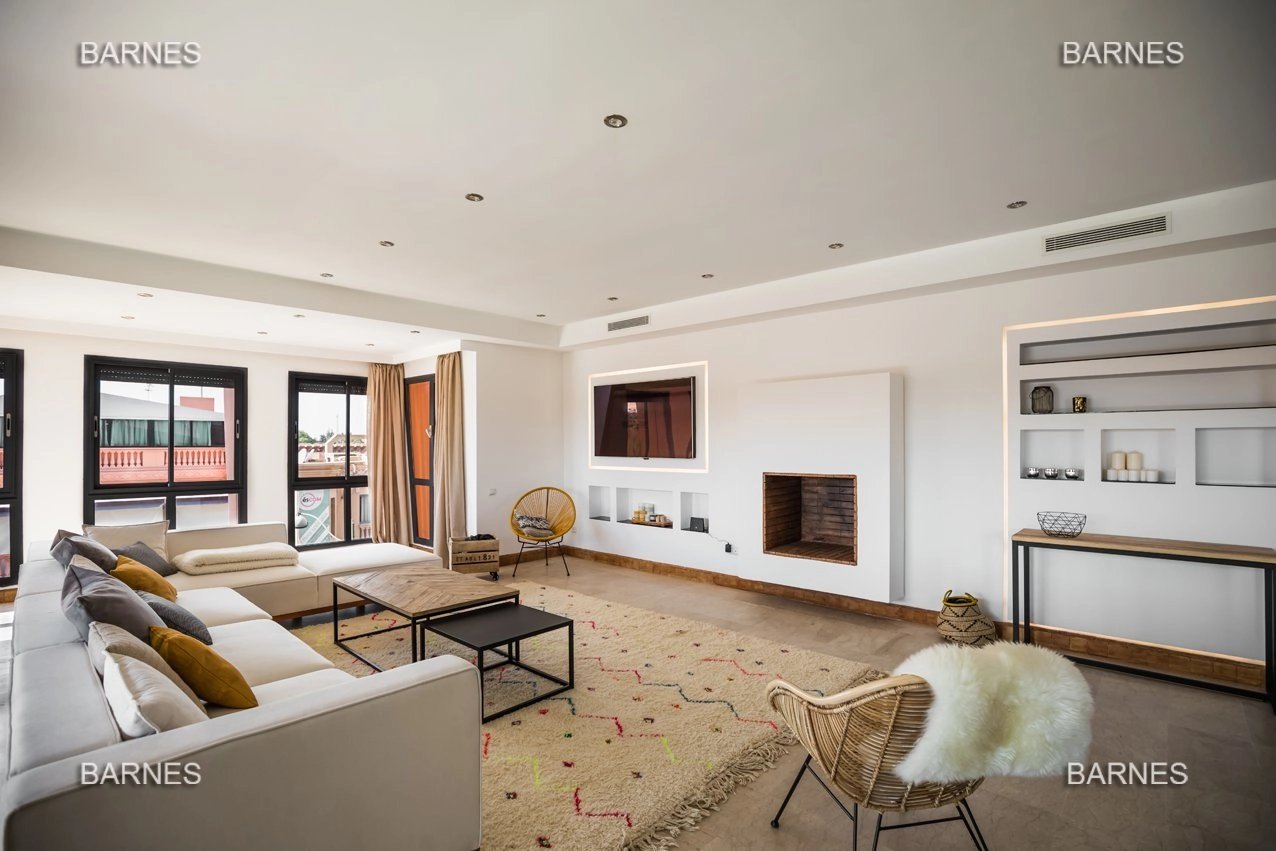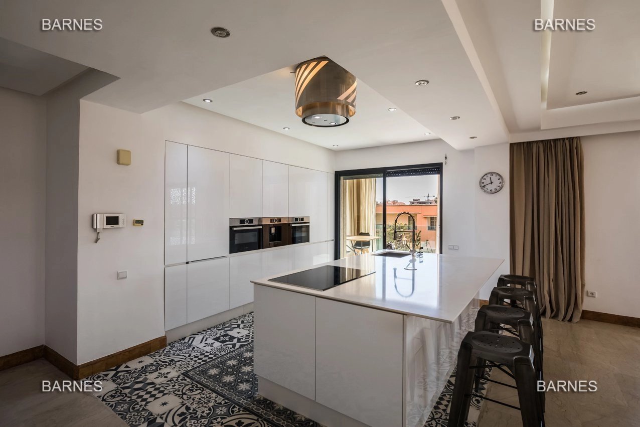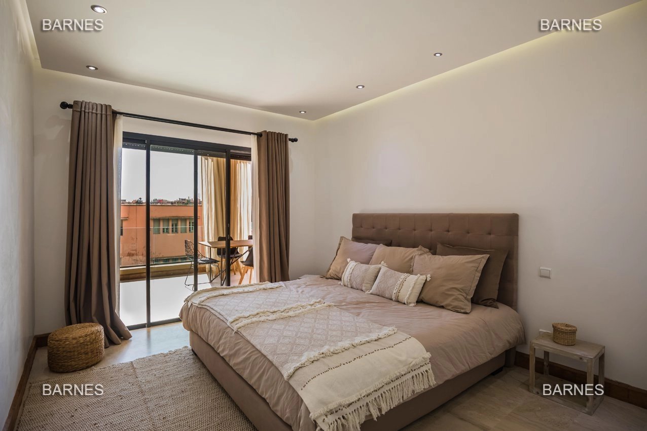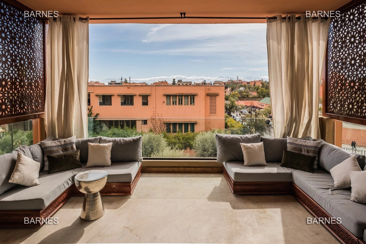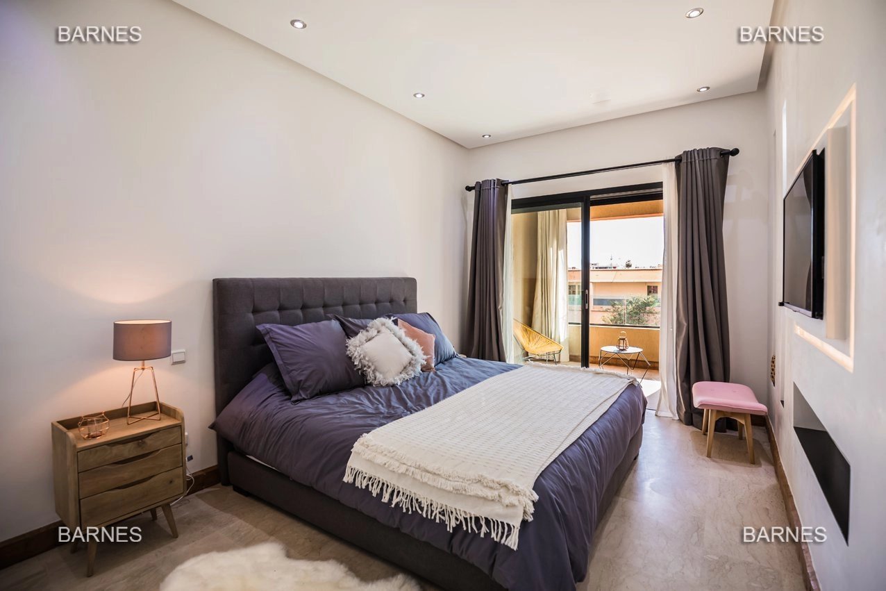 Ce sublime appartement a louer aux lignes et couleurs épurées se situe dans le quartier chic de l'Hivernage, dans une résidence de très haut standing. Meublé avec goût et sans démesure, il se compose d'un salon, d'une cuisine moderne totalement fonctionnelle, de deux chambres dont une master room avec salle de bain et d'une salle d'eau avec douche italienne. La terrasse de 50m2 bordée de moucharabiehs rappelant subtilement l'artisanat marocain, est accessible par le salon et les deux chambres. Aménagée sans excès et avec confort, elle se confond presque avec une pièce à vivre! La vue est dégagée et imprenable sur les montagnes de l'Atlas. Vendu meublé: Électroménager Bosch (four à chaleur tournante, plaque de cuisson, micro-onde, machine à café,...), Smart Tv Samsung, tapis d'artisanat en laine entièrement fait main, meubles Indus L'appartement dispose d'une place de parking titrée en sous-sol avec son box de rangement. A VISITER SANS PLUS ATTENDRE!!