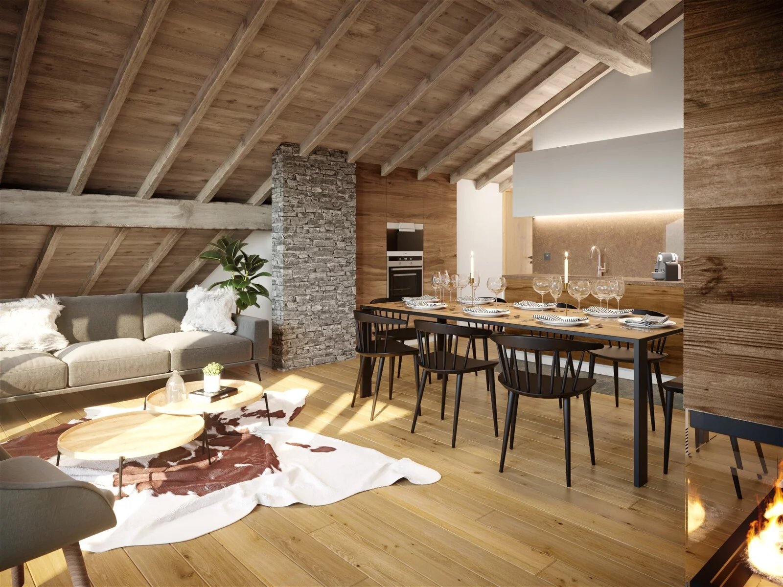 Les fermes de l'Alpe vous présente une architecture gardant l'ADN montagnard afin de parfaitement s'implanter dans la station, une fois à l'intérieur on retrouve une atmosphère cosy-chic avec la présence de matériaux locaux comme le bois et la pierre. De très belles prestations qui sont entièrement personnalisables avec la mise à disposition d'un carnet d'ambiances en plus d'une vue à couper le souffle qui vont pour sûr vous convaincre d'investir ici.