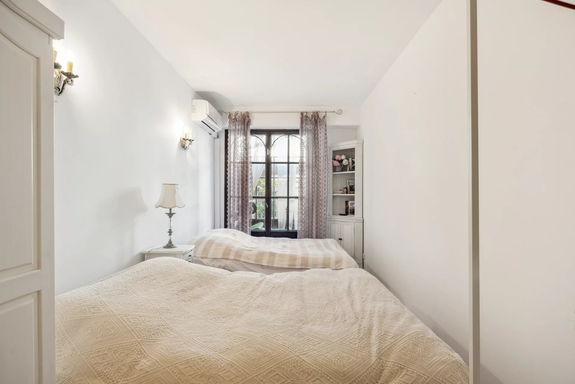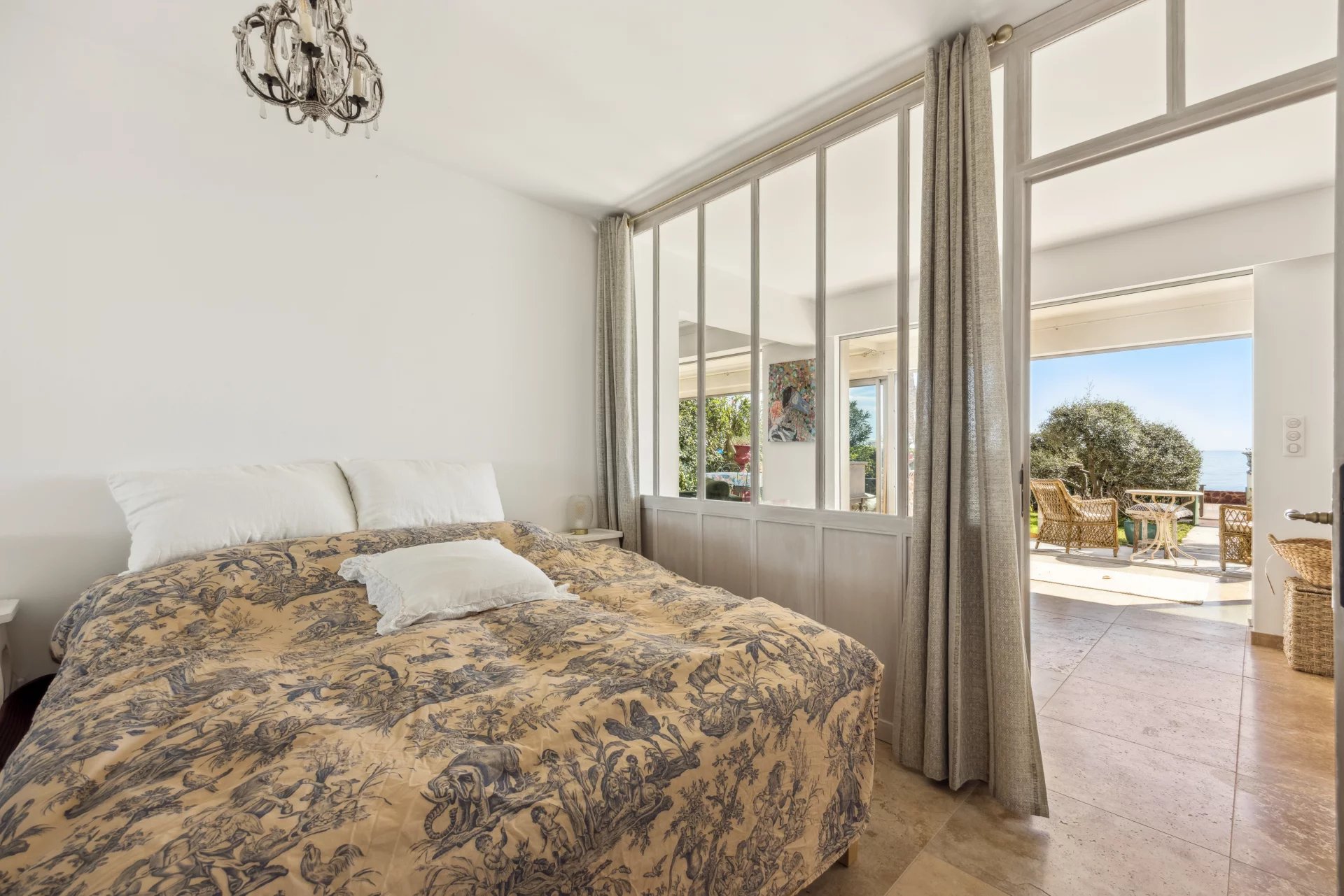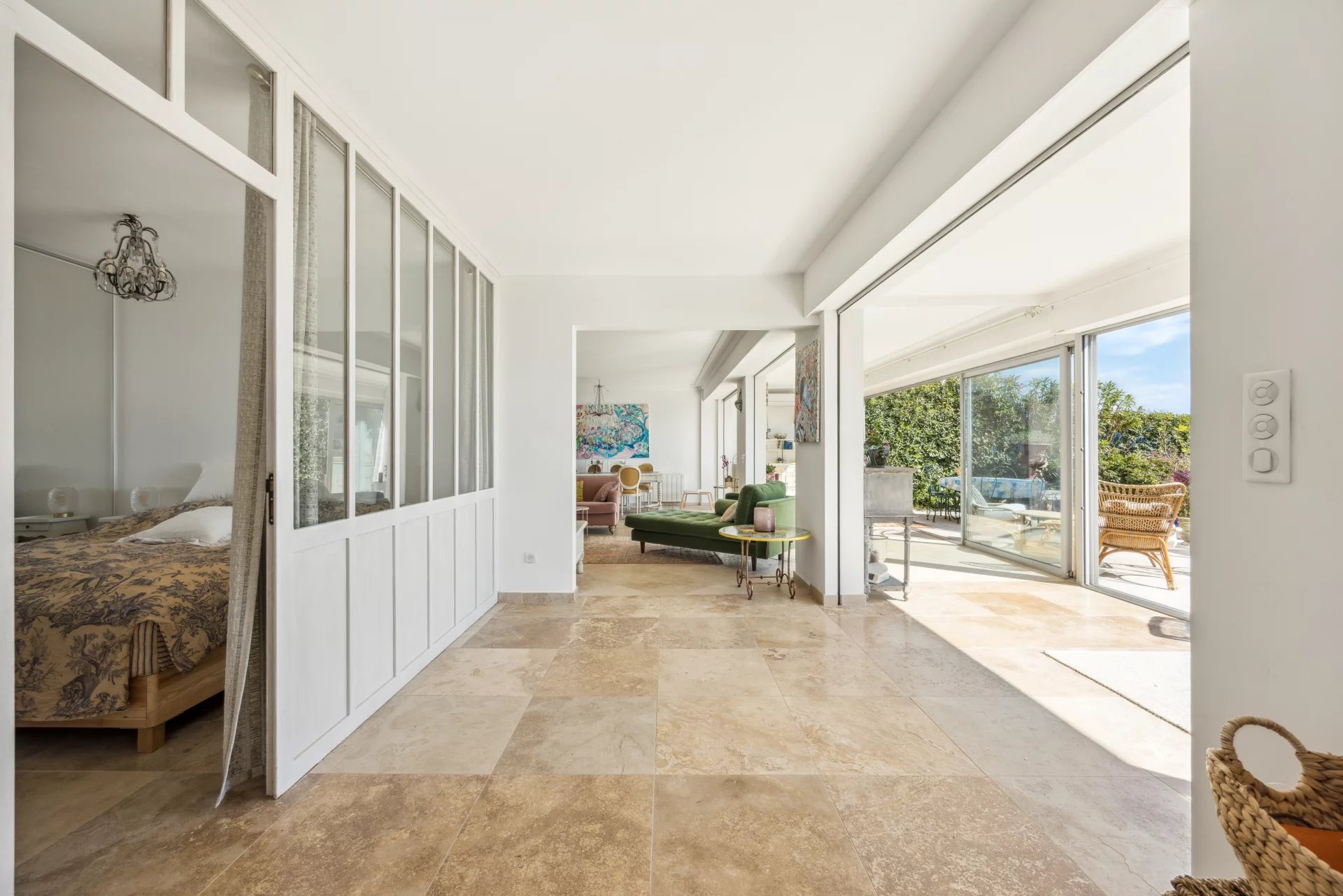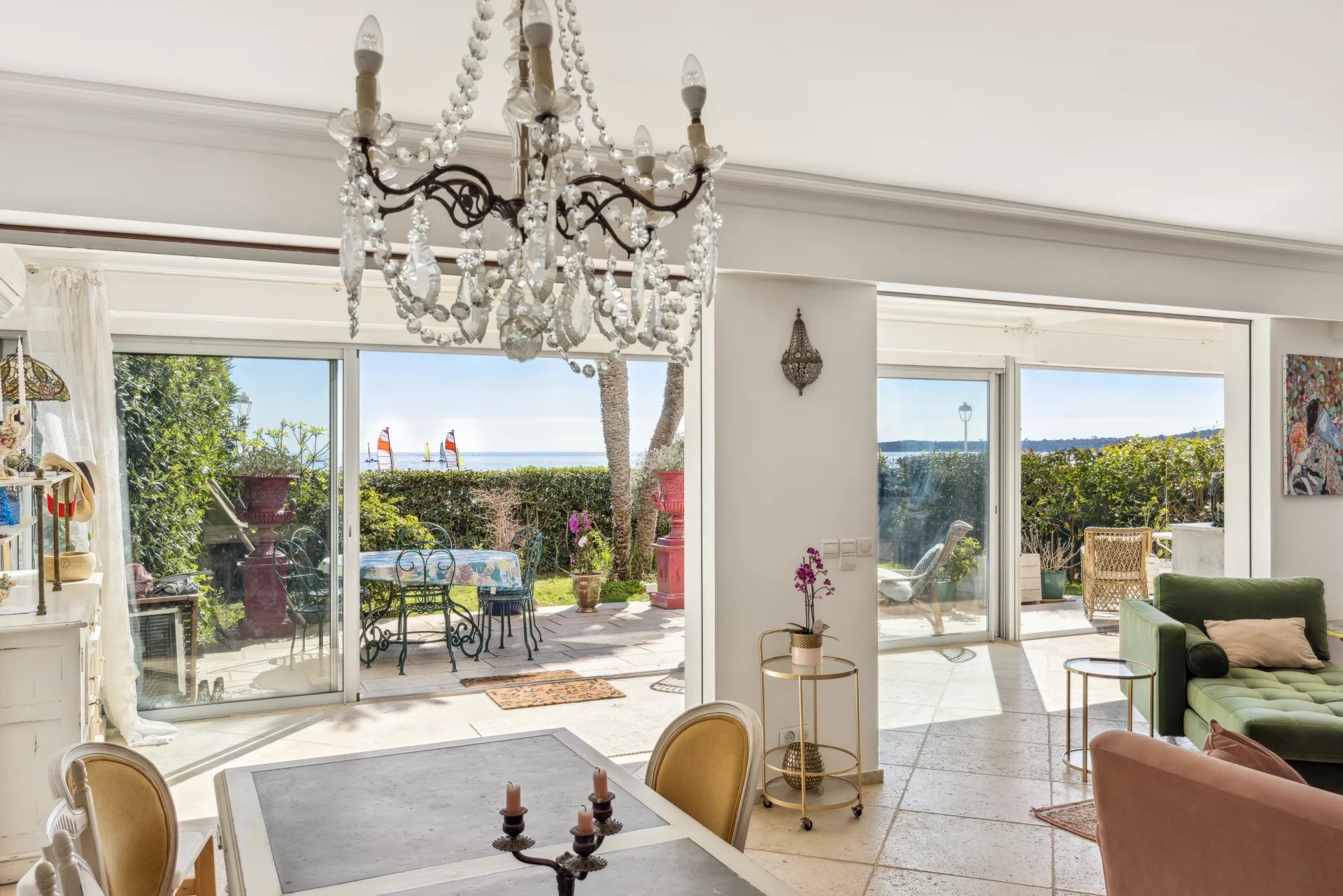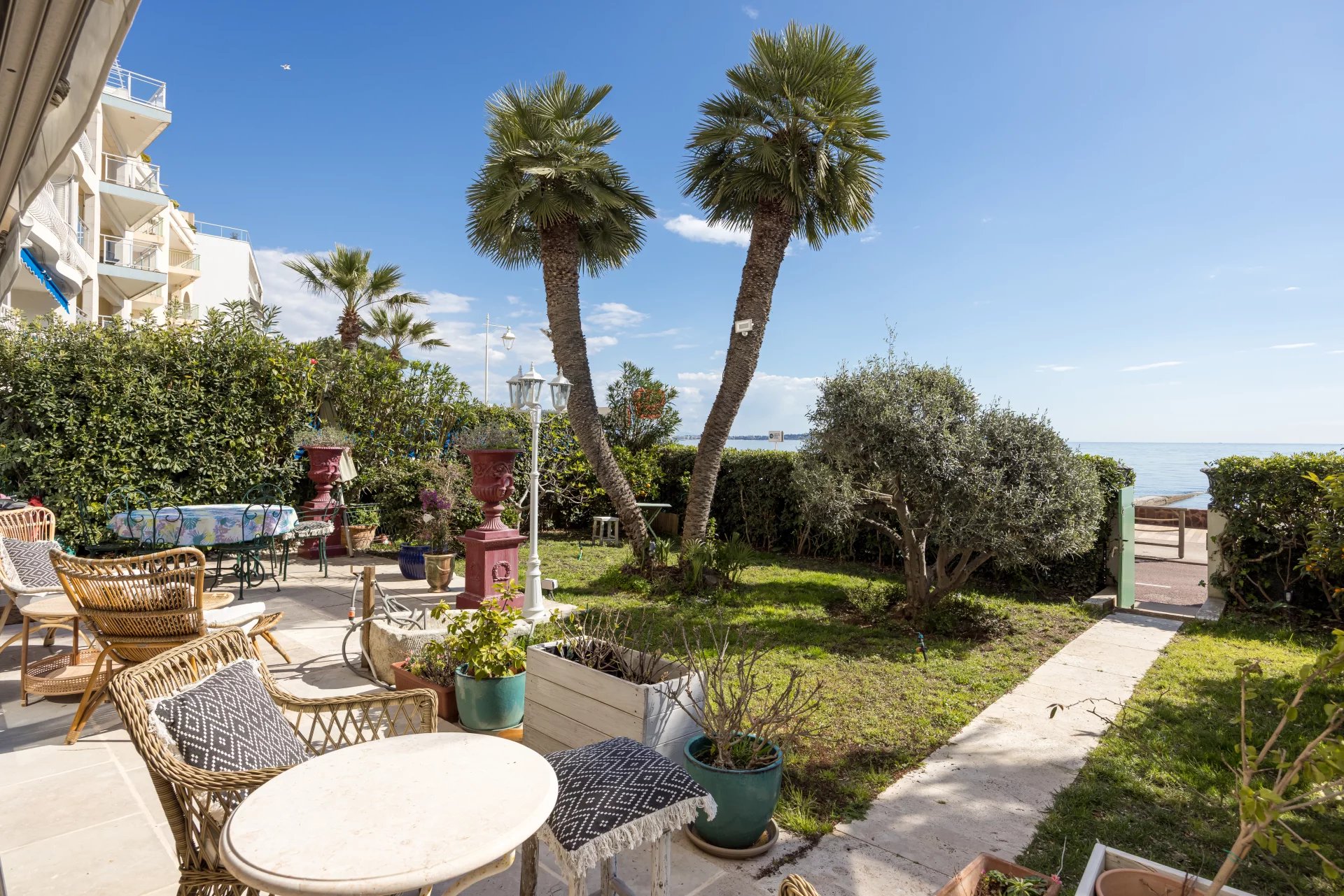 À l'extérieur, deux terrasses et un jardin d'environ 150 m² vous permettent de profiter pleinement du climat méditerranéen, apportant une atmosphère de maison à cet appartement. Imaginez-vous savourant un café le matin ou un apéritif en soirée, tout en admirant la vue imprenable sur la mer et sur les îles de Lérins.