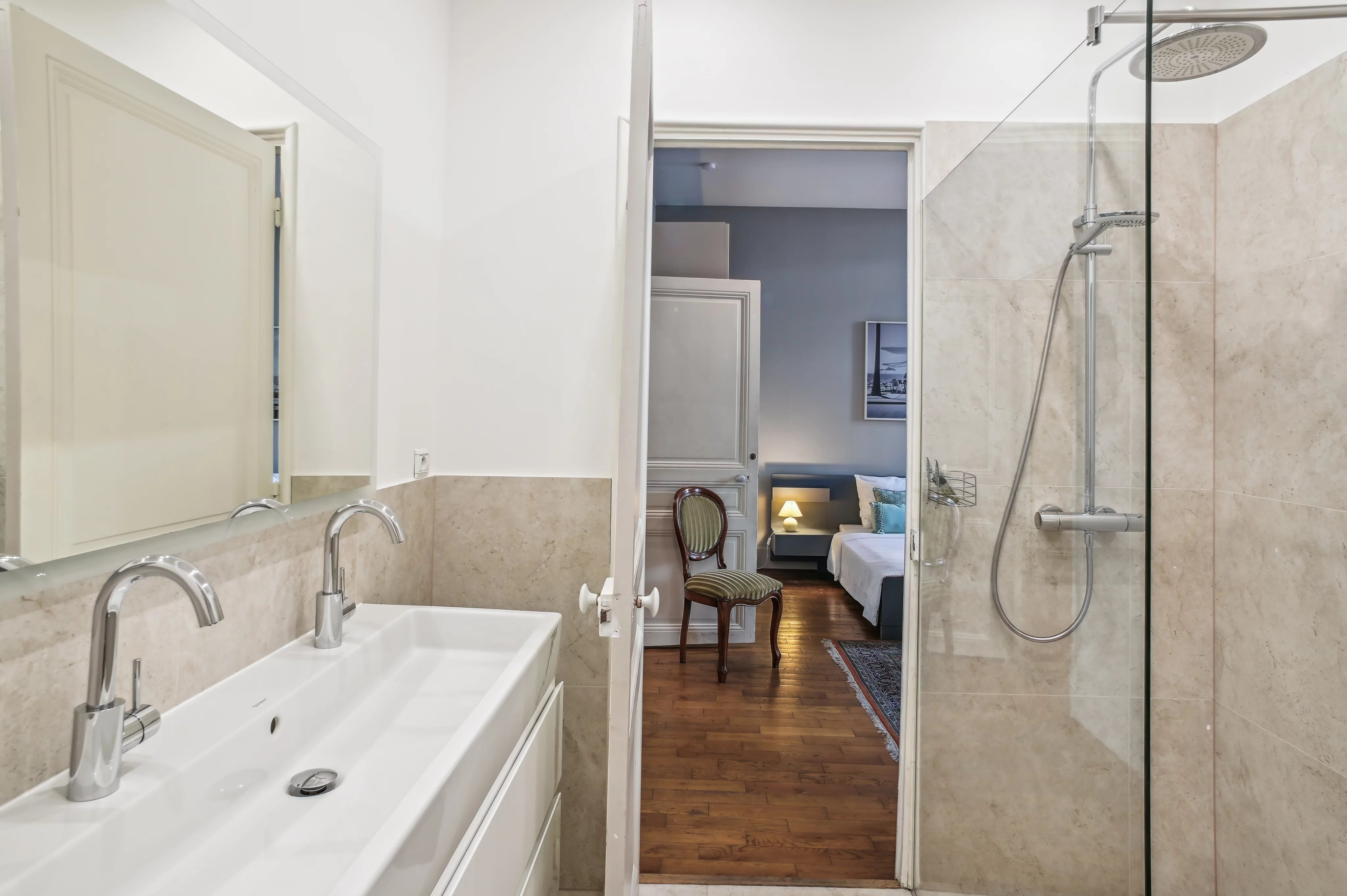 L’appartement comprend deux chambres en suite, dont une suite parentale avec dressing et vue mer, ainsi que deux chambres supplémentaires avec coin douche, un bureau et deux toilettes indépendantes.