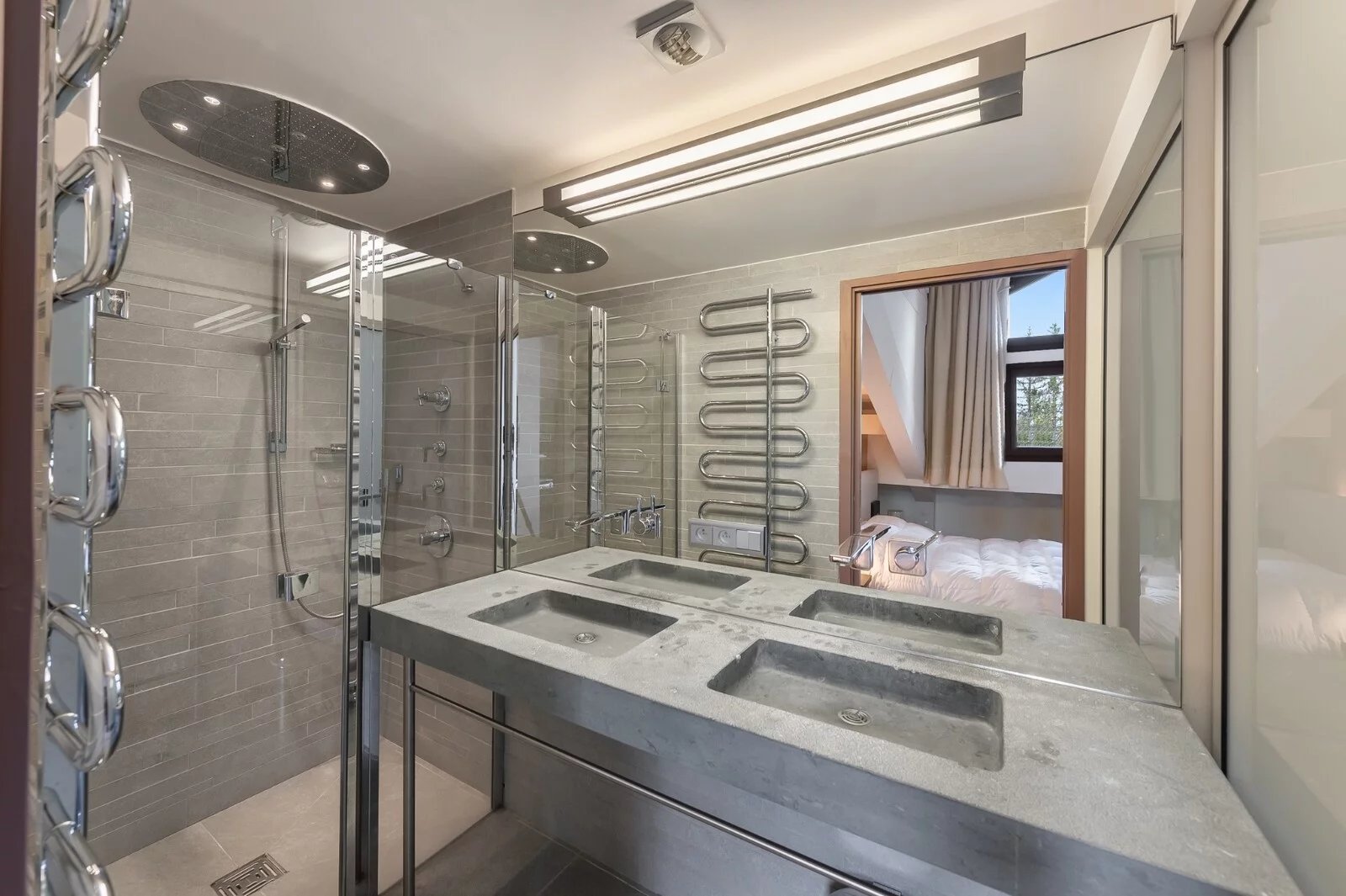 Il se compose d'une belle et lumineuse pièce de vie avec cheminée et d'une cuisine équipée ouverte sur un espace salle à manger. Vous apprécierez les expositions Sud et Ouest grâce aux deux balcons / terrasses. L'appartement dispose de deux belles chambres en suite dont une avec douche et baignoire.
