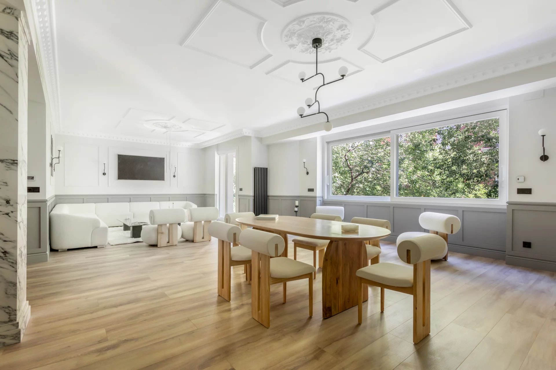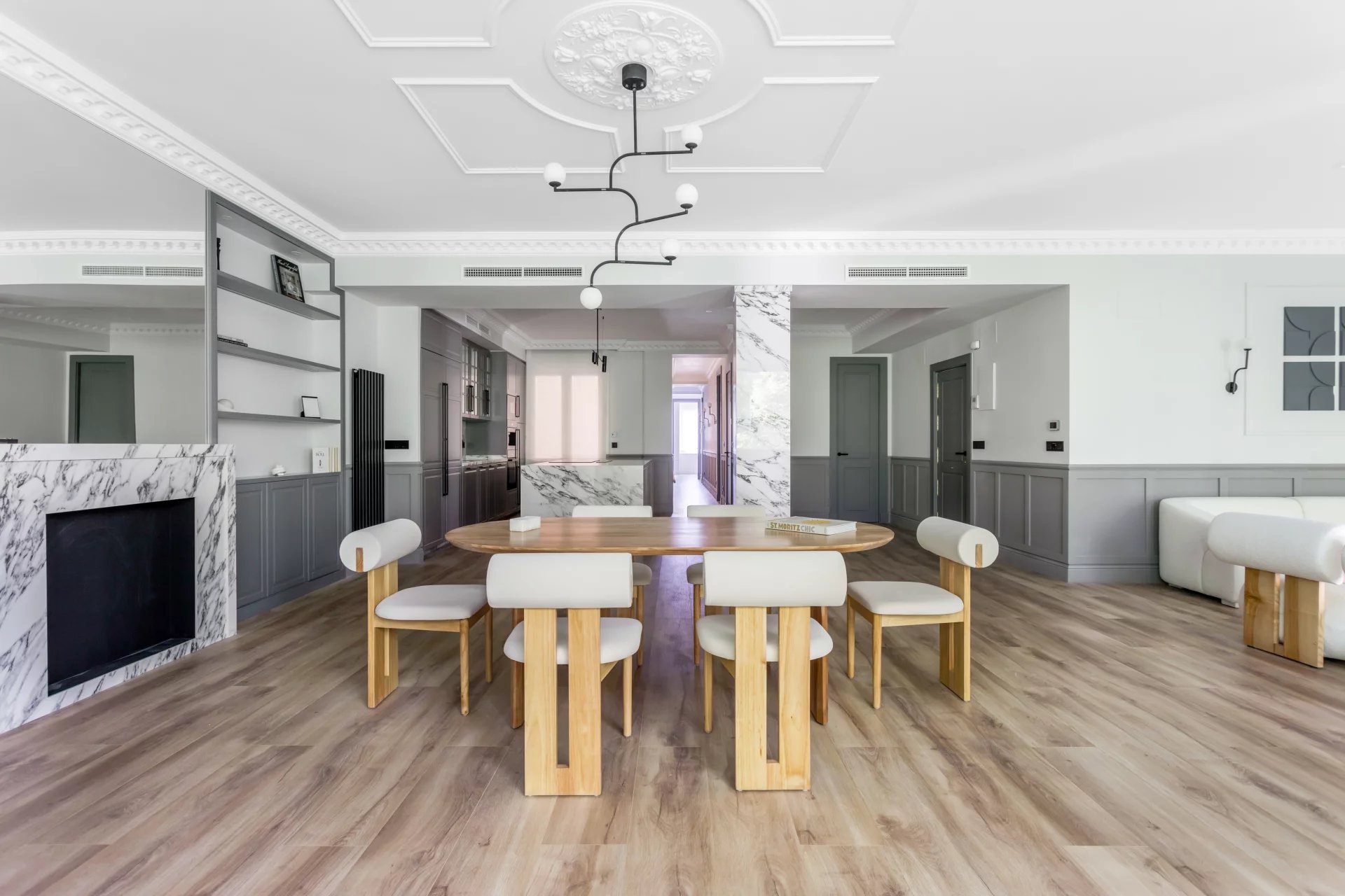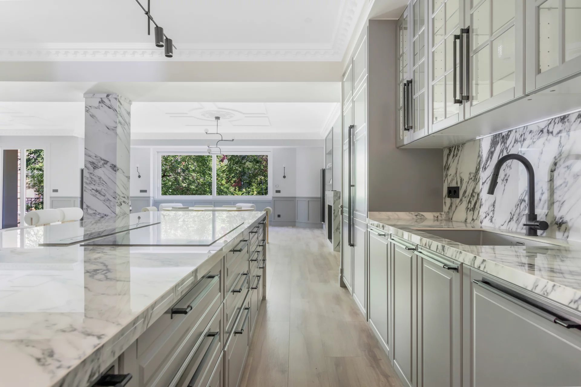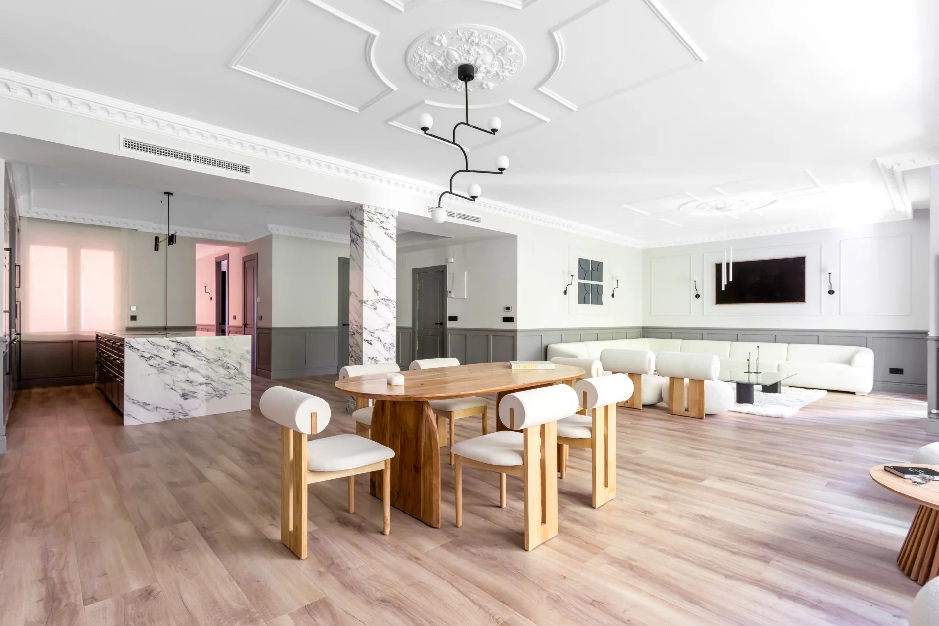 Le grand salon-salle à manger, avec plusieurs pièces, bénéficie d'une agréable lumière naturelle grâce à ses grandes fenêtres. Ouverte sur le salon, la cuisine spacieuse, avec son grand îlot central, est équipée d'appareils électroménagers haut de gamme.