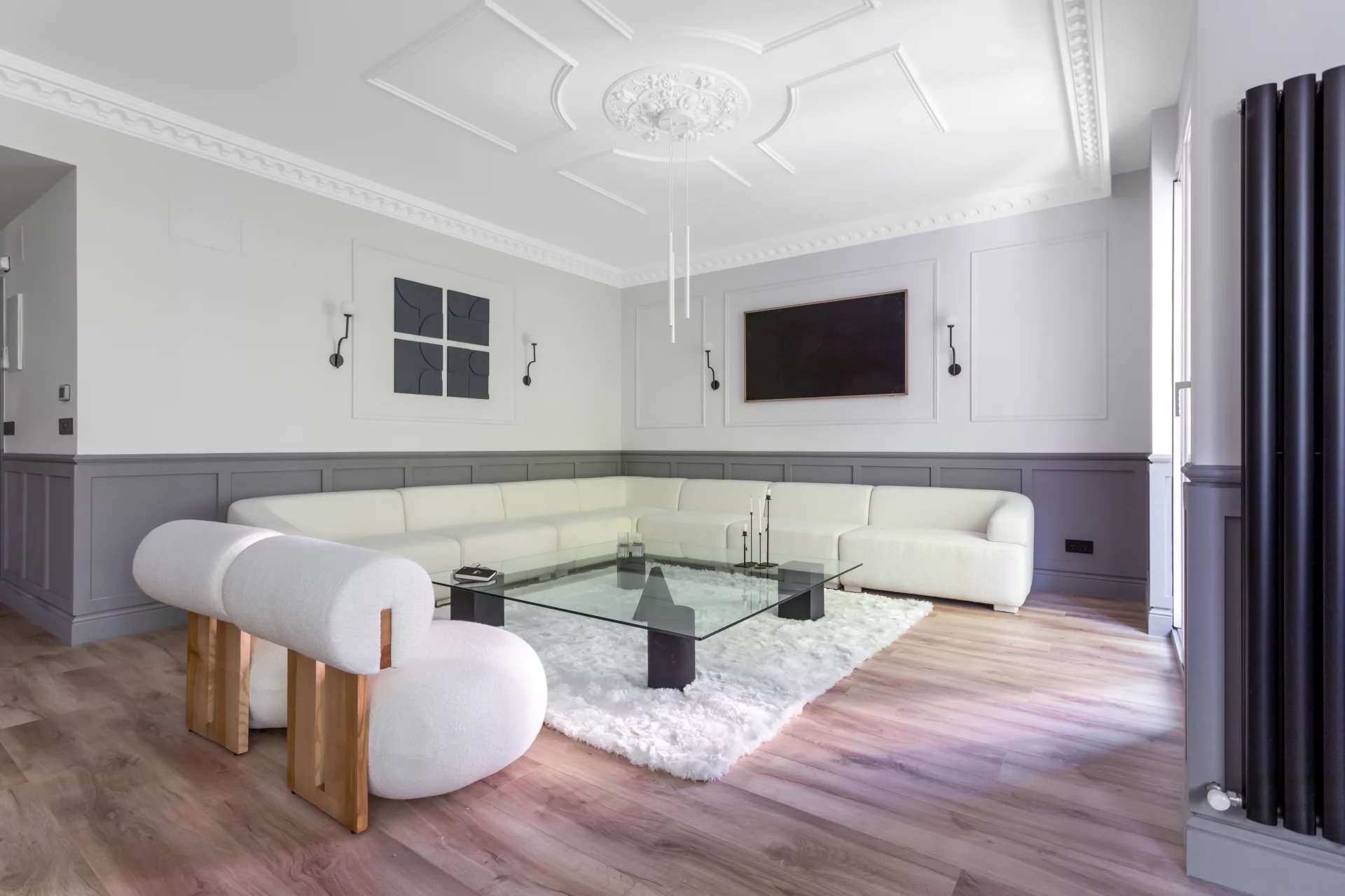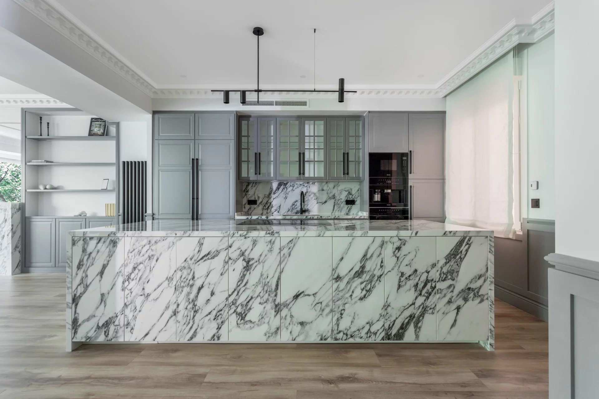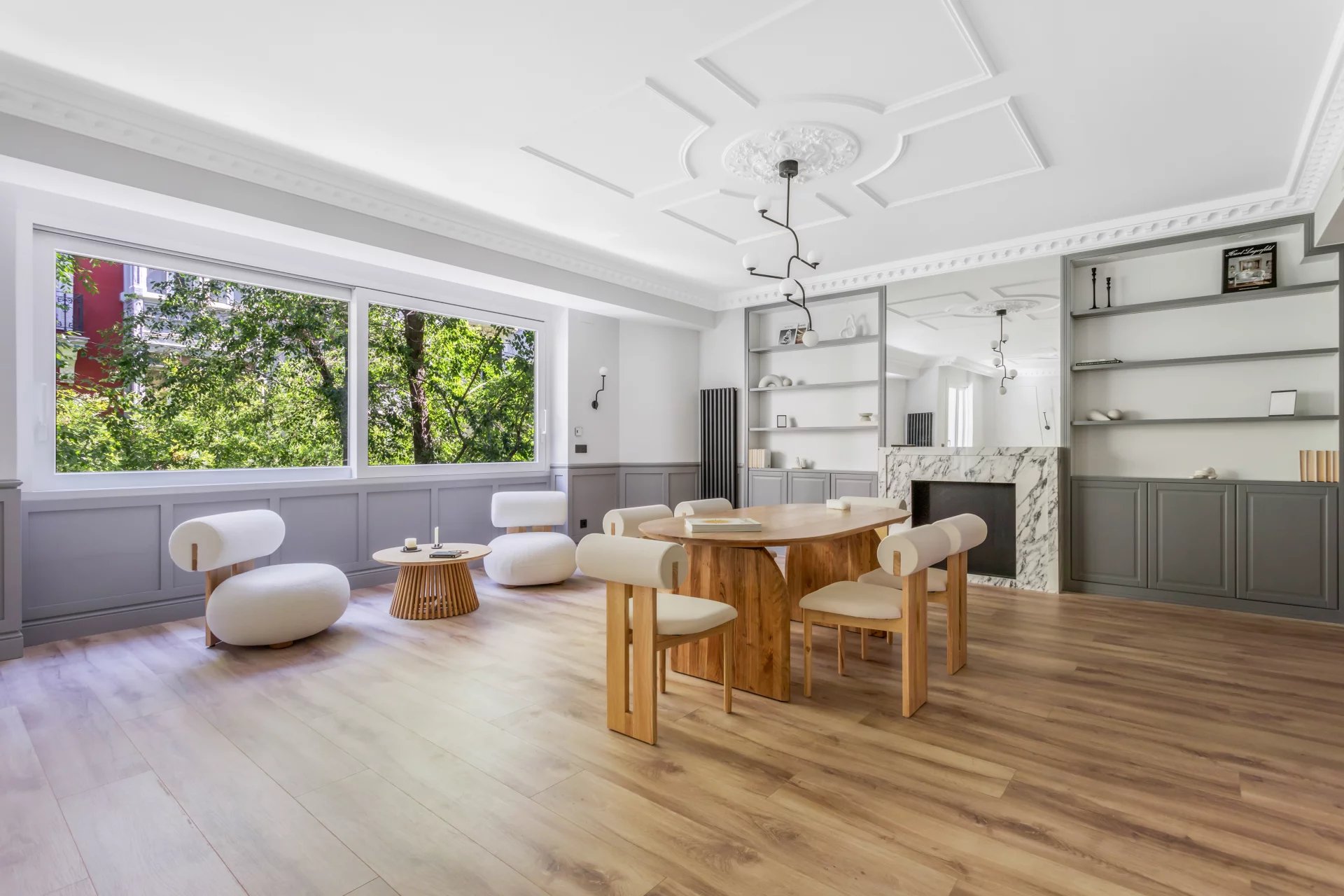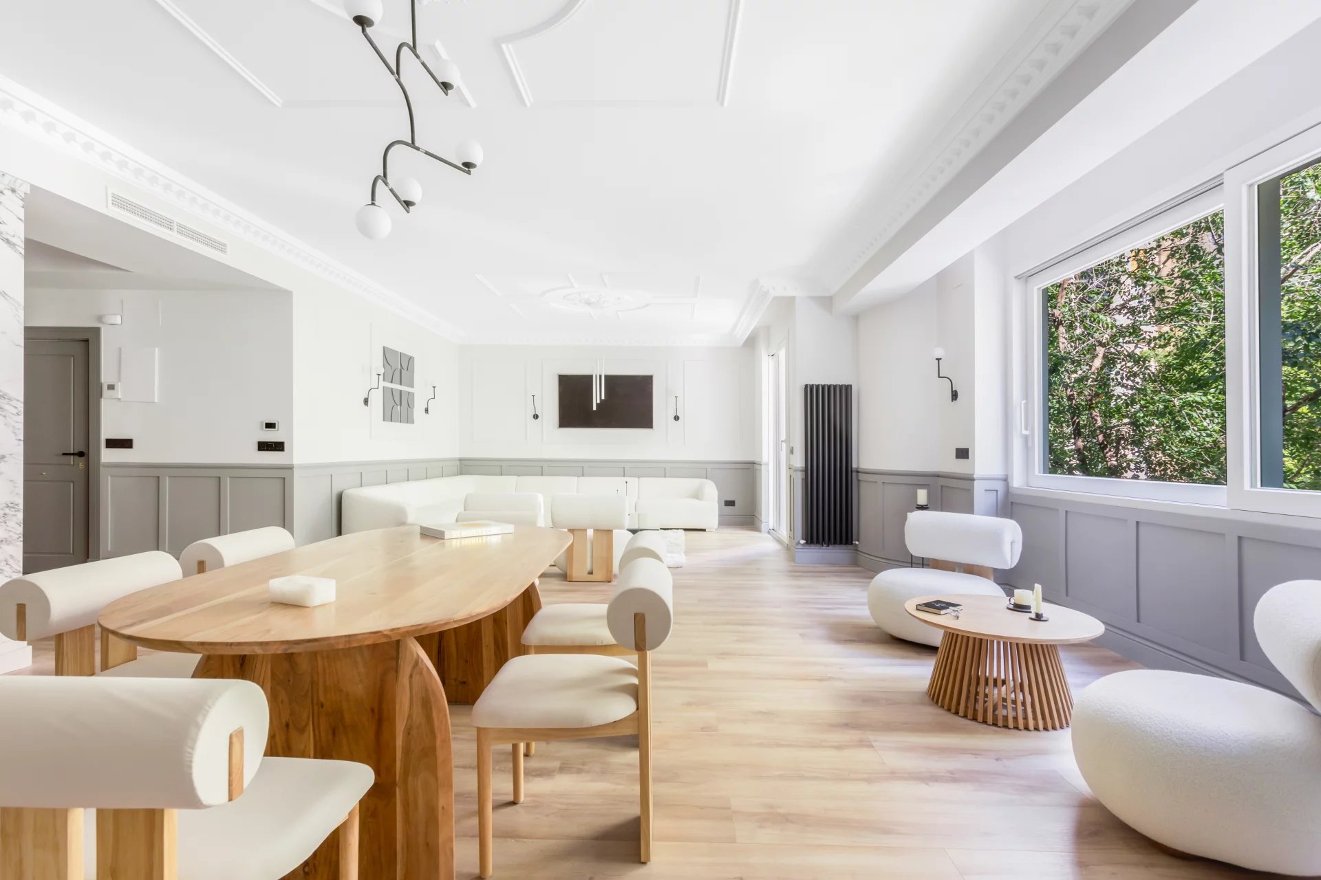 Le grand salon-salle à manger, avec plusieurs pièces, bénéficie d'une agréable lumière naturelle grâce à ses grandes fenêtres. Ouverte sur le salon, la cuisine spacieuse, avec son grand îlot central, est équipée d'appareils électroménagers haut de gamme.