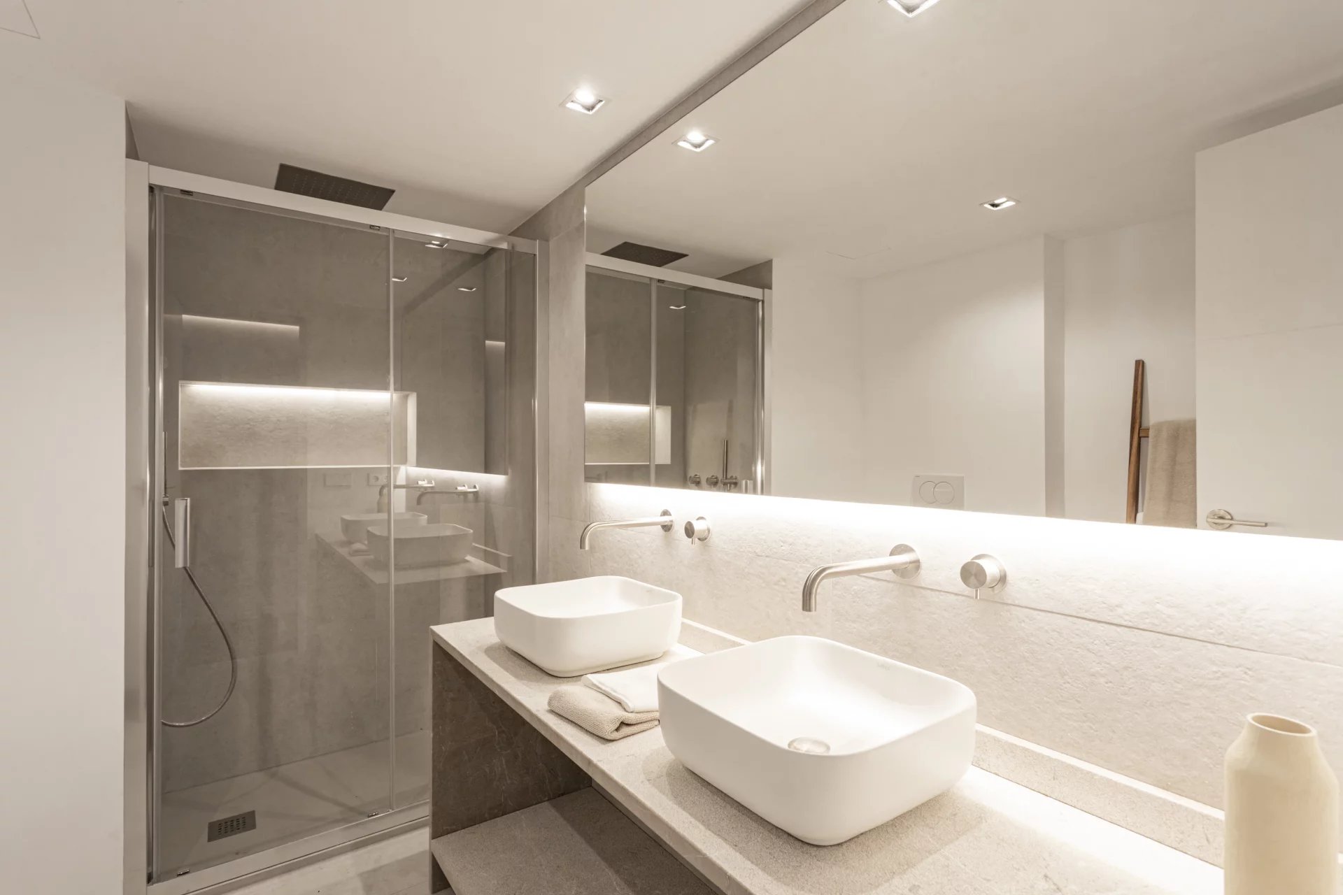 L'appartement dispose de deux chambres spacieuses, dont une avec dressing et salle de bains en suite, offrant un espace élégant et confortable. Il est également possible de créer une troisième chambre en profitant de l'espace à côté des toilettes pour invités, ce qui ajoute encore plus de valeur à cette propriété. L'agencement a été soigneusement conçu pour maximiser chaque mètre carré : il y a deux salles de bains complètes, une buanderie séparée pratique et des toilettes pour les invités, le tout avec des finitions de haute qualité et des détails modernes. Avec de hauts plafonds, une décoration exquise et des matériaux sélectionnés avec goût, cette propriété est entièrement meublée et prête à être emménagée.