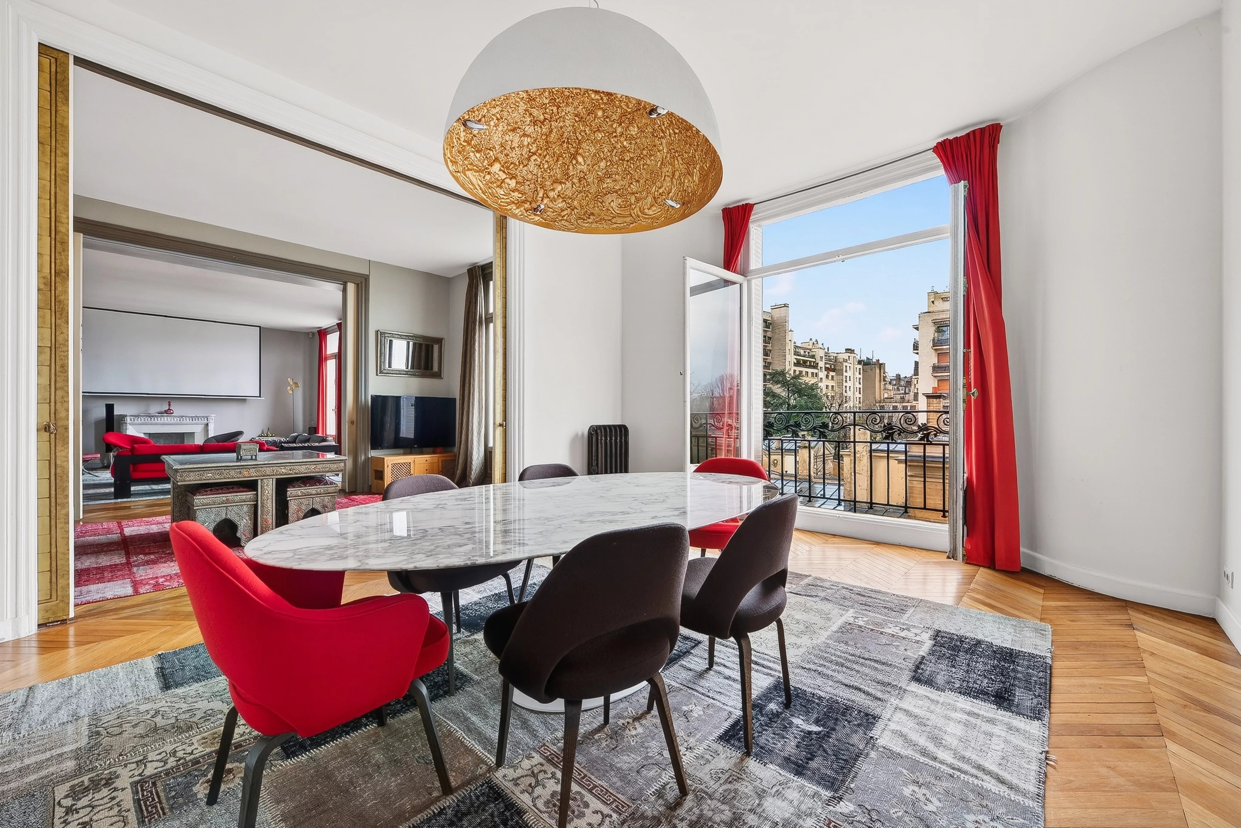 - Une triple réception de 83,31 m² dévoile trois espaces de vie aux volumes généreux (3,30 m de hauteur sous plafond) : deux salons et une salle à manger, ouverts et communicants, sans aucun vis-à-vis, offrant un cadre idéal pour recevoir.