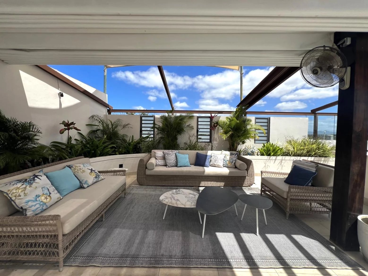 Ces espaces sont conçus pour recevoir facilement, avec un bar et un plan de travail en matériaux résistants aux intempéries, ainsi que des auvents rétractables.