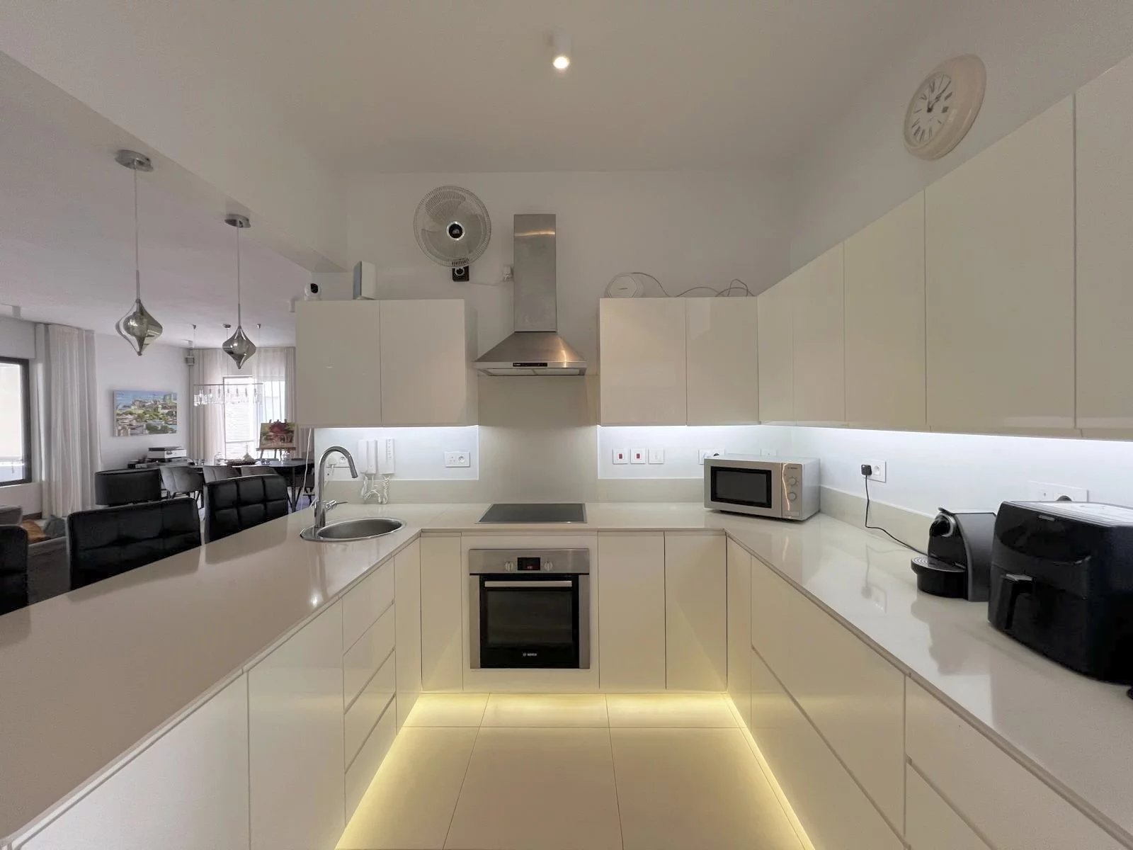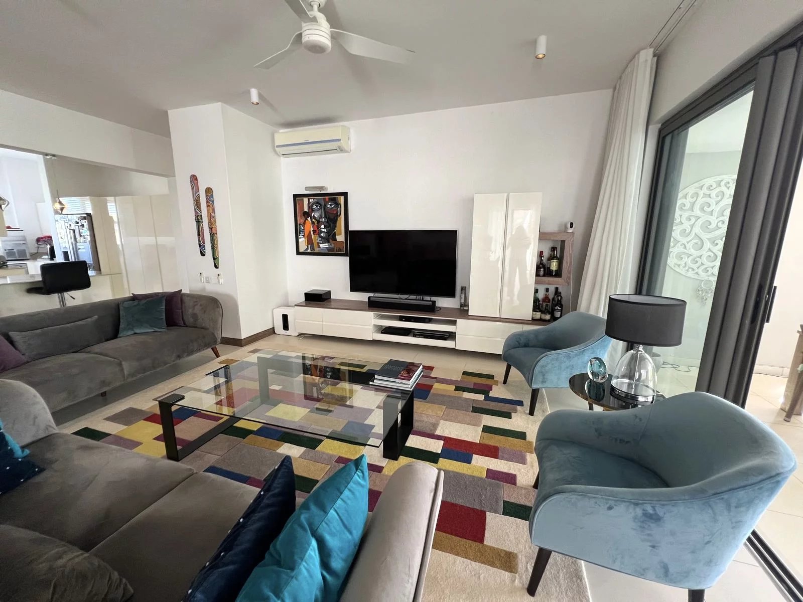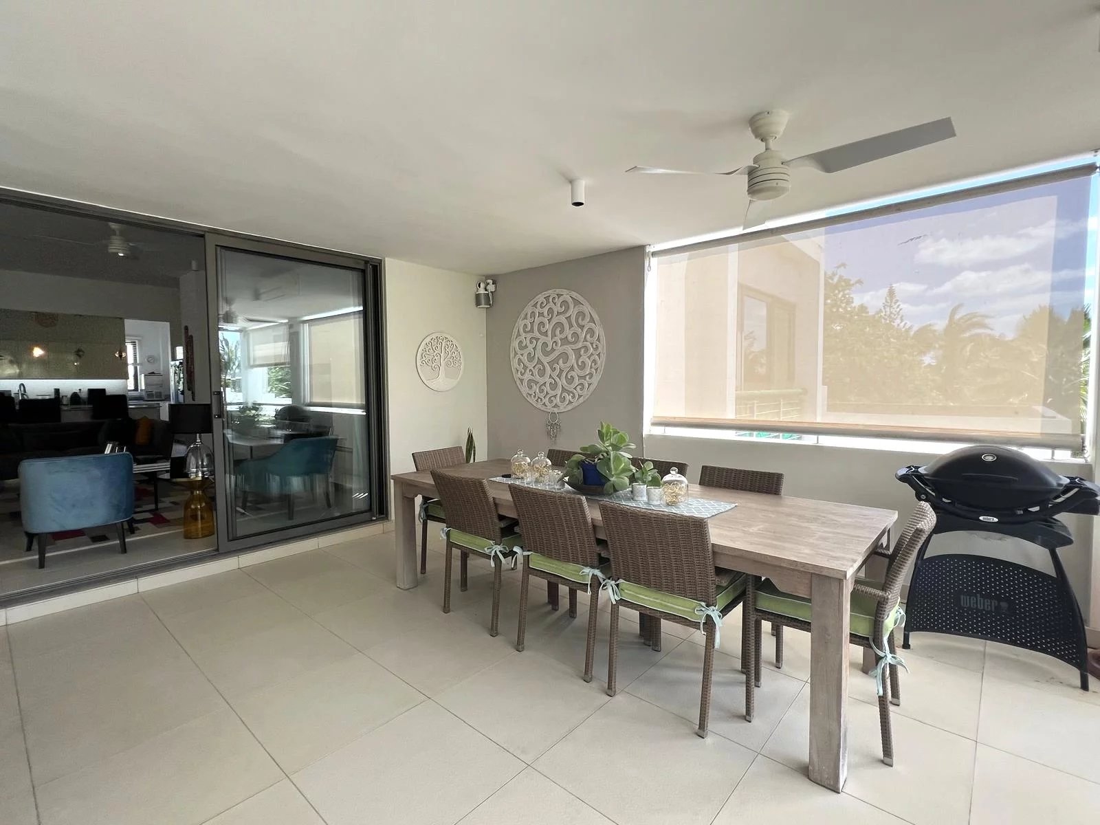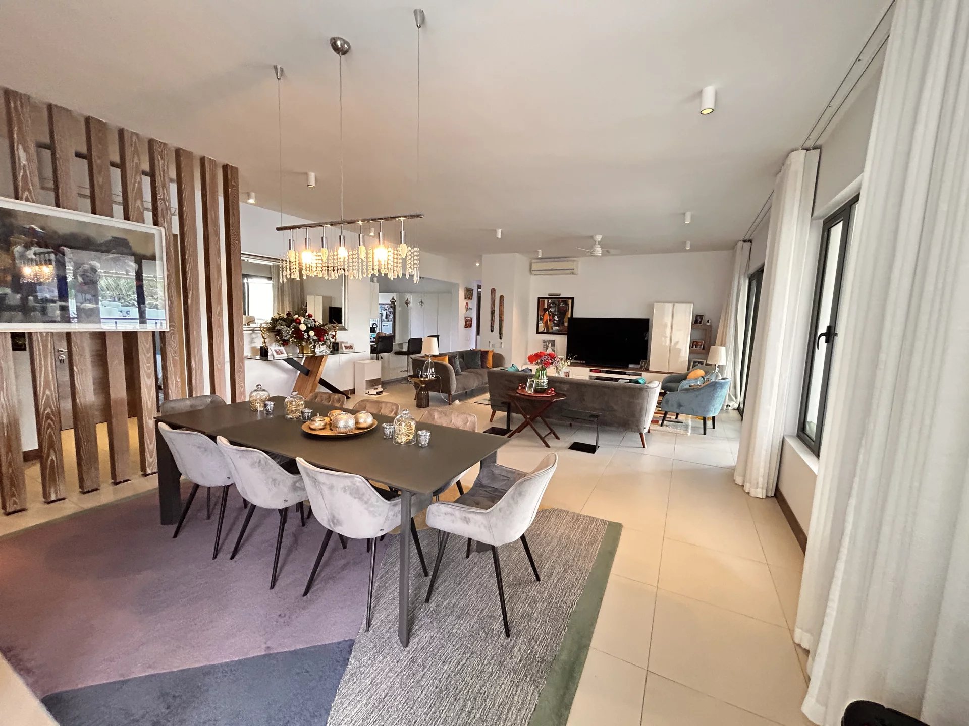 L'espace de vie ouvert, comprenant le salon, la salle à manger et la cuisine, est parfait pour recevoir ou se détendre, avec l'air conditionné dans chaque pièce pour un confort optimal tout au long de l'année.