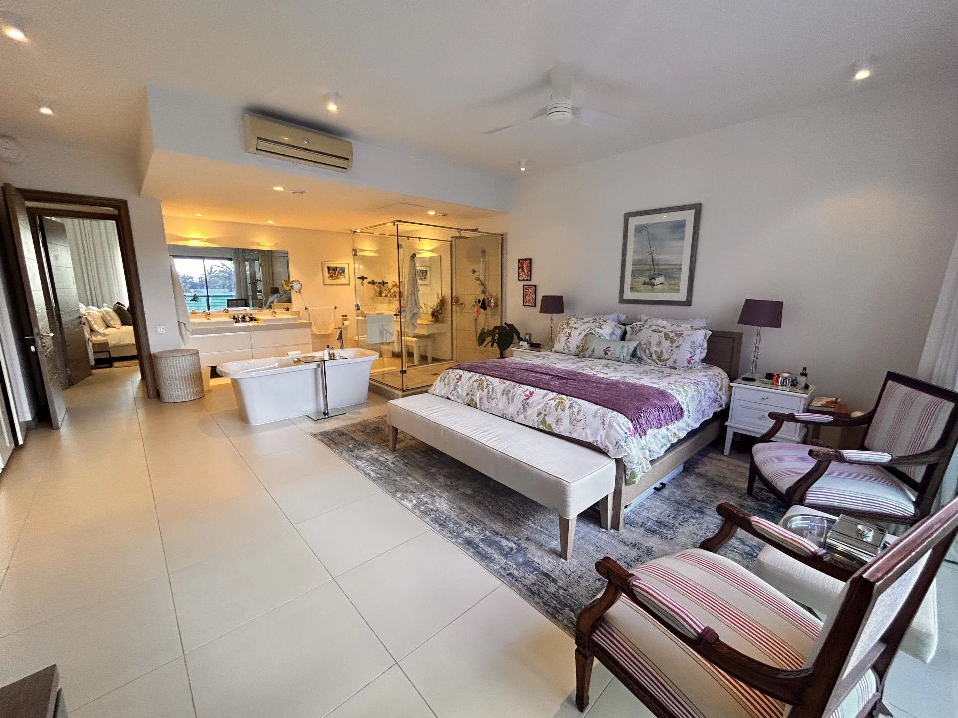 Entrez dans une maison qui respire la sophistication. La propriété dispose de trois chambres spacieuses, chacune avec sa propre salle de bain, ce qui garantit une intimité totale. La suite est un véritable sanctuaire, avec un plan ouvert, des