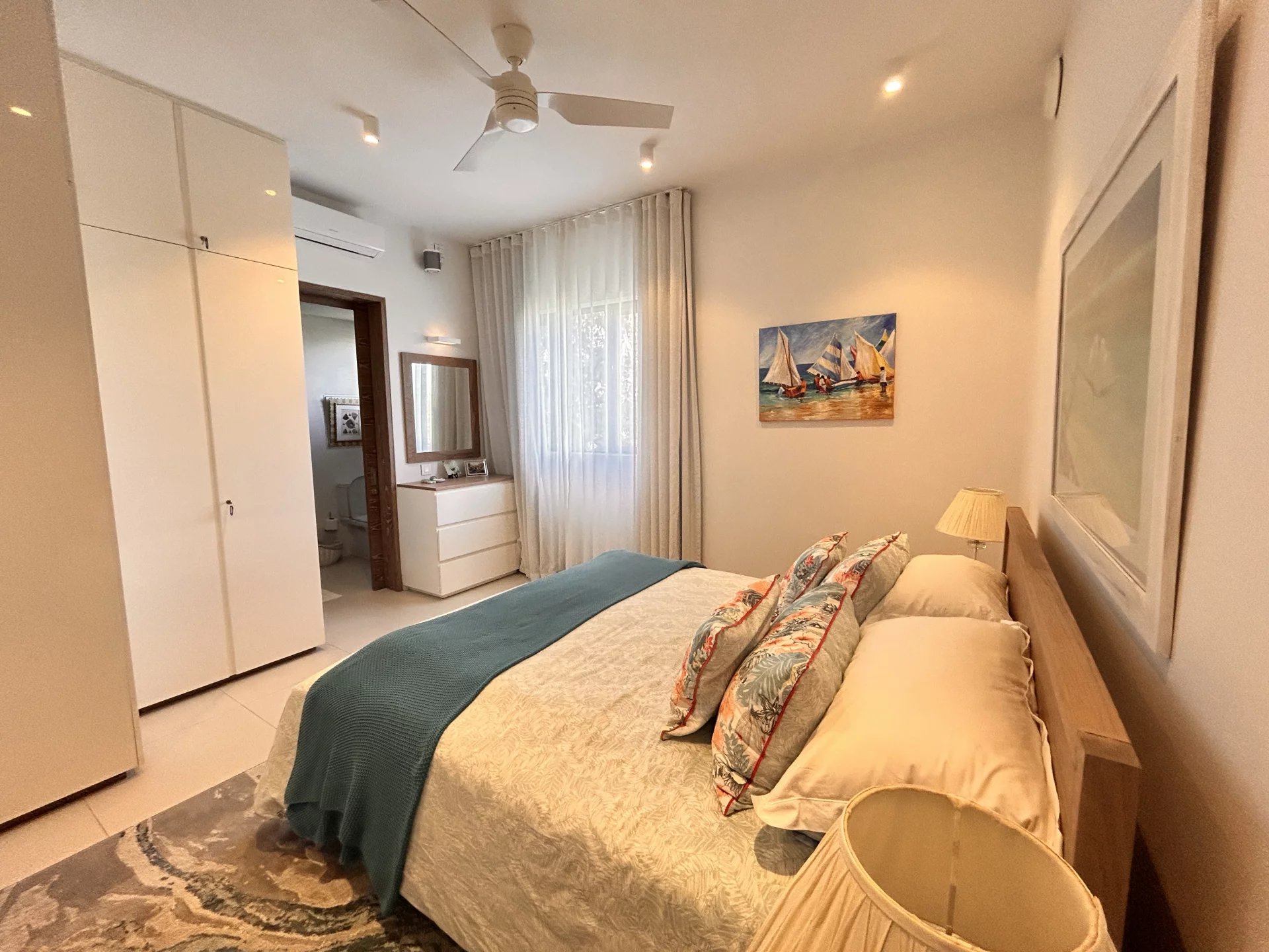 de rangement et d'une ambiance apaisante. Des toilettes pour les invités ajoutent une commodité supplémentaire pour les réceptions.