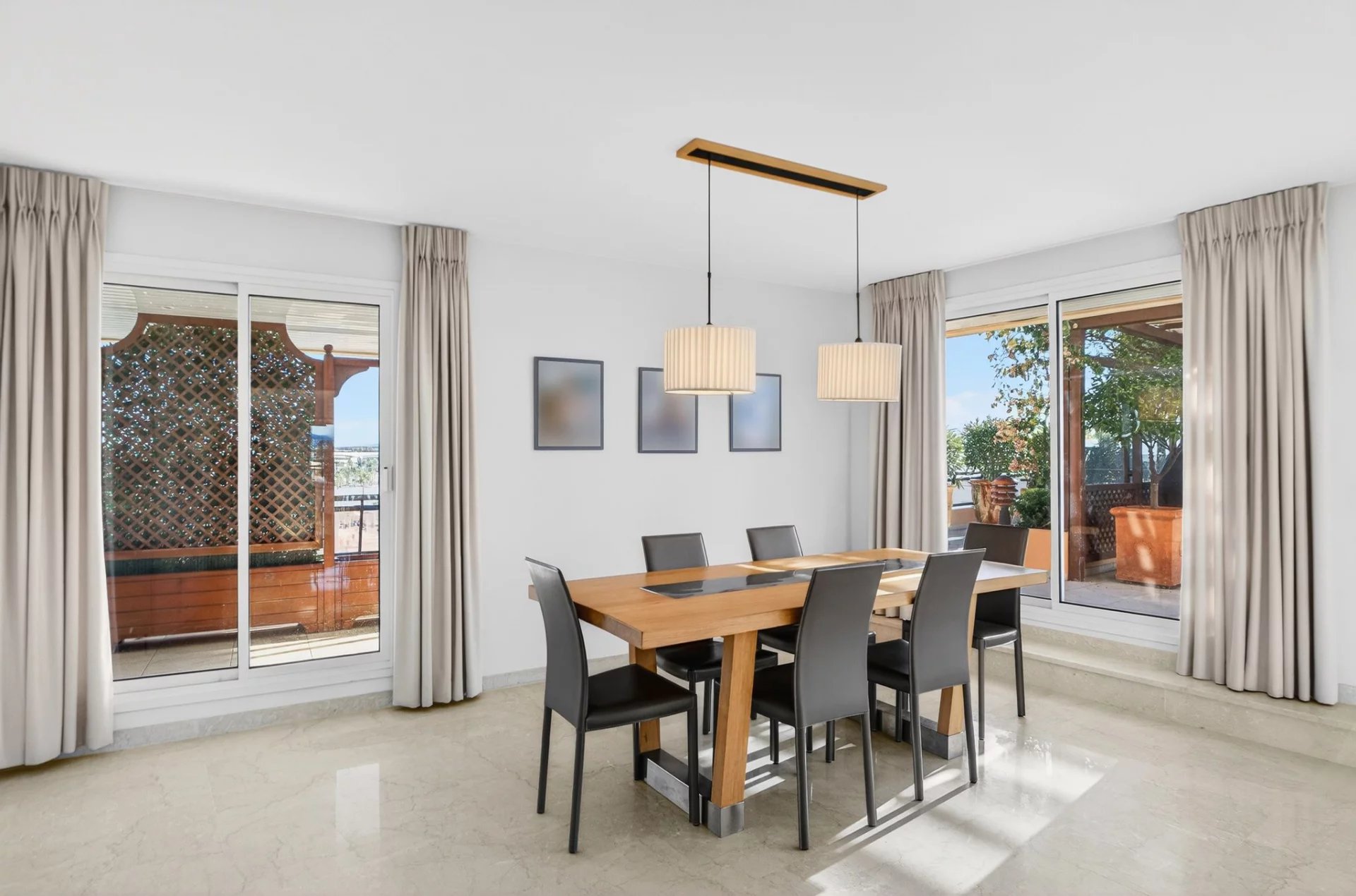 L’espace de réception se compose d’un séjour lumineux, d’une salle à manger élégante et d’une cuisine entièrement équipée, tous ouverts sur les terrasses pour profiter pleinement de l’extérieur.