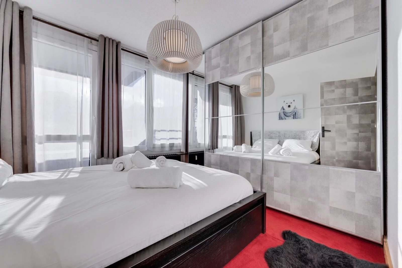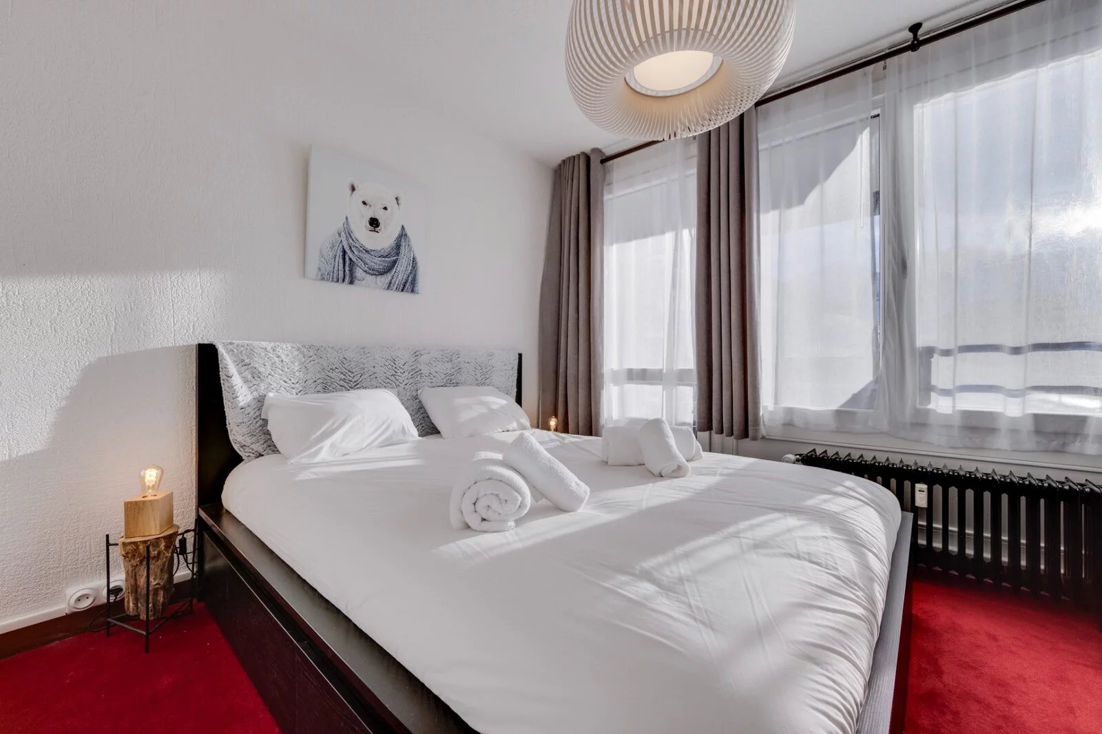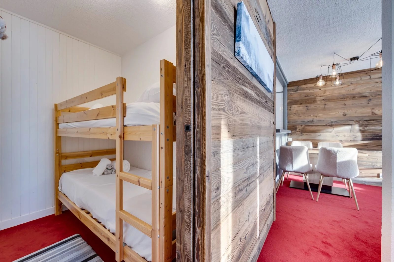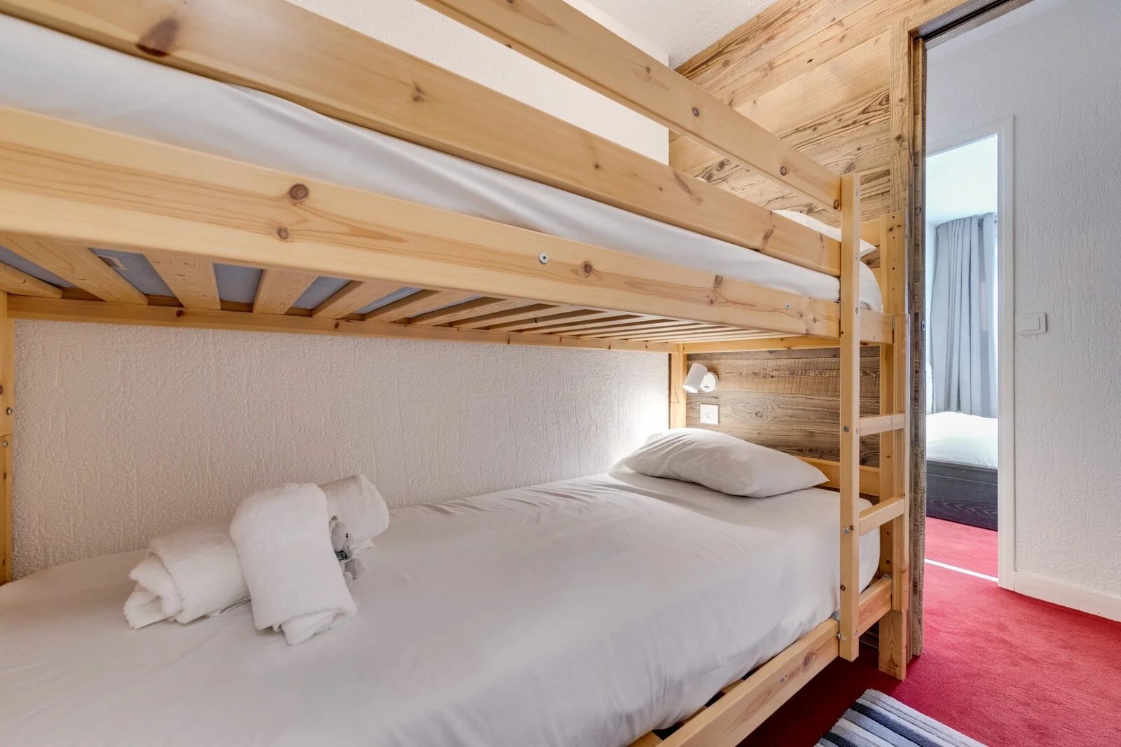 L'appartement comprend un hall d'entrée qui vous mène à la cuisine ouverte sur la pièce de vie donnant sur un balcon. Une chambre double disposant de son accès au balcon, un coin montagne équipé de lits superposés, une salle de douche et un wc séparé.