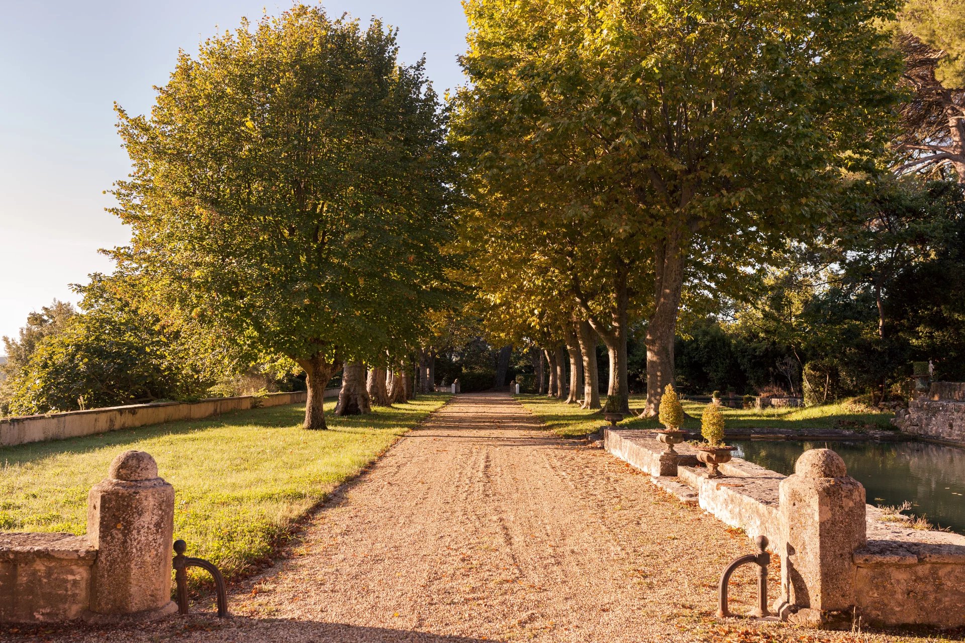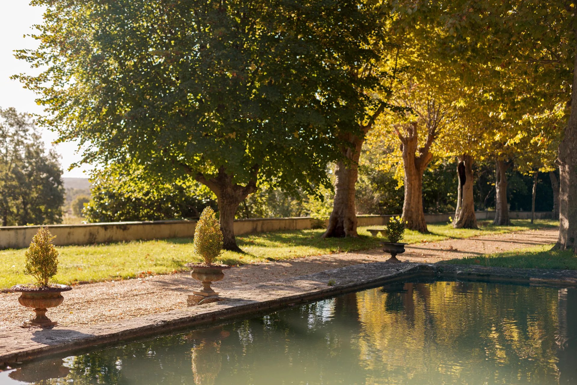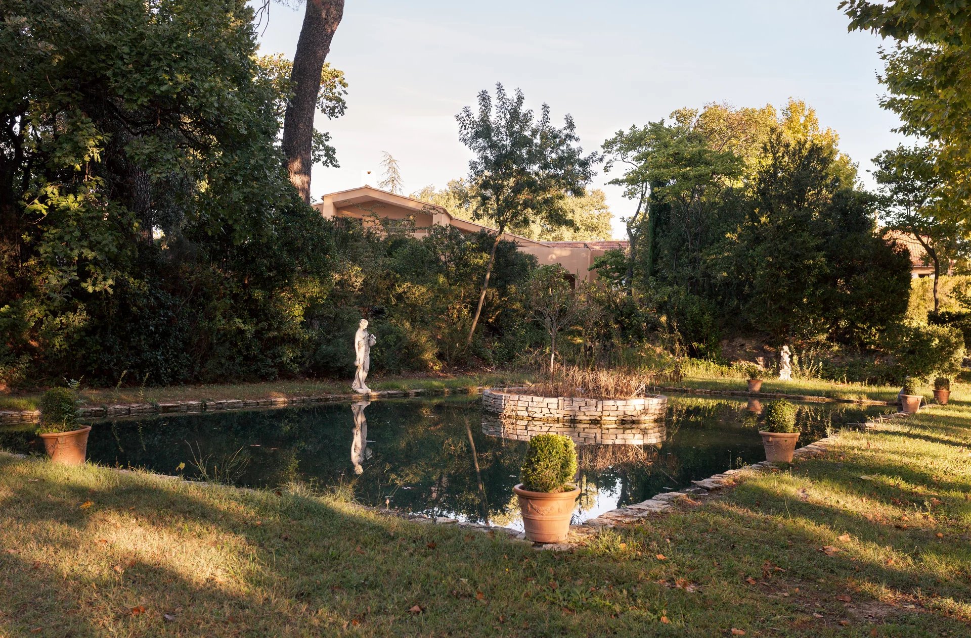 Le domaine s’étend sur un magnifique parc paysager, véritable écrin de verdure, où se mêlent arbres centenaires, essences méditerranéennes et coins ombragés propices à la détente. Des bassins anciens et des fontaines en pierre ponctuent les allées, apportant fraîcheur et poésie à ce cadre enchanteur.