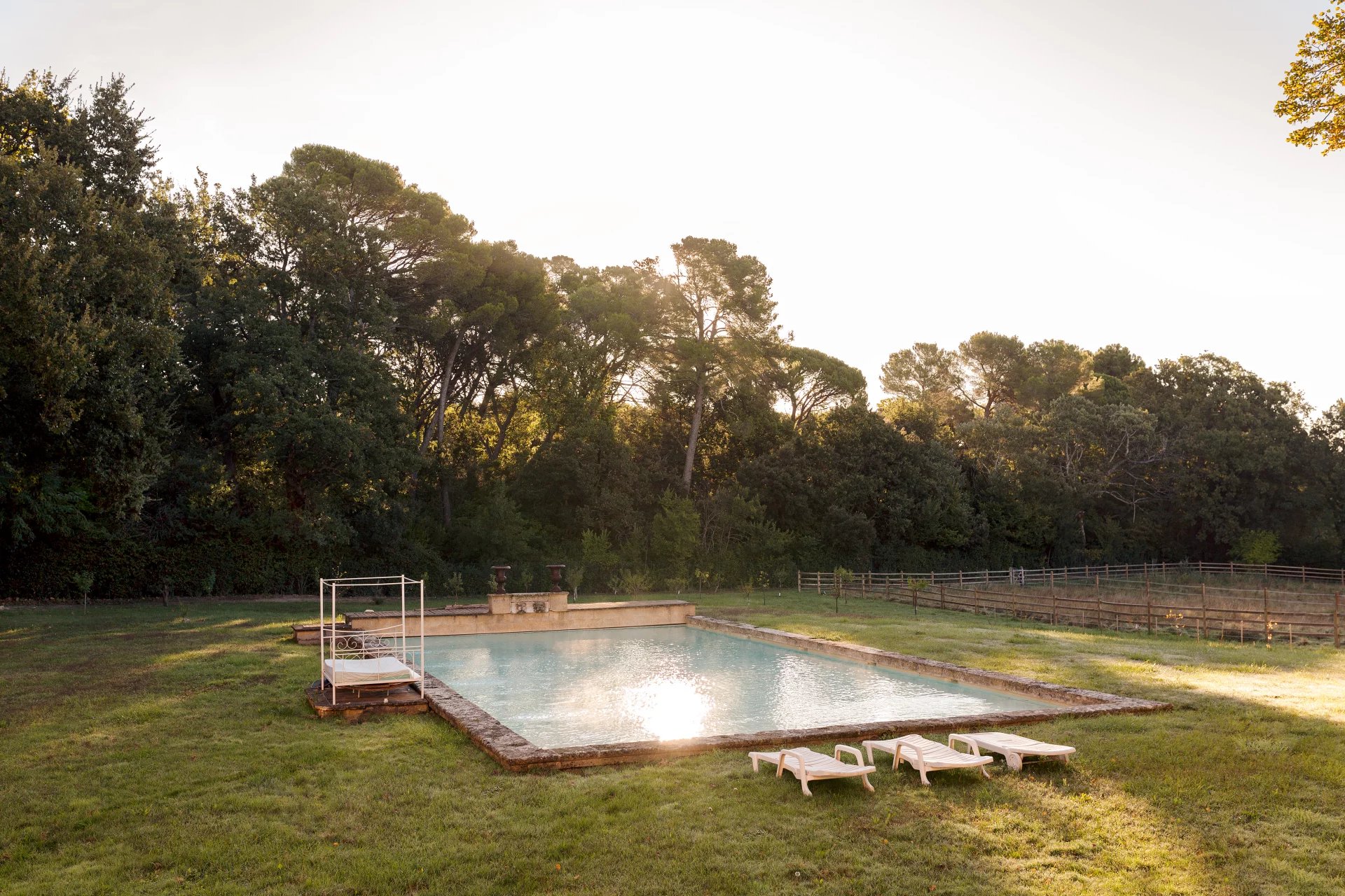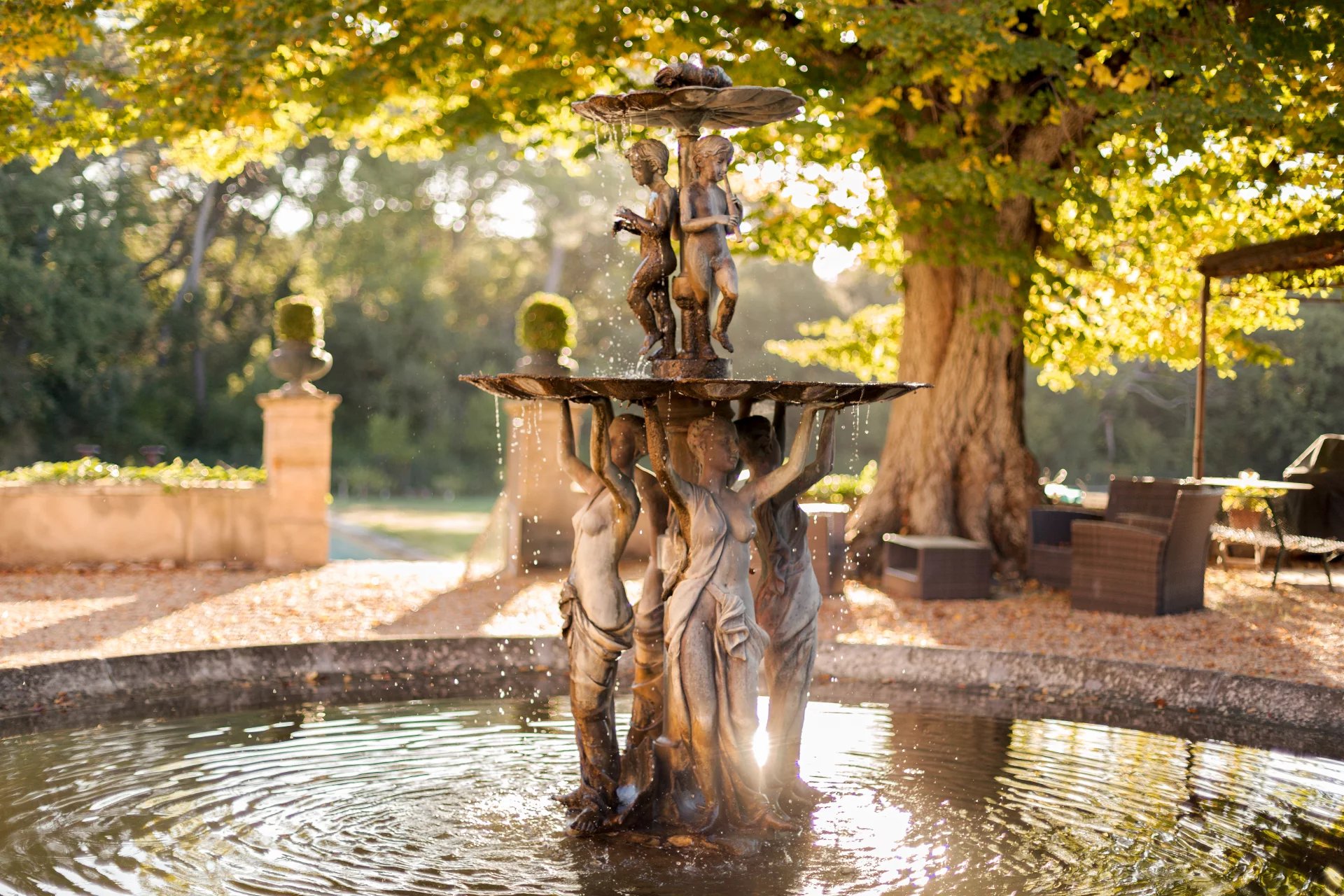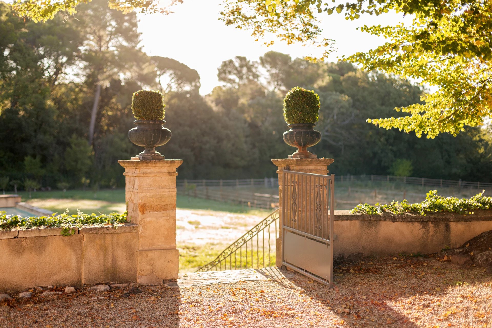 Le domaine s’étend sur un magnifique parc paysager, véritable écrin de verdure, où se mêlent arbres centenaires, essences méditerranéennes et coins ombragés propices à la détente. Des bassins anciens et des fontaines en pierre ponctuent les allées, apportant fraîcheur et poésie à ce cadre enchanteur.