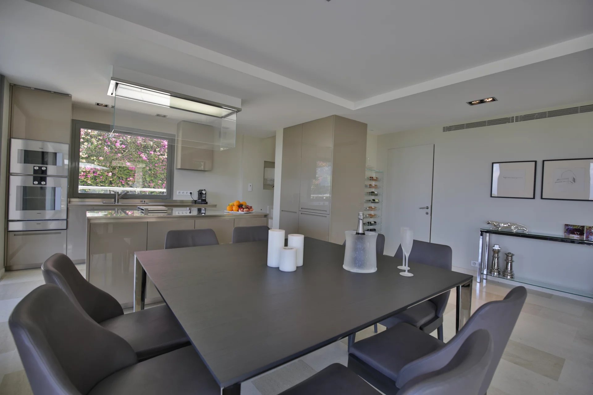 Au Cap d'Antibes, sur le versant ouest dans un domaine fermé et au calme, cette villa moderne bénéficie d'une très belle vue sur la baie de Juan-les-Pins.