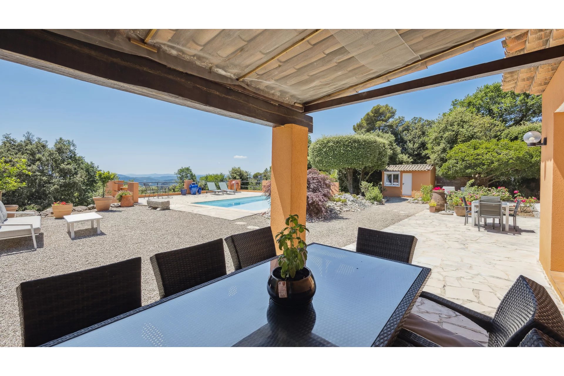 accueillant 3 chambres et deux salles de bains ainsi qu' un appartement annexe , le tout avec superbe piscine ( 8x4) sans vis à vis et la vue à l'infini ... Le jardin qui l'entoure est complanté de jolis arbres , arbustes et fleurs, le garage accueille les véhicules éléctriques et une cabane les amateurs de yoga.Autres atouts: cuisine d'été, pool house et joli jardin arboré.