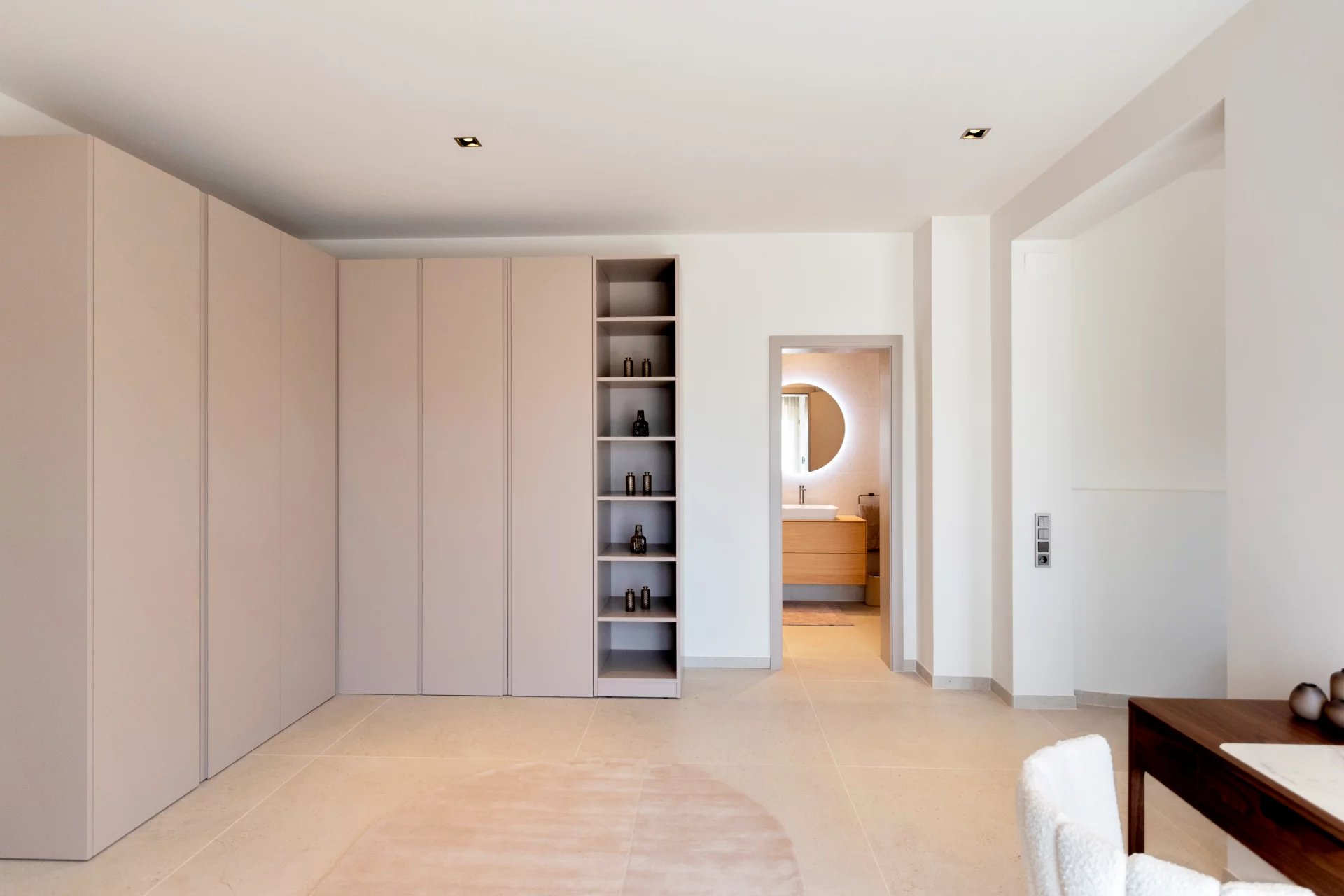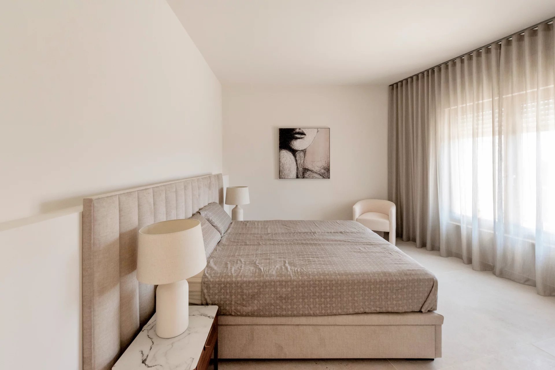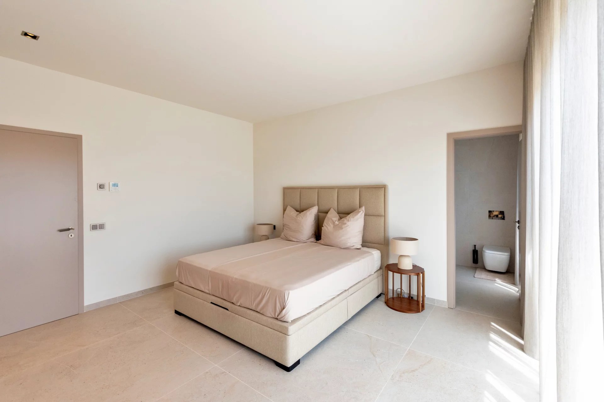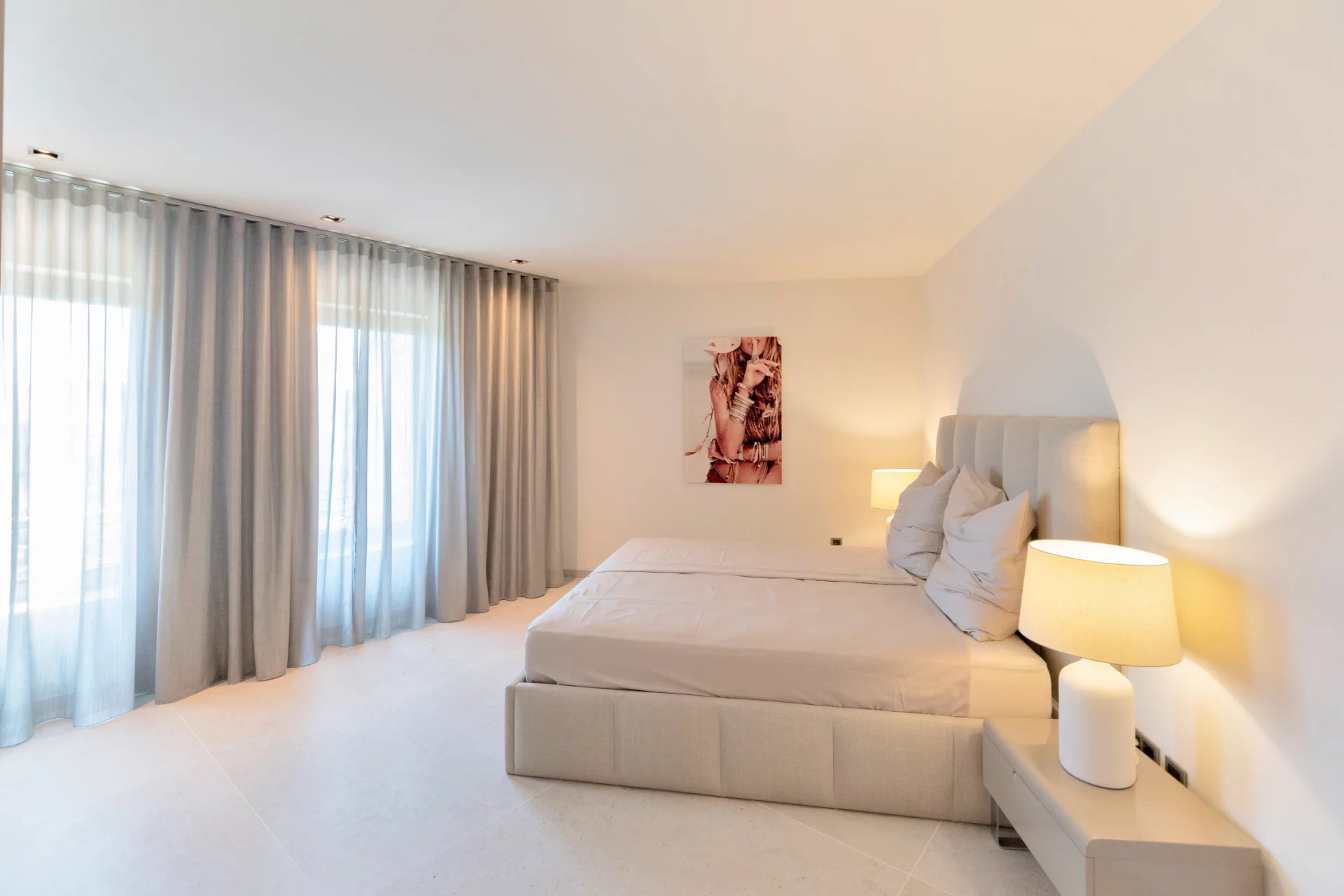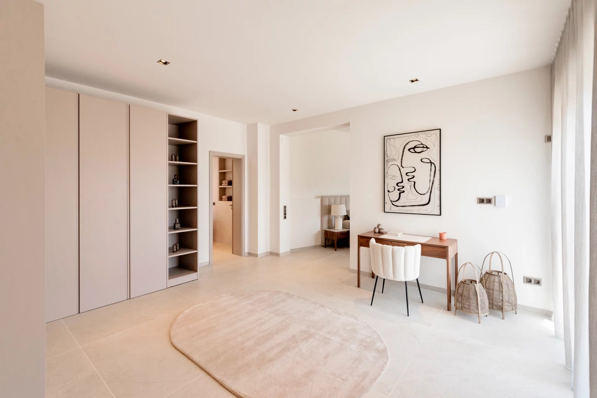 Au niveau supérieur, la villa dispose de quatre chambres spacieuses, toutes avec salle de bains attenante et dressing. Deux d'entre elles sont de vastes suites principales avec accès direct à des terrasses privées offrant des vues spectaculaires sur la ville d'Ibiza et la baie de Talamanca.