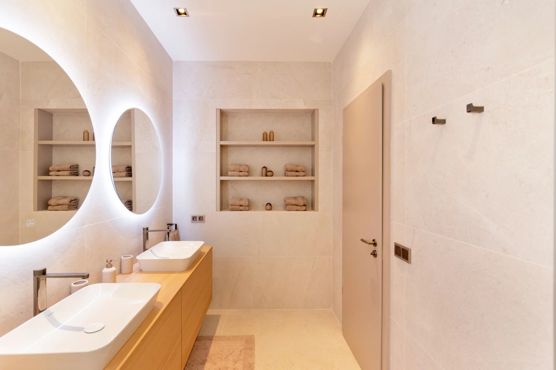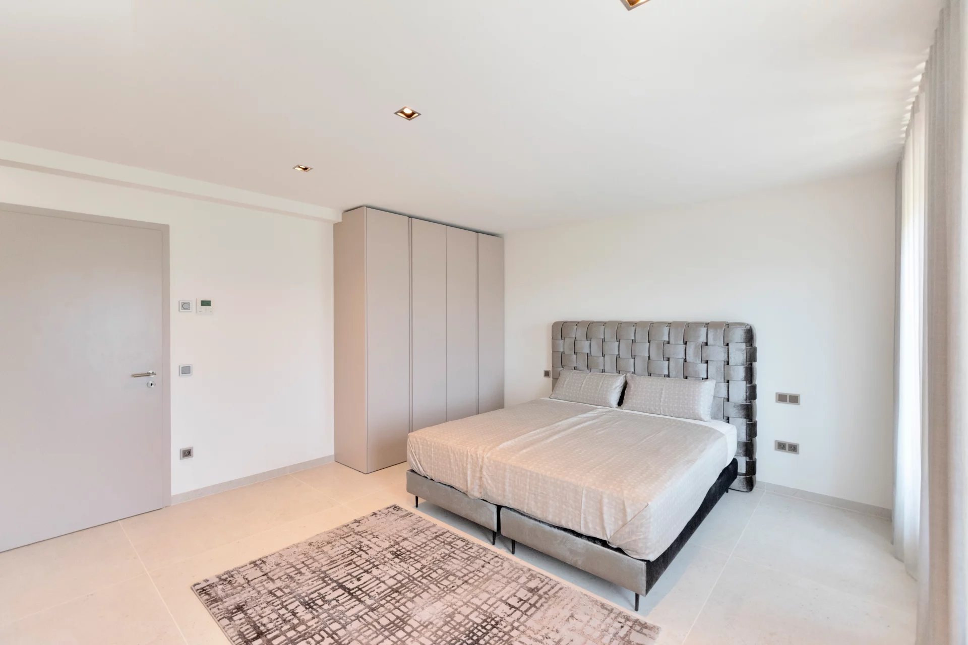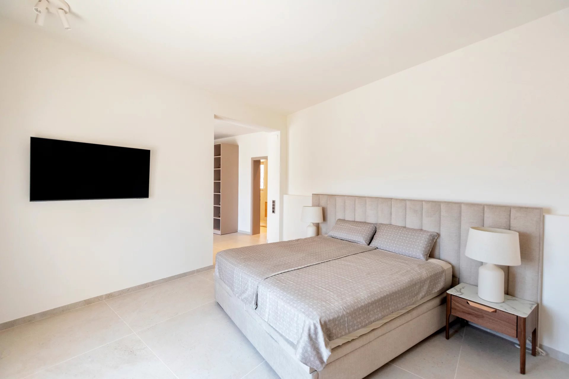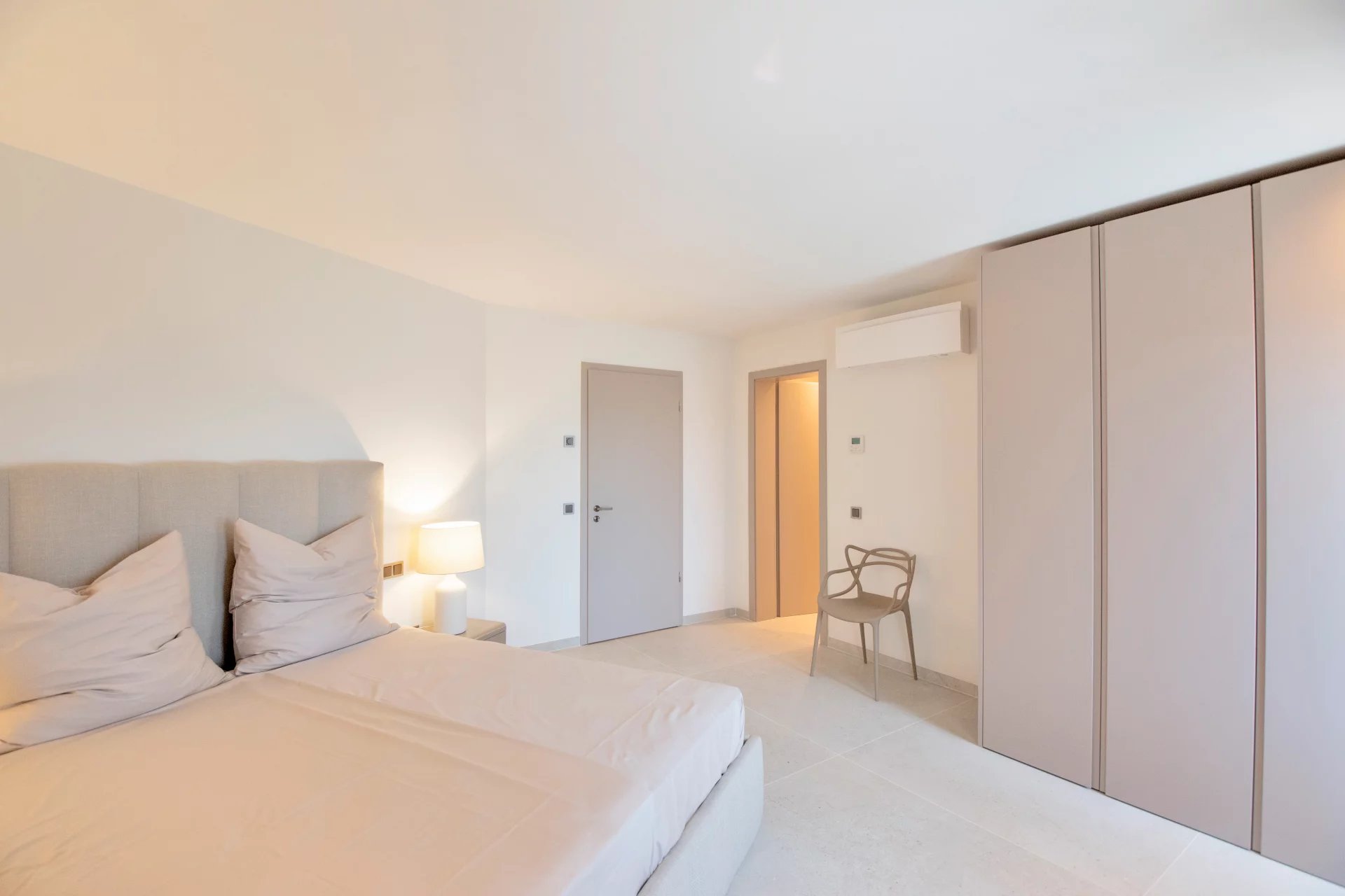 Au niveau supérieur, la villa dispose de quatre chambres spacieuses, toutes avec salle de bains attenante et dressing. Deux d'entre elles sont de vastes suites principales avec accès direct à des terrasses privées offrant des vues spectaculaires sur la ville d'Ibiza et la baie de Talamanca.