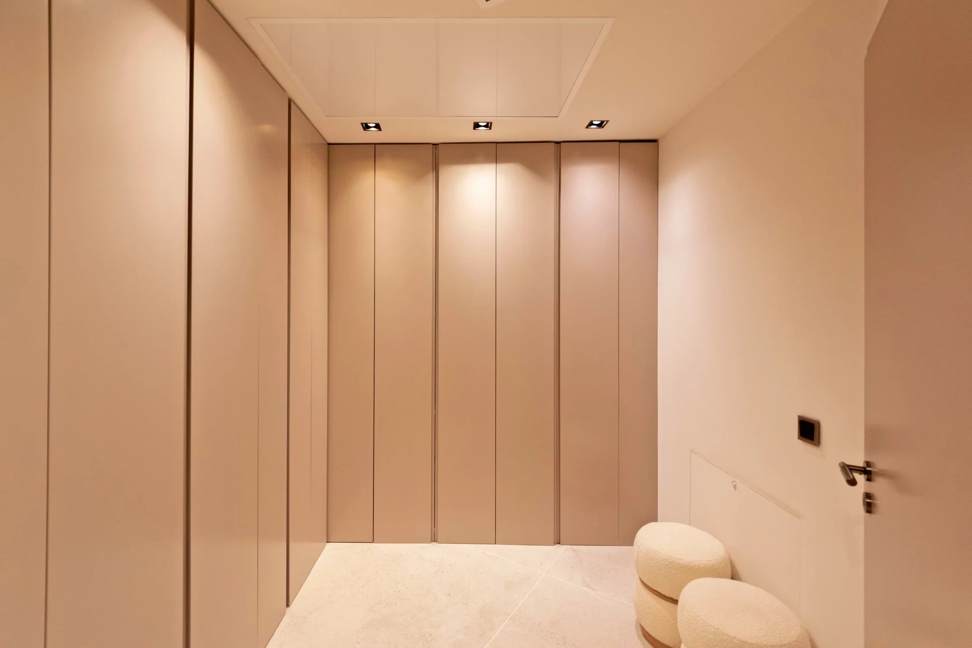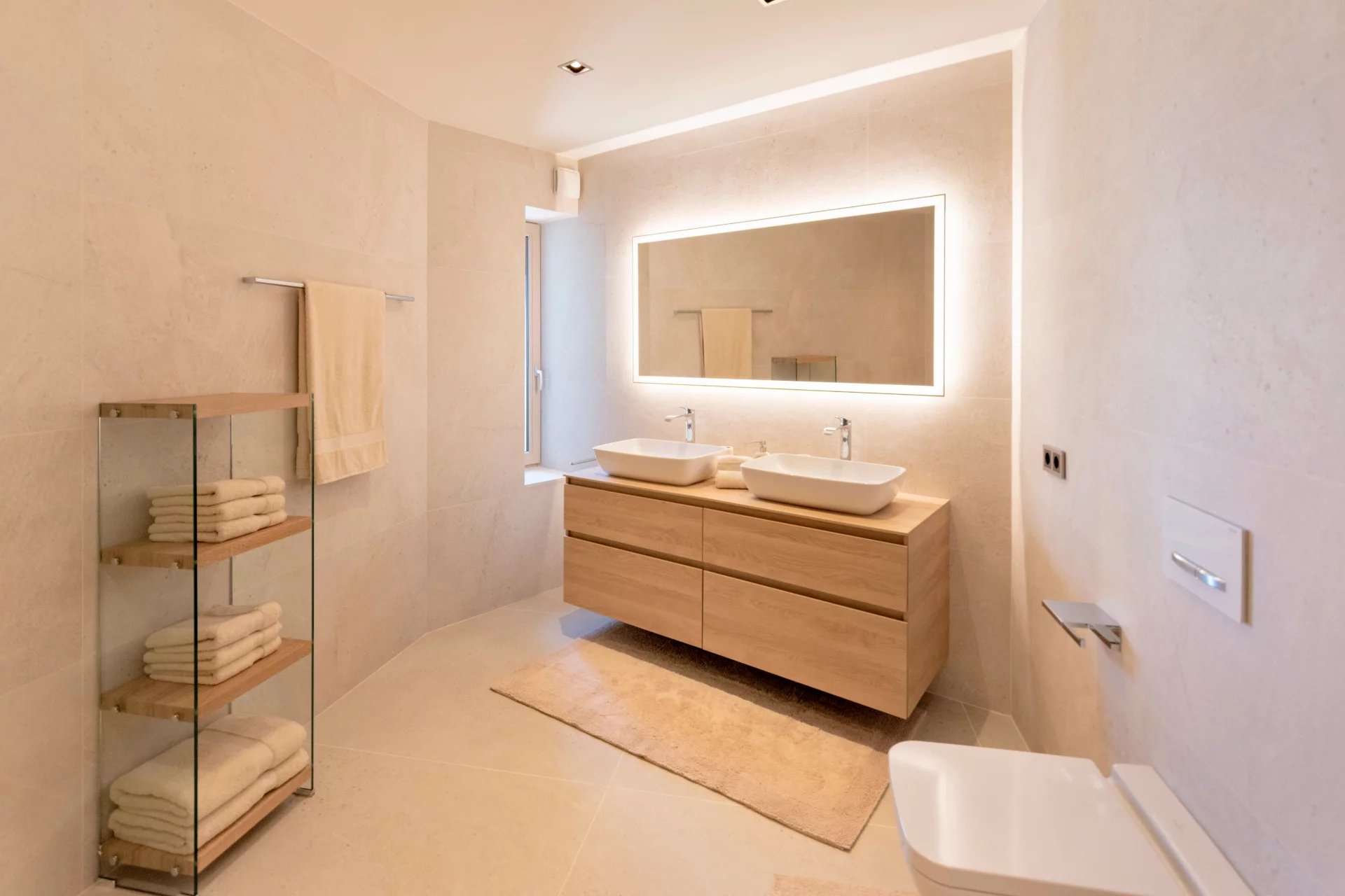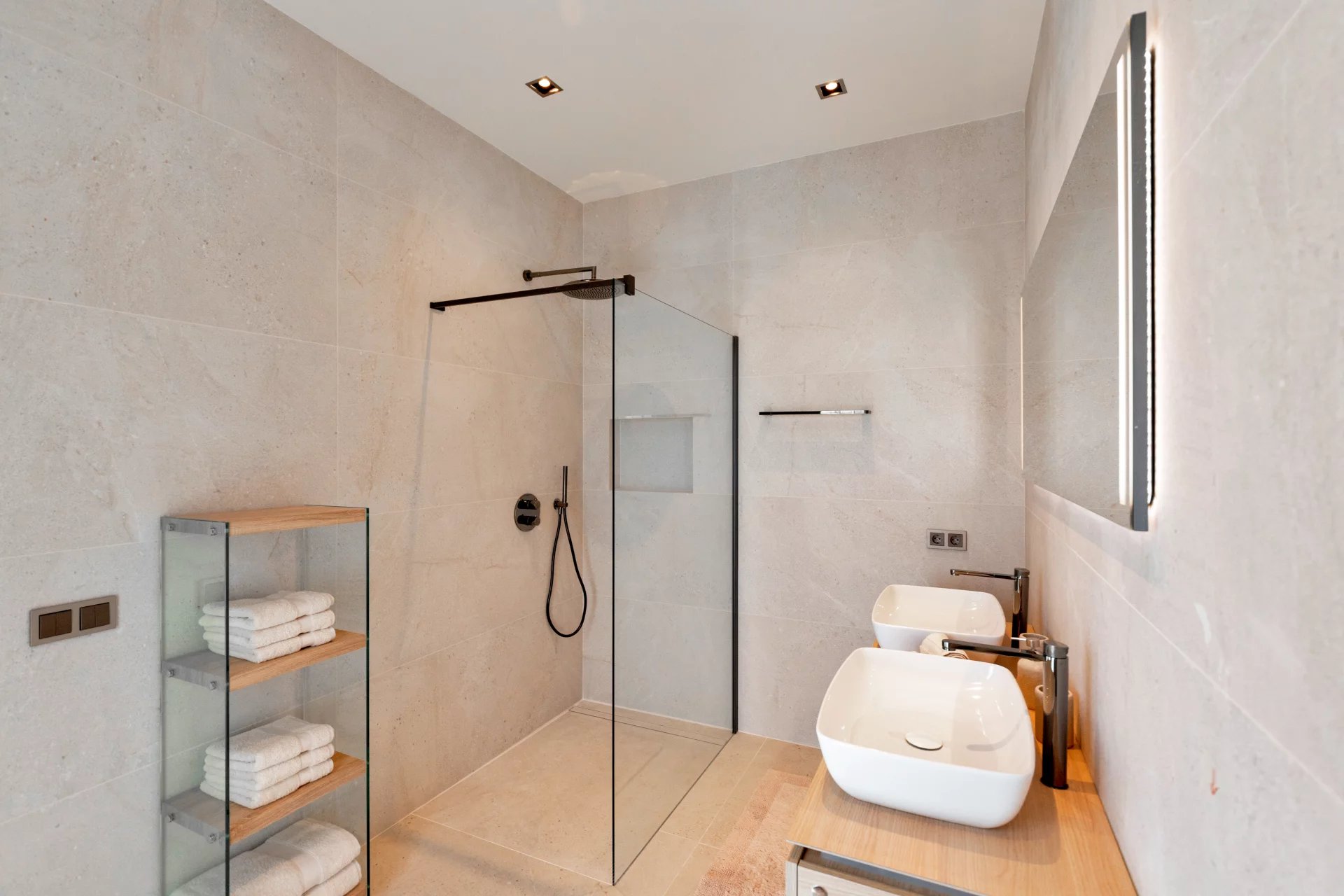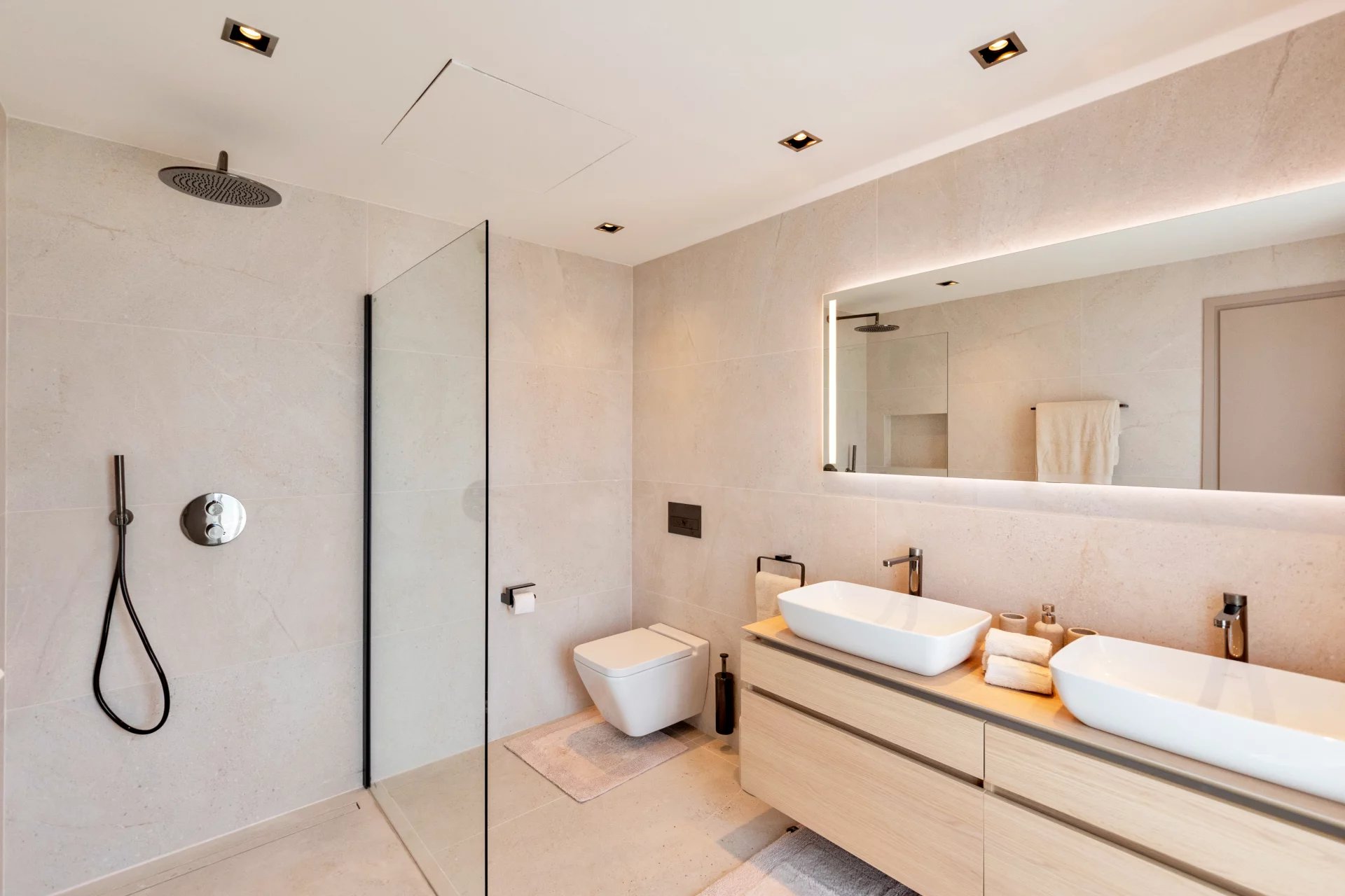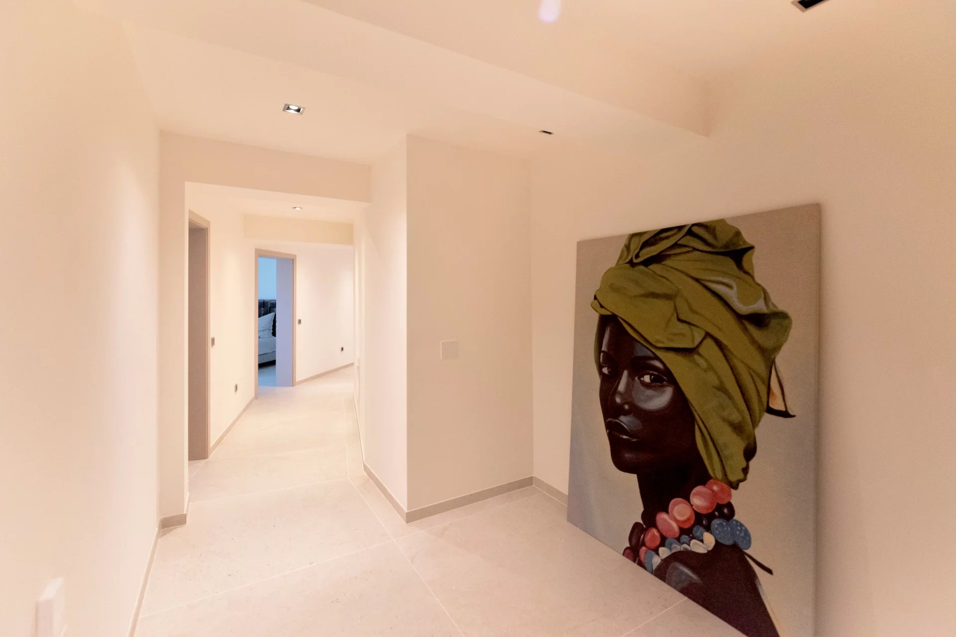 Au niveau supérieur, la villa dispose de quatre chambres spacieuses, toutes avec salle de bains attenante et dressing. Deux d'entre elles sont de vastes suites principales avec accès direct à des terrasses privées offrant des vues spectaculaires sur la ville d'Ibiza et la baie de Talamanca.