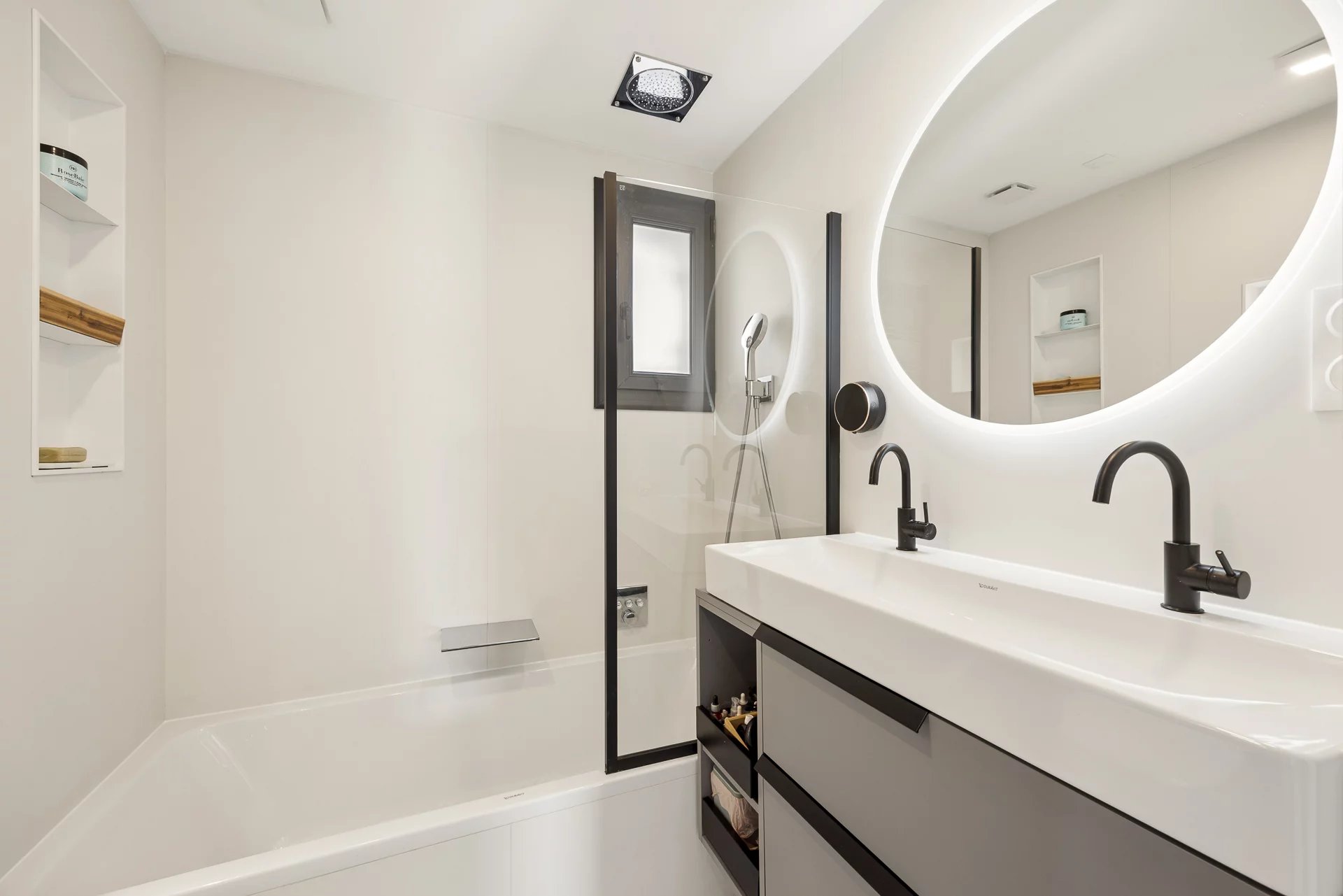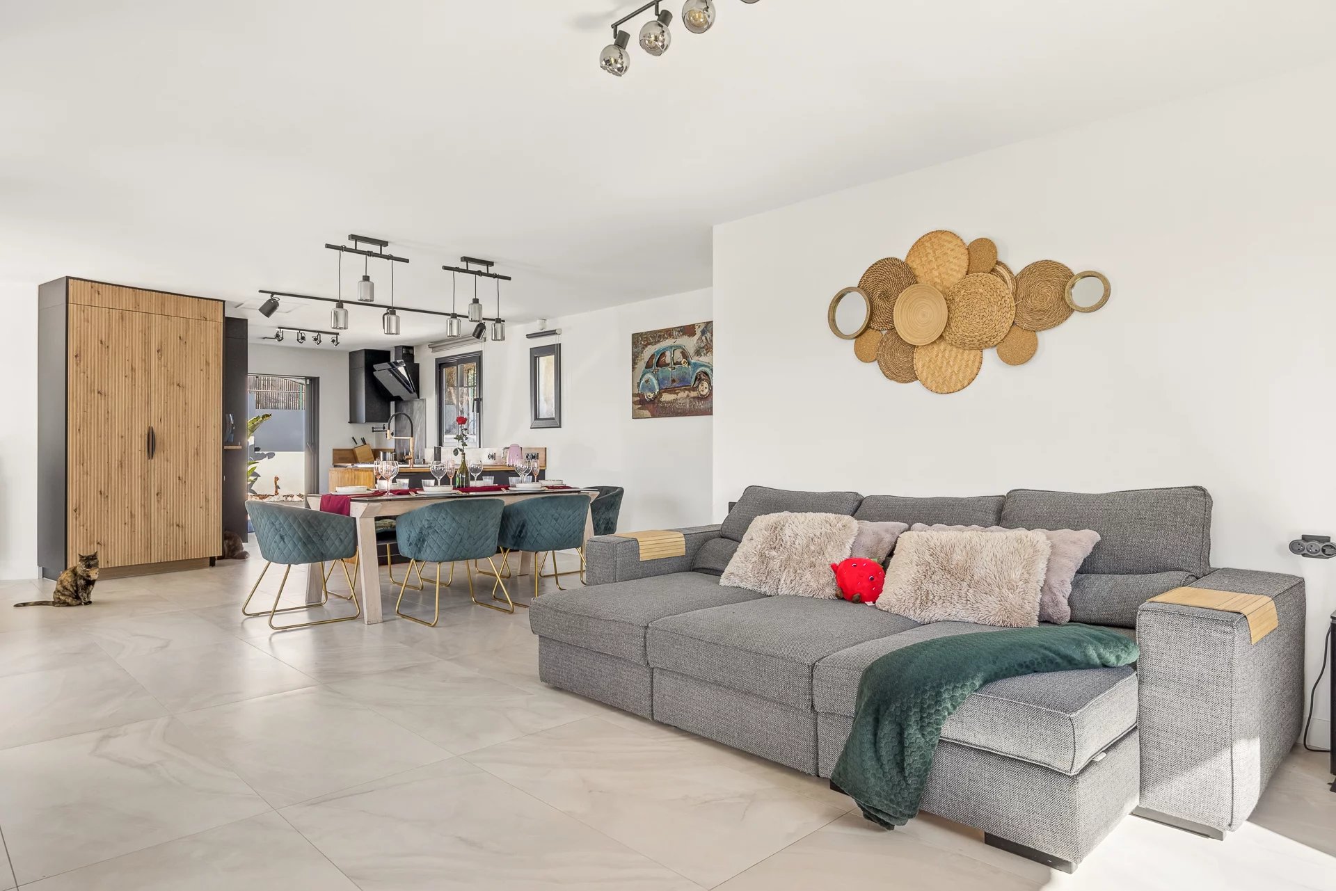 L’espace de vie, lumineux et ouvert, s’articule autour d’un séjour et d’une salle à manger prolongés par une cuisine américaine entièrement équipée. L’ensemble s’ouvre naturellement sur les extérieurs, pensés pour une véritable vie dedans-dehors.