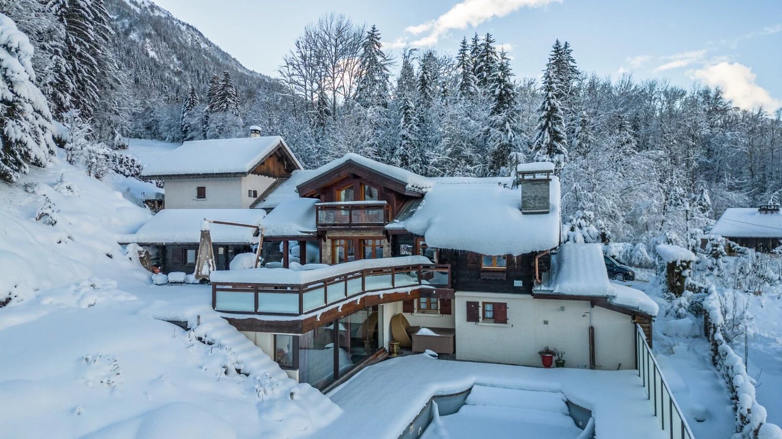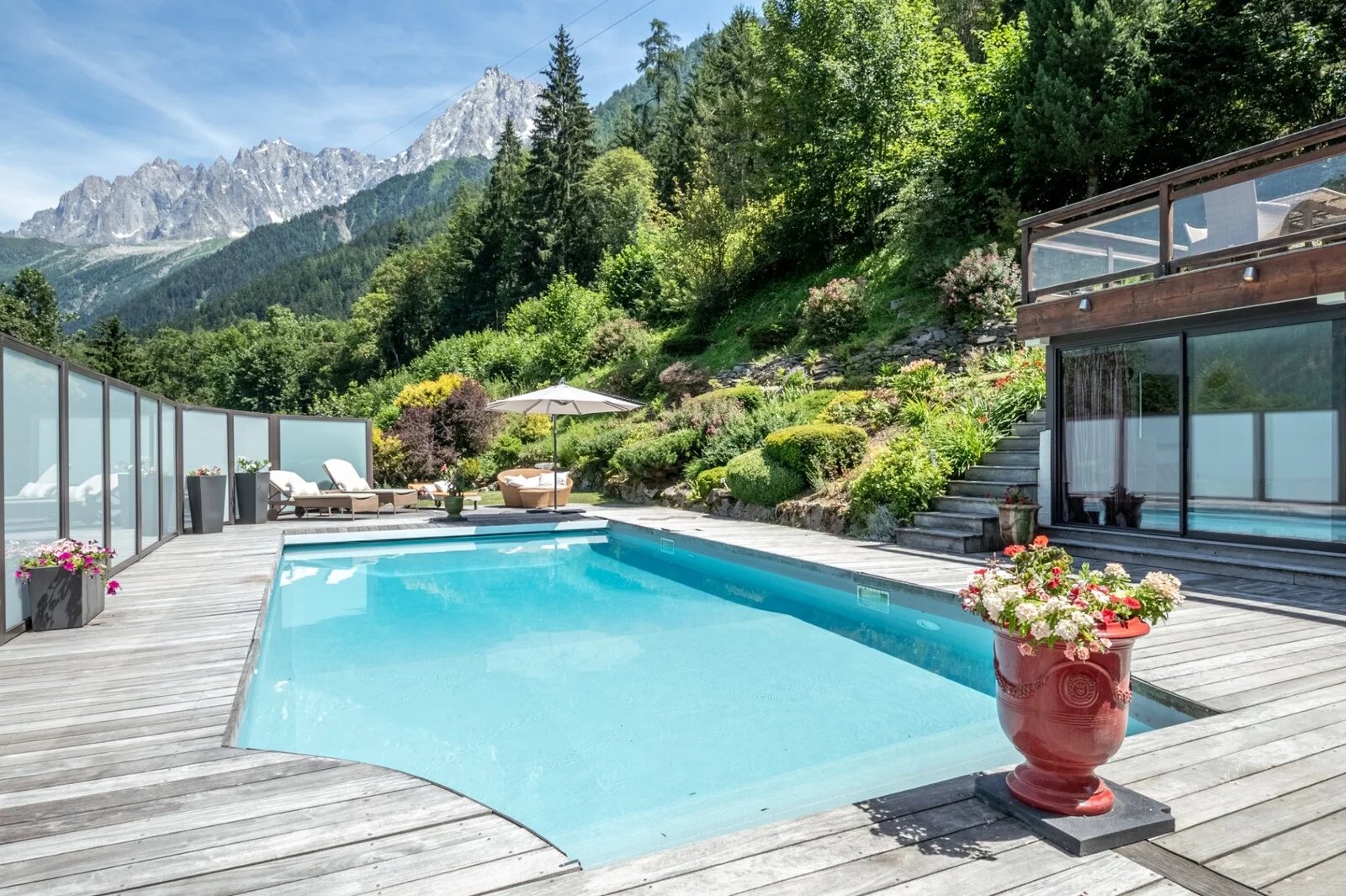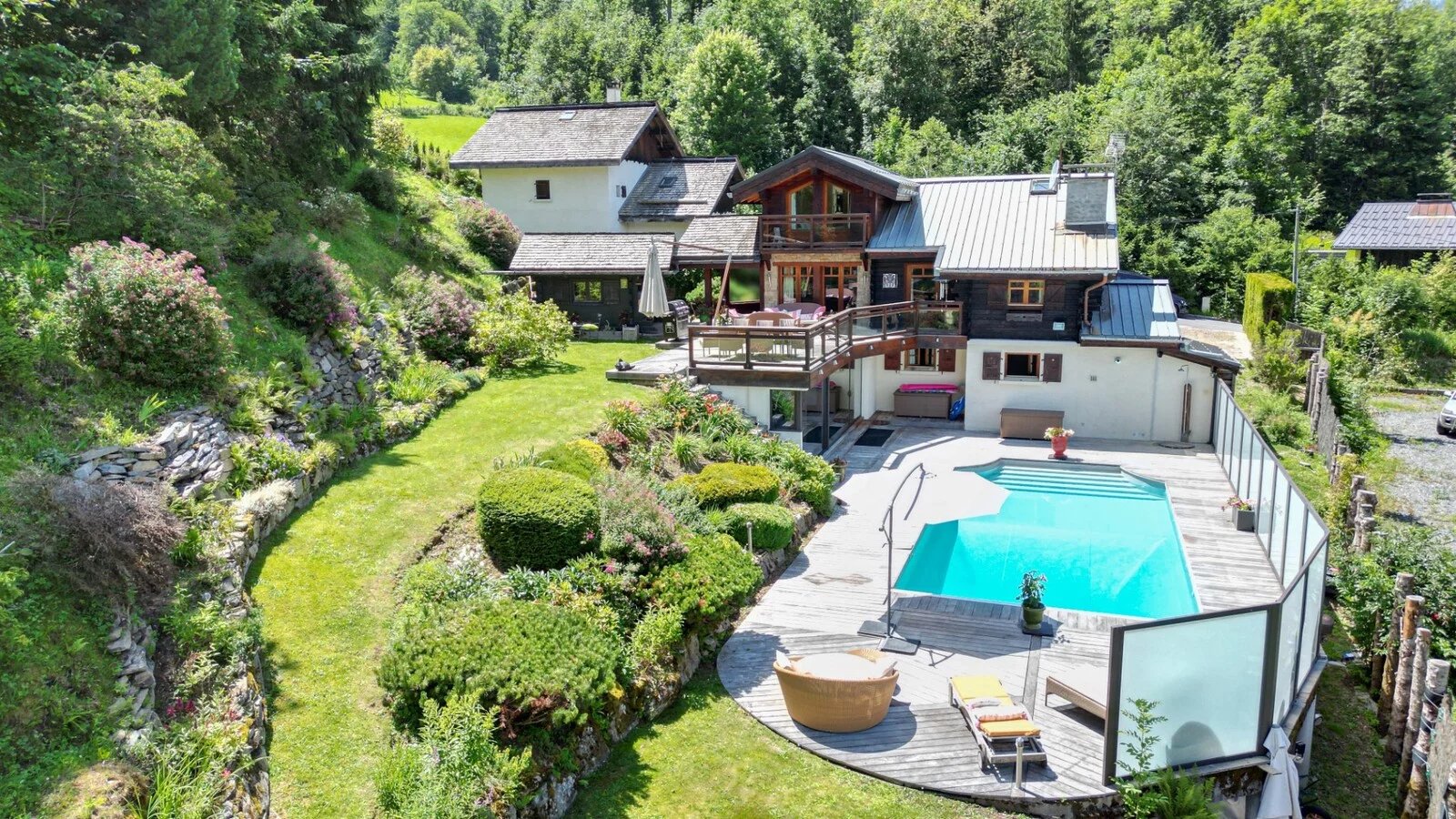 Situé aux Houches dans un secteur calme et proche du centre village, ce chalet de 241m² propose un bel espace de vie organisé autour de sa piscine chauffée et ses grandes terrasses ensoleillées.