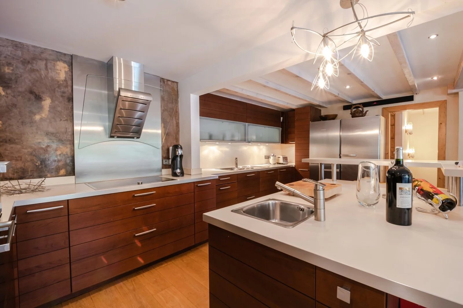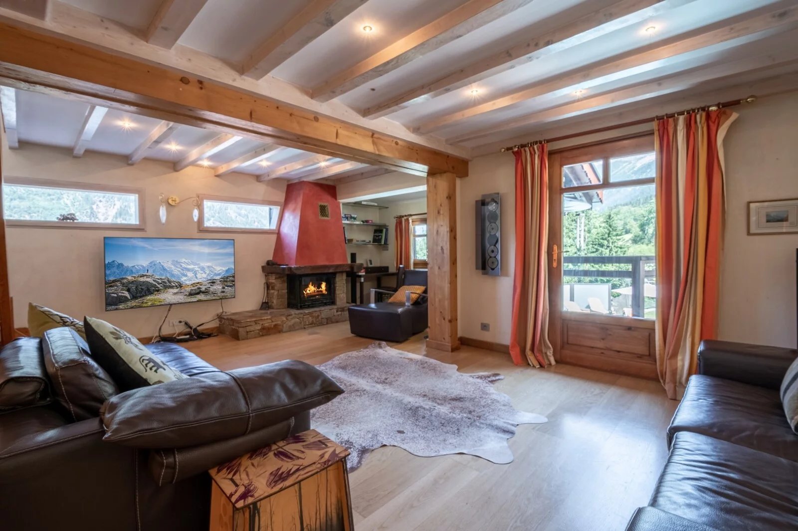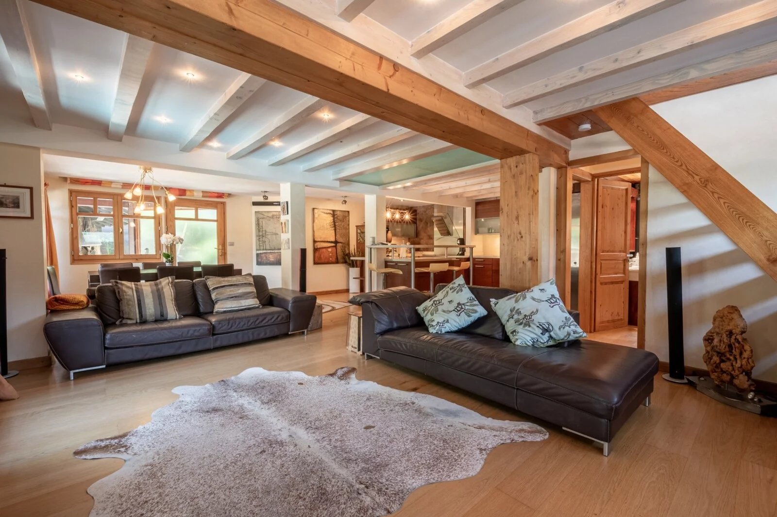 Judicieusement réparti en trois niveaux , le chalet propose plusieurs espaces de vie , 4 chambres doubles dont une master , un spacieux salon / salle à manger organisé autour de la cuisine.