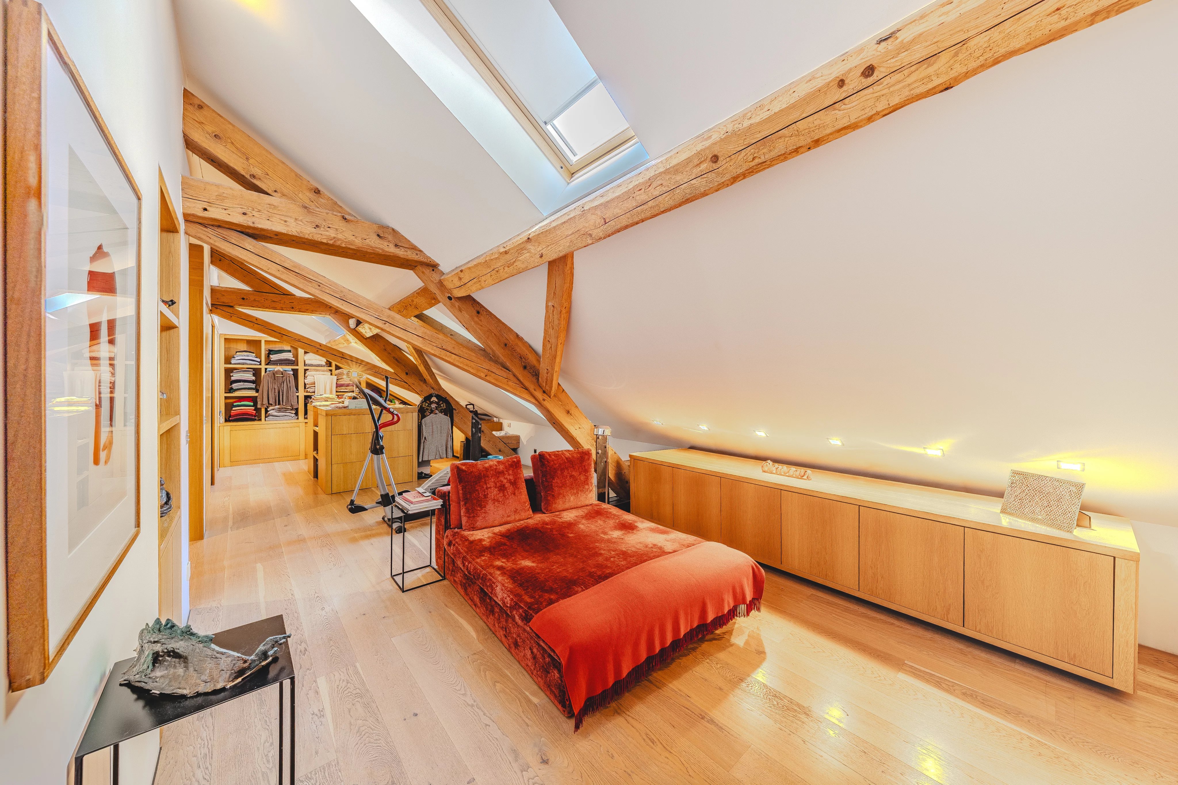 2e étage – suite parentale : chambre avec cheminée, dressing, bureau aux charpentes apparentes, salle de bain avec douche et hammam et un espace fitness avec TV.