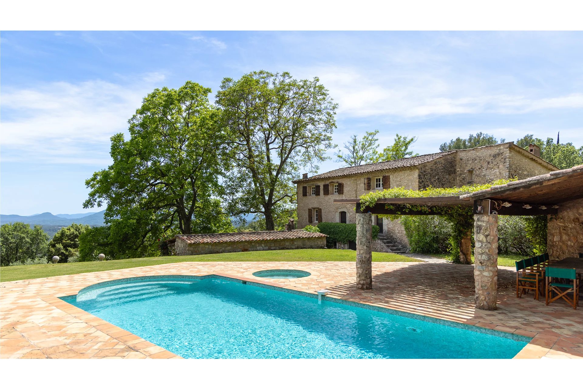Surplombant la campagne environnante, la propriété se compose d’une bastide en pierre du XVIIe siècle et d’une élégante maison d’amis indépendante. L’ensemble conjugue avec finesse l’authenticité de l’ancien et le confort contemporain.