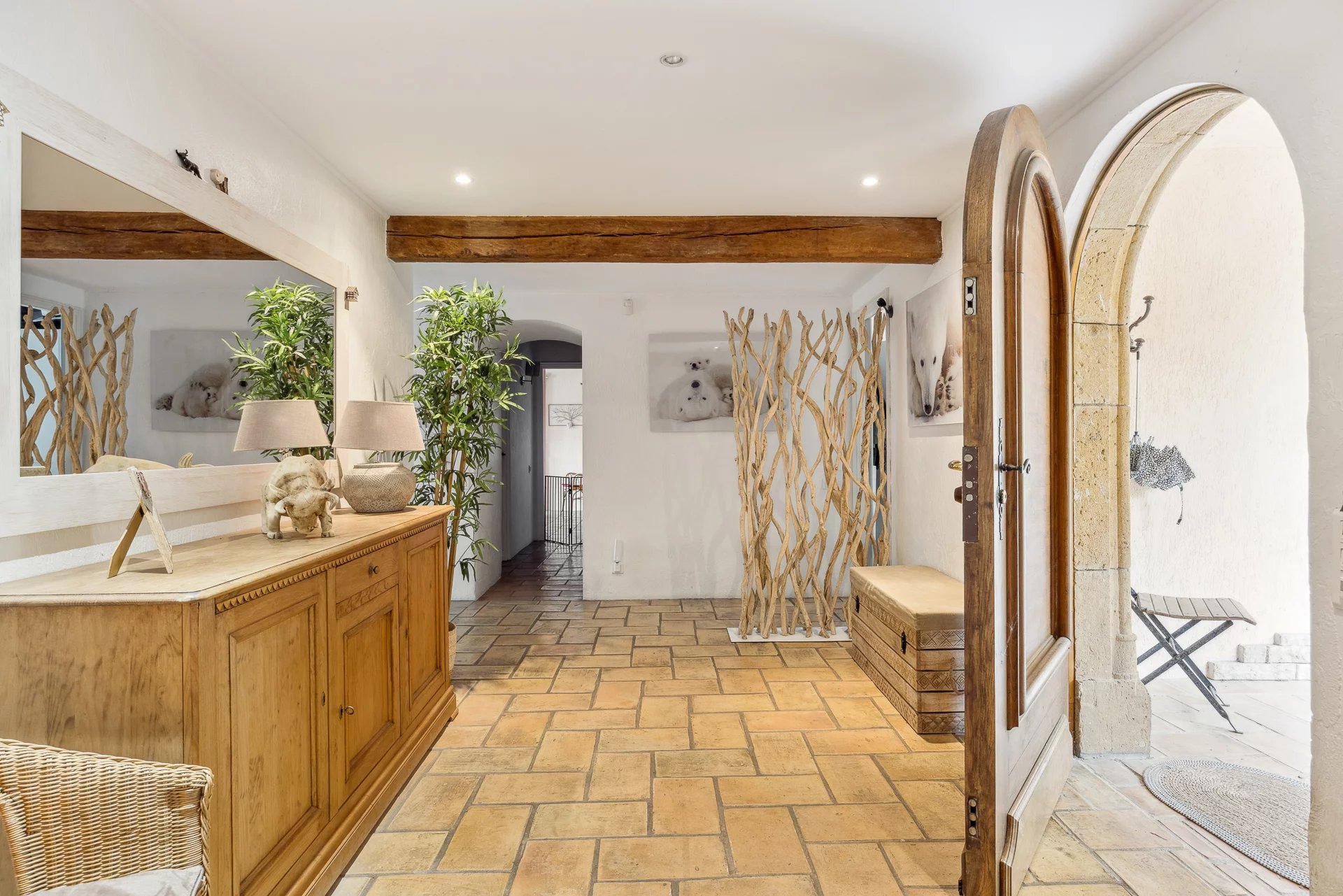À l’étage, deux chambres supplémentaires, dont une suite parentale avec dressing, salle de bain, douche et terrasse avec vue sur le village, ainsi qu’une autre suite avec terrasse tropézienne, parfaite pour profiter des couchers de soleil.
