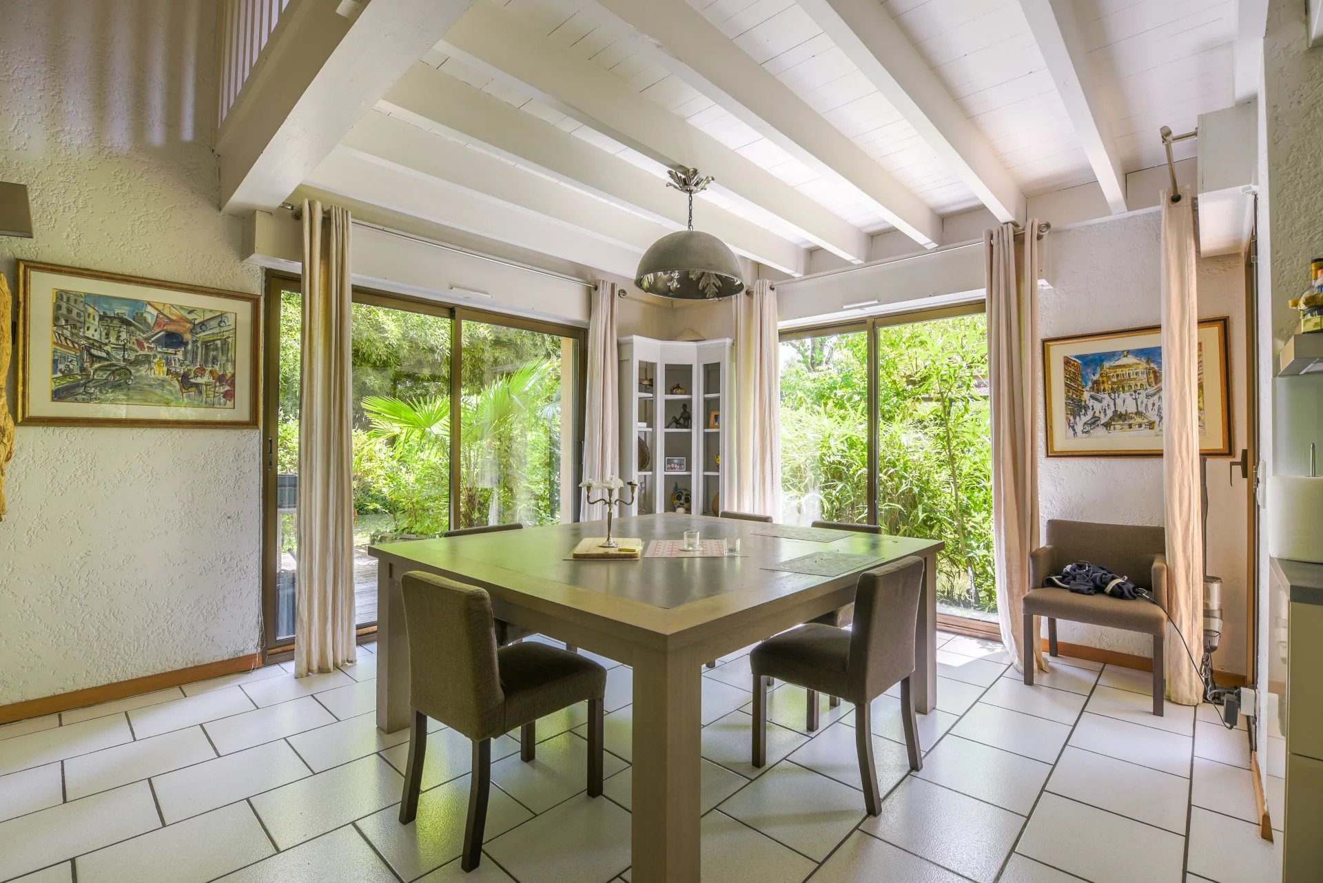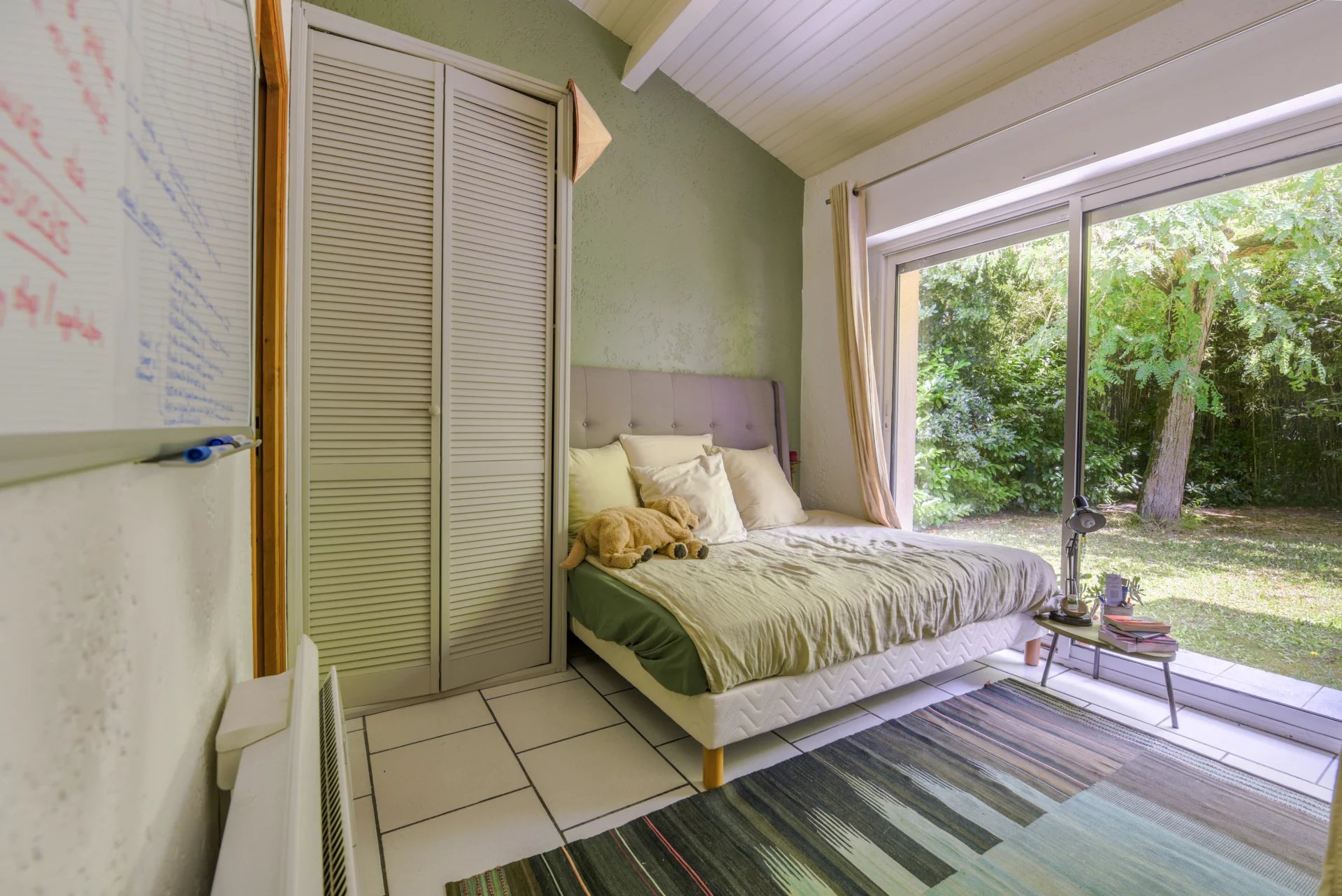 La villa offre de beaux volumes avec une pièce de vie généreuse et lumineuse agrémentée d'une cheminée pour les soirées d'hiver. Le rez-de-chaussée dispose de deux chambres et d'une salle d'eau, tandis que l'étage en mezzanine offre un coin nuit, un espace bureau et une seconde salle d'eau.
