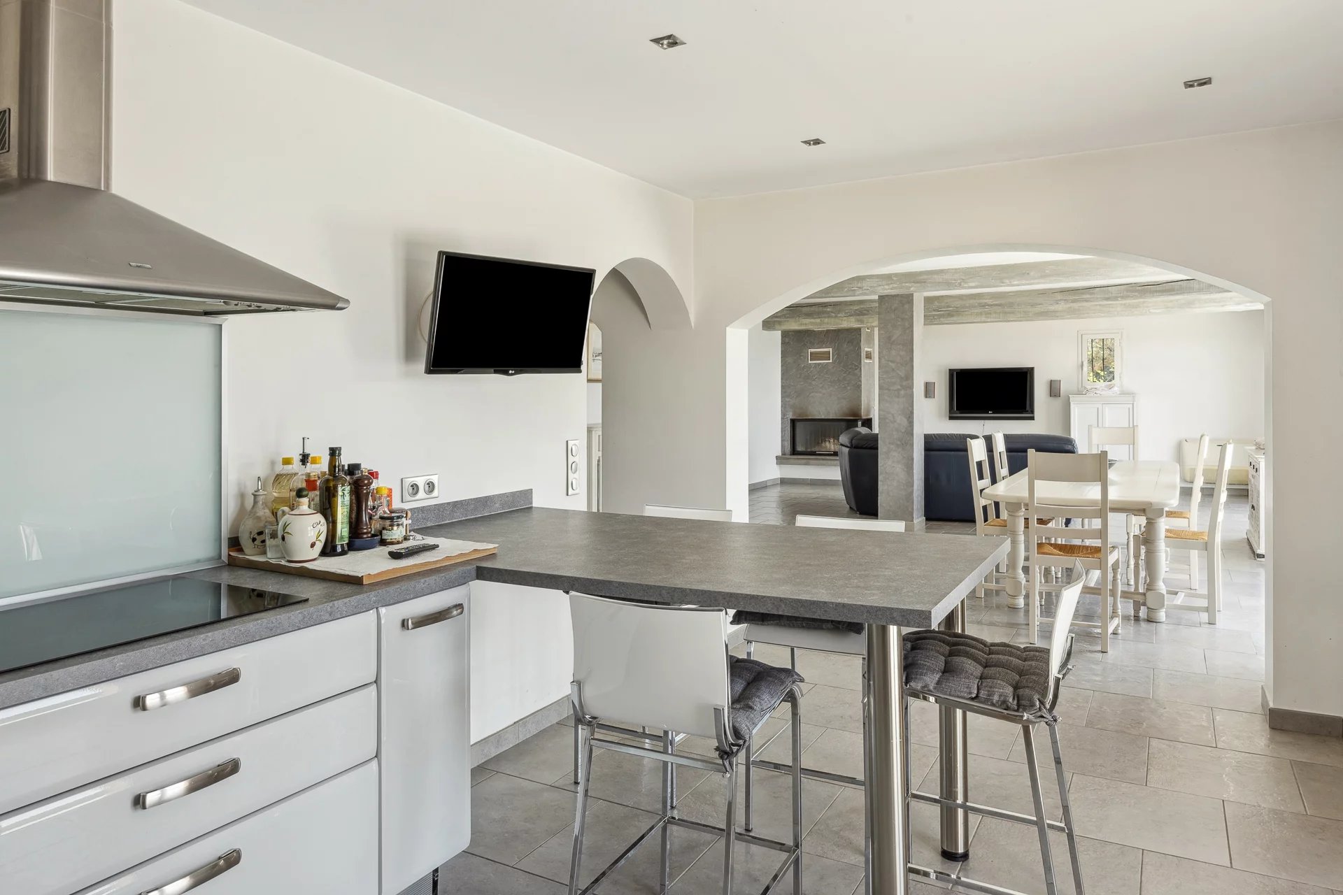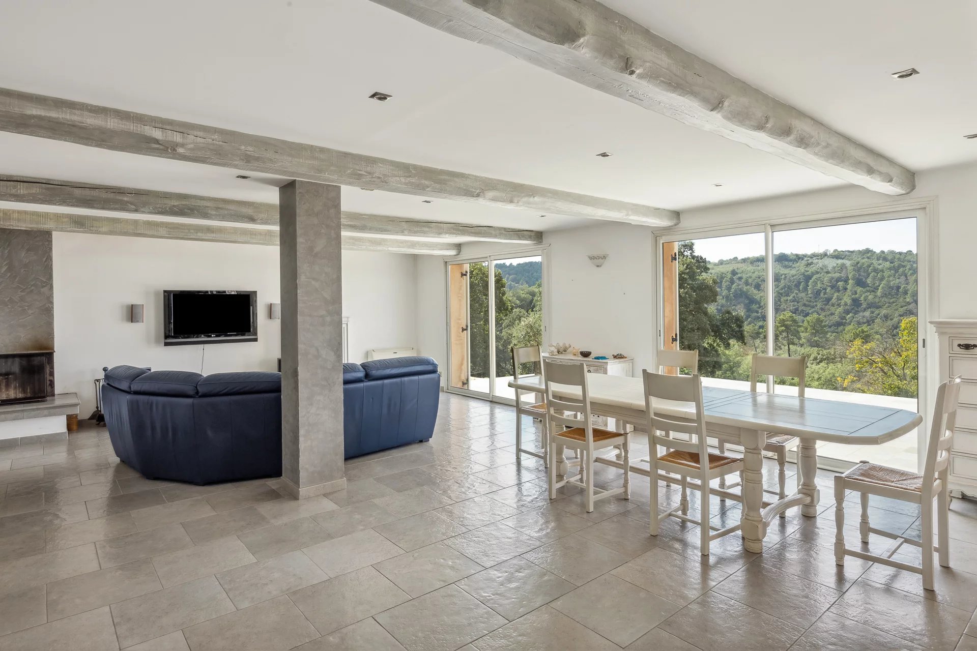 En savoir plusAu rez-de-chaussée se trouve un chaleureux séjour d'environ 50m² avec cheminée et poutres apparentes, cuisine ouverte et accès à une superbe terrasse, une salle de réception indépendante ainsi que sur le jardin et la piscine en contrebas. Le niveau est complété par une chambre de plain pied avec sa salle d'eau, une buanderie et un wc.