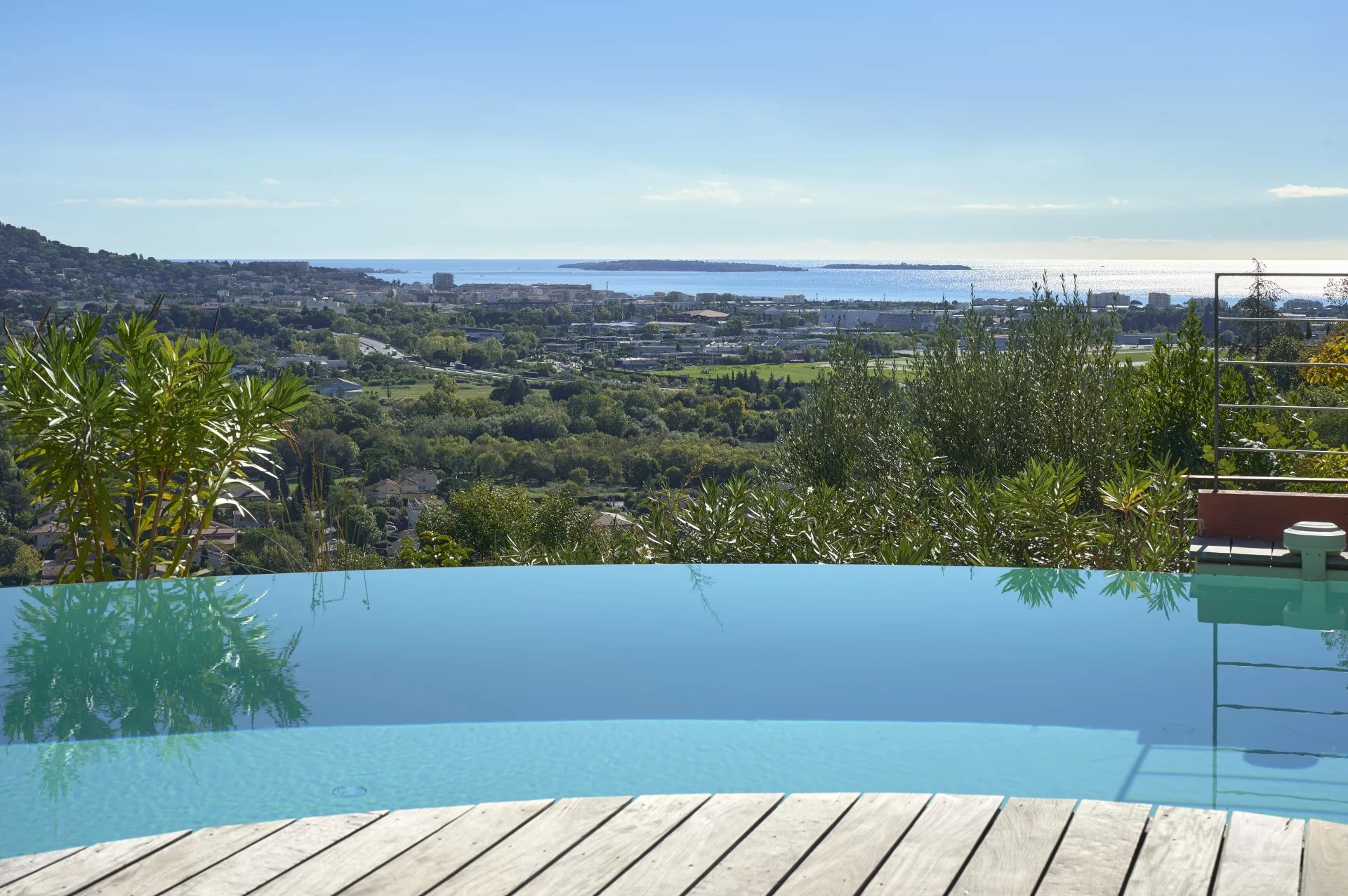 D'une superficie d'environ 302m2 habitable, la propriété offre une magnifique vue sur la mer, les îles de Lérins et les montagnes.