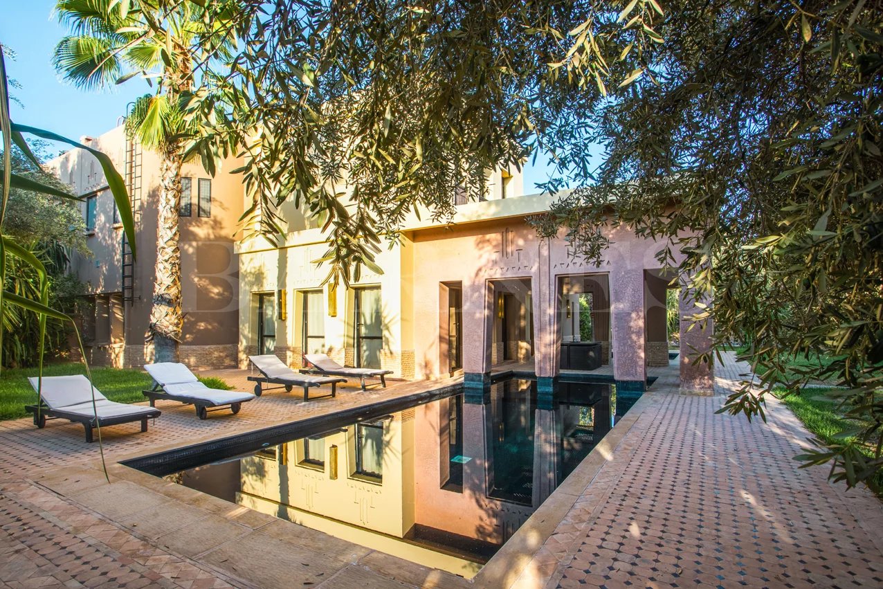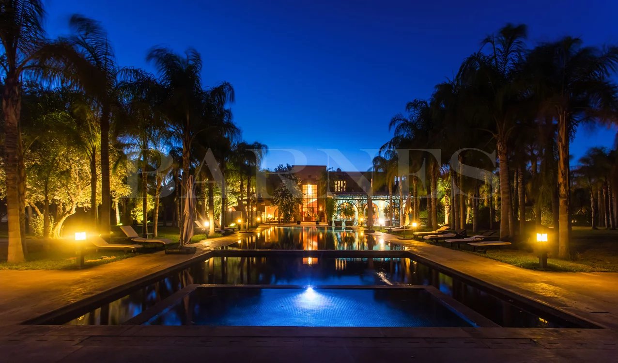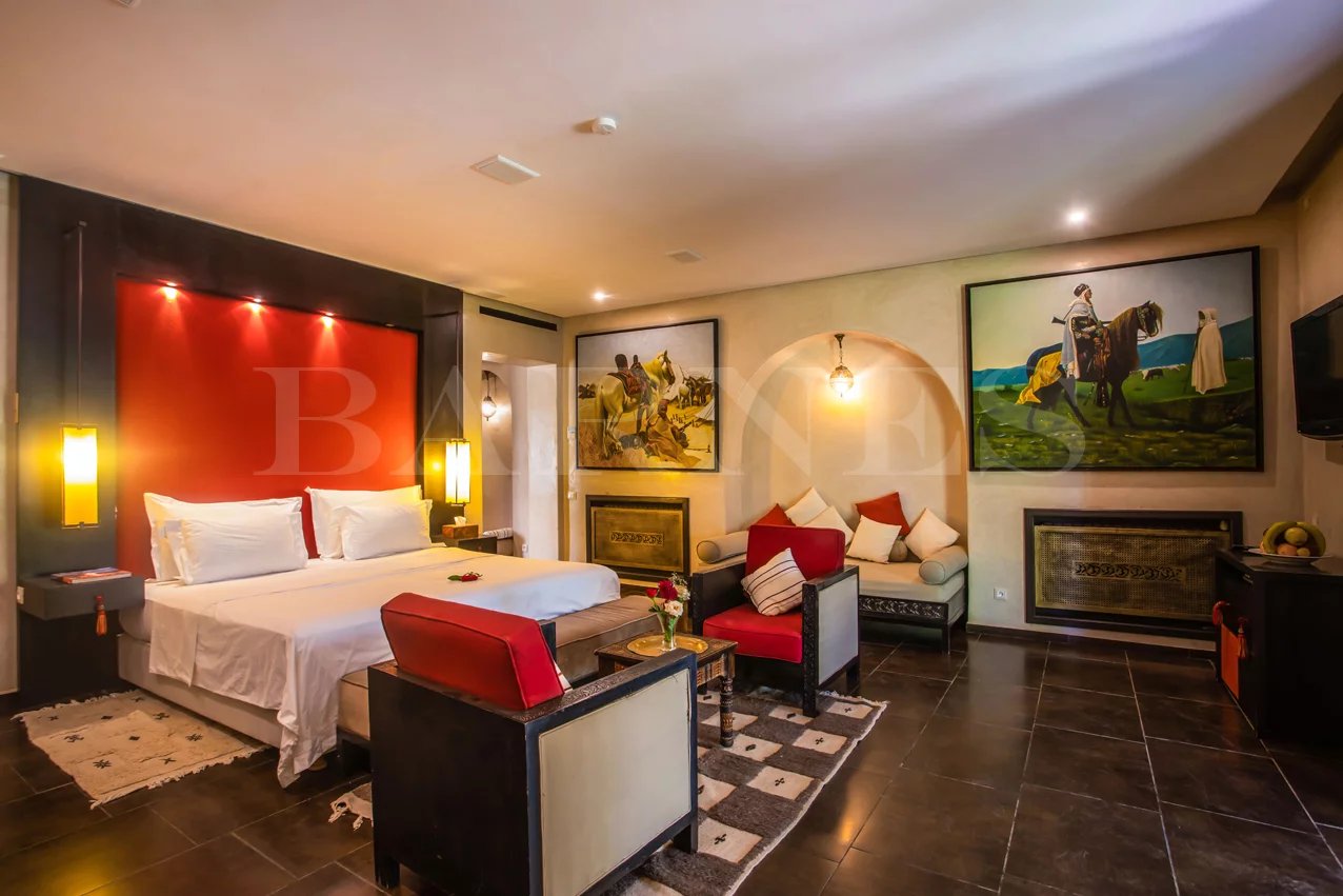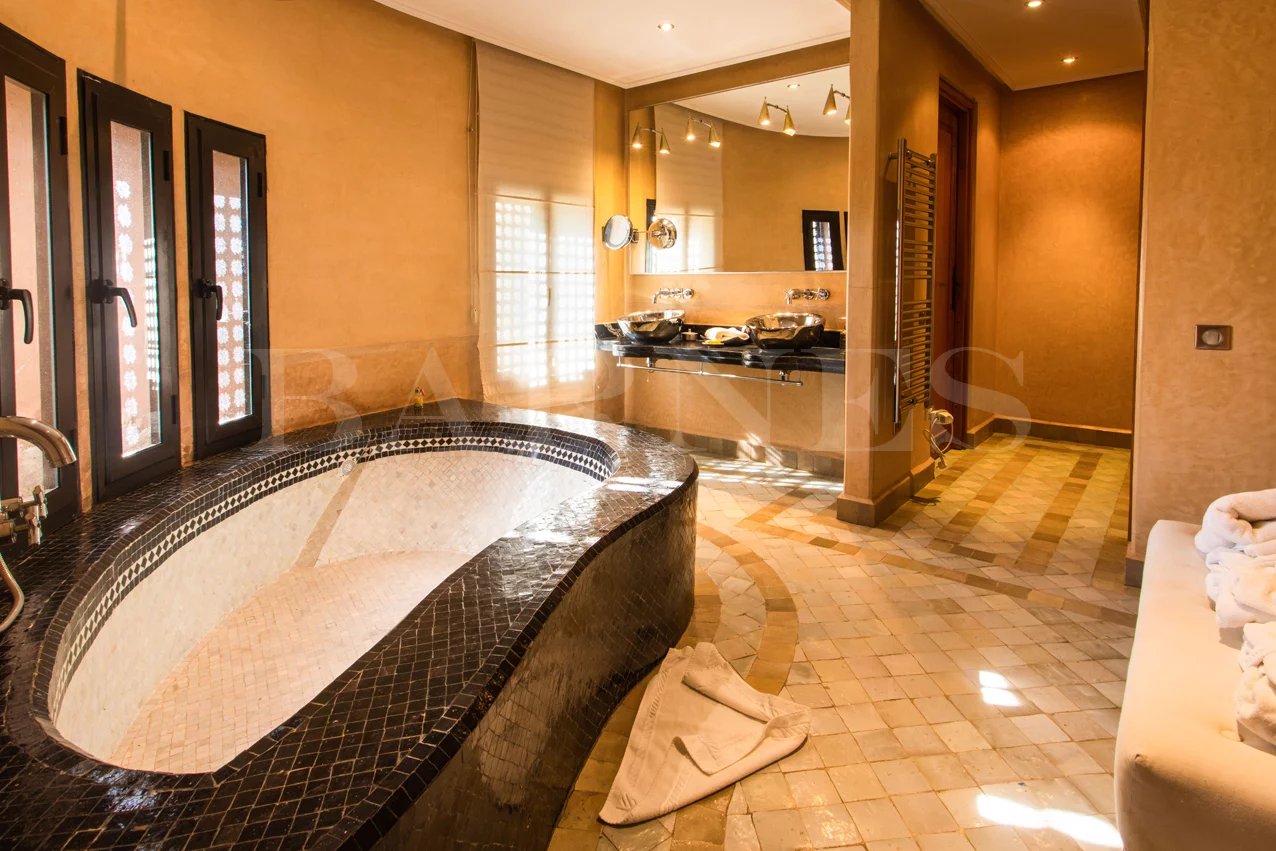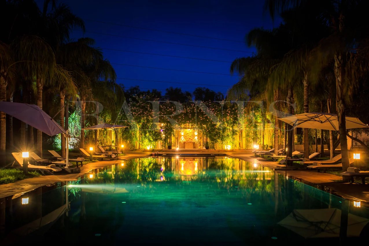 Situé dans un endroit résidentiel de la palmeraie, ce palais d’hôtes, oeuvre d’un architecte renommé , vous offre dans un cadre exceptionnel ,planté d’oliviers et de palmiers, une grande villa offrant 10 suites de prestige, avec bar, salons, salle à manger le tout avec une vue sur des grandes piscines qu’offre le domaine. Agrémentée de bassins, cette villa sous séduira par son originalité et son confort. A l’abri des regards, 3 villas de 280 m2, chacune offrant 3 suites avec jardin et piscine privée ,offre un confort dans un luxe discret et de qualité. Pour le plaisir de tous, une grande piscine chauffée dans le parc, un spa hammam vous offrant toute la gamme de services que vous pouvez en attendre. La surface construite est de 3500 m2, cuisine professionnelle avec chambre froide, groupe électrogène de secours et 3 puits avec l’eau à 45 m de profondeur avec station de recyclage des eaux usées. Un domaine de charme rare à Marrakech. Une exploitation professionnelle permettra un retour sur investissement en 5 ans. A saisir