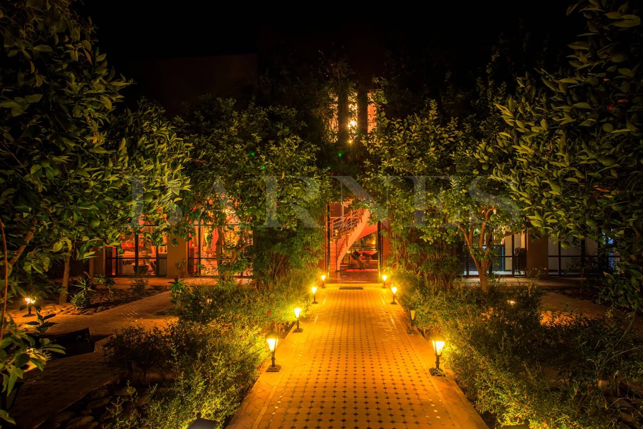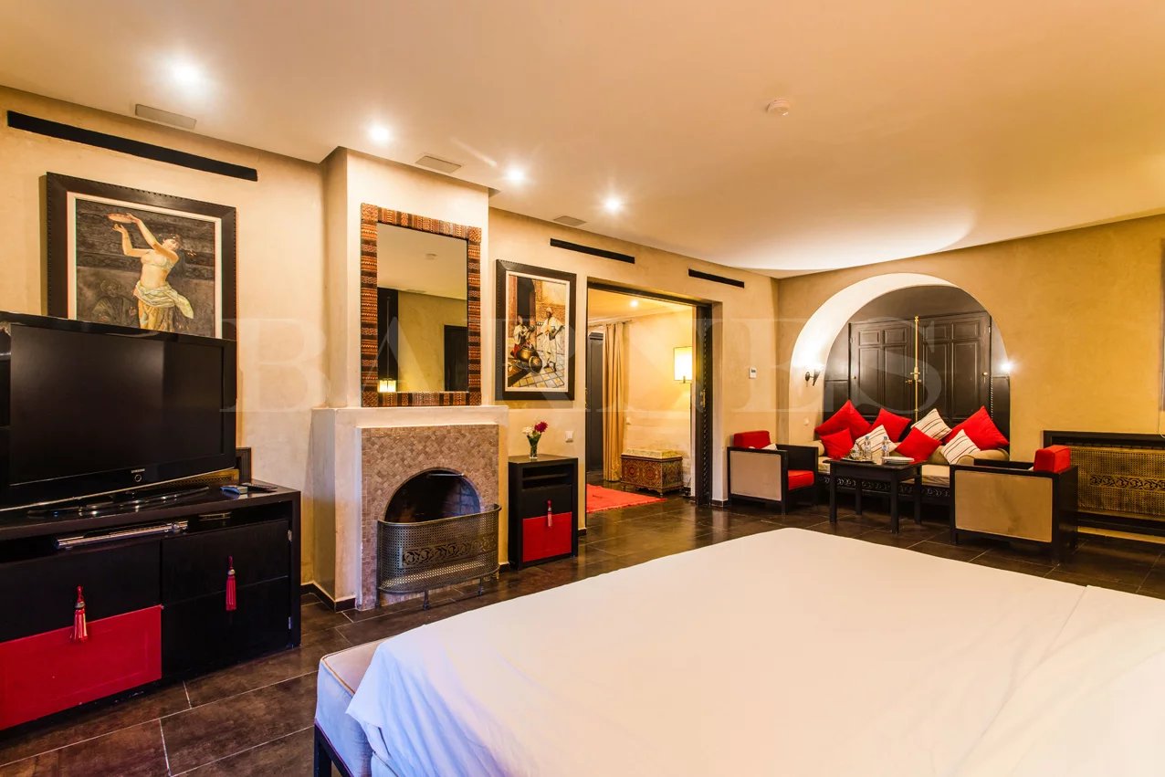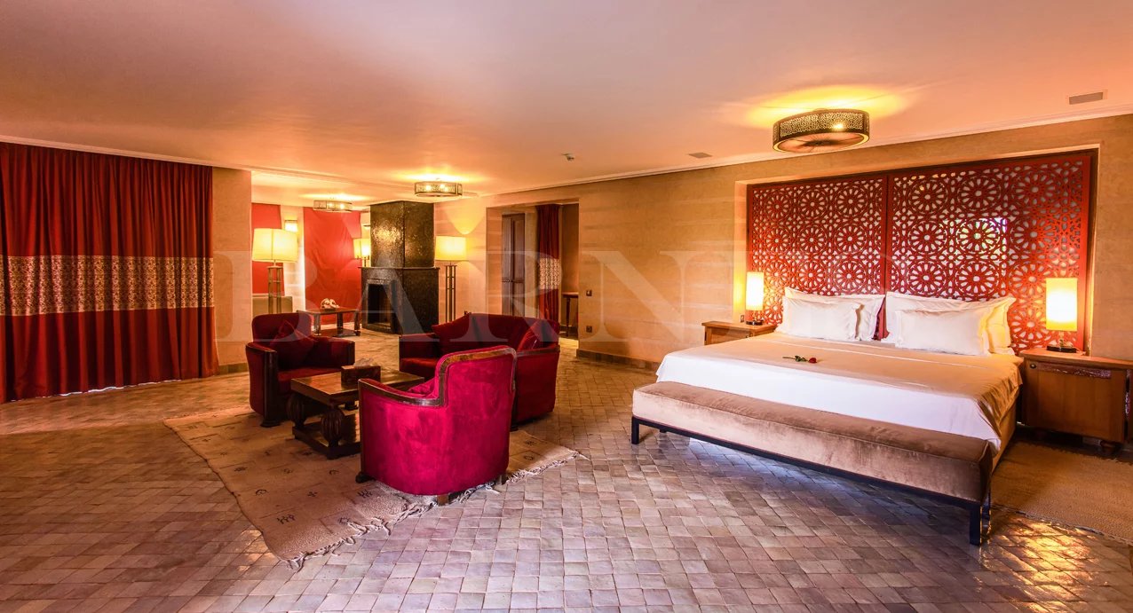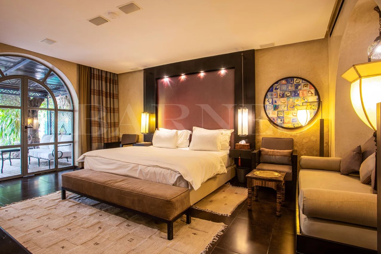 Situé dans un endroit résidentiel de la palmeraie, ce palais d’hôtes, oeuvre d’un architecte renommé , vous offre dans un cadre exceptionnel ,planté d’oliviers et de palmiers, une grande villa offrant 10 suites de prestige, avec bar, salons, salle à manger le tout avec une vue sur des grandes piscines qu’offre le domaine. Agrémentée de bassins, cette villa sous séduira par son originalité et son confort. A l’abri des regards, 3 villas de 280 m2, chacune offrant 3 suites avec jardin et piscine privée ,offre un confort dans un luxe discret et de qualité. Pour le plaisir de tous, une grande piscine chauffée dans le parc, un spa hammam vous offrant toute la gamme de services que vous pouvez en attendre. La surface construite est de 3500 m2, cuisine professionnelle avec chambre froide, groupe électrogène de secours et 3 puits avec l’eau à 45 m de profondeur avec station de recyclage des eaux usées. Un domaine de charme rare à Marrakech. Une exploitation professionnelle permettra un retour sur investissement en 5 ans. A saisir