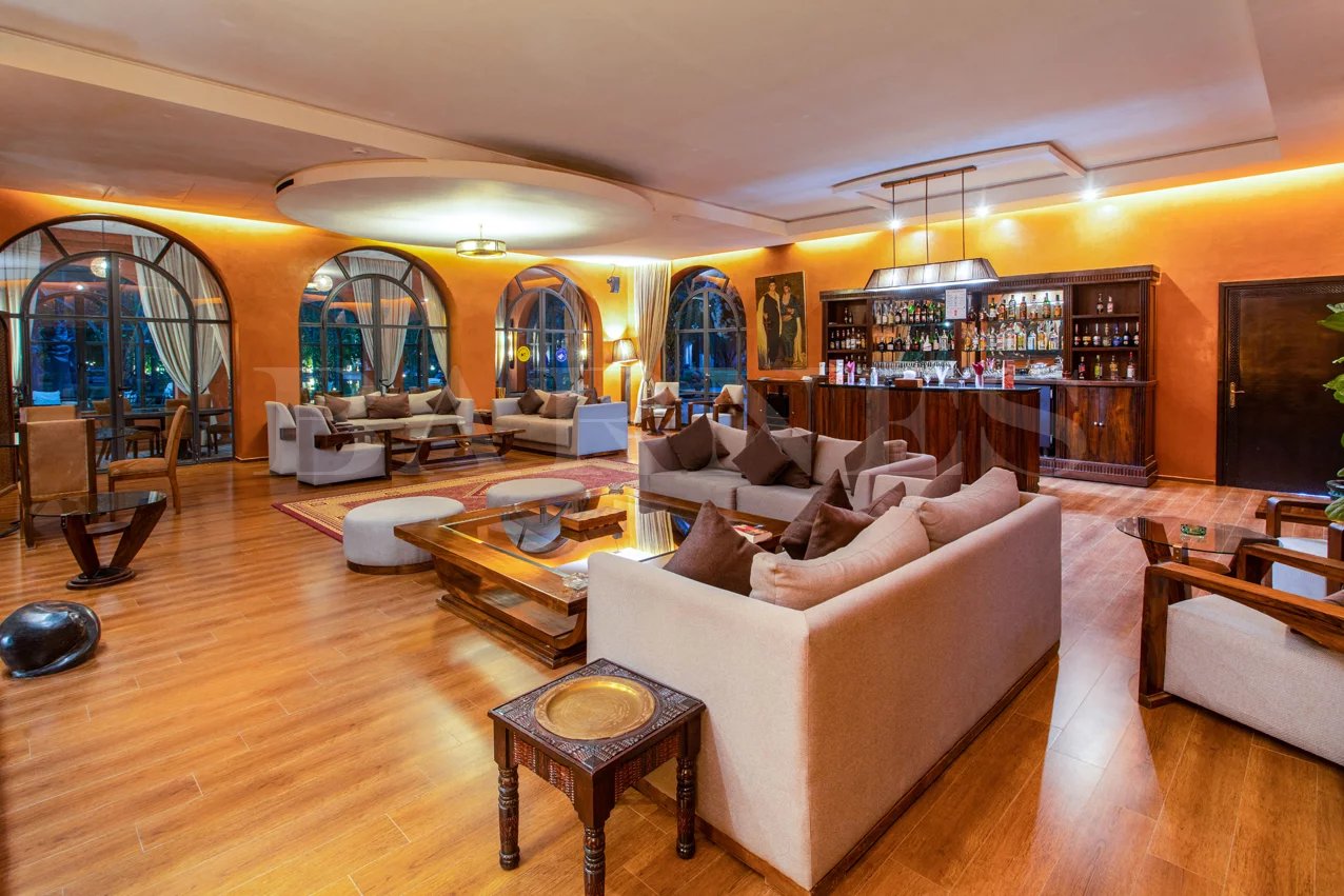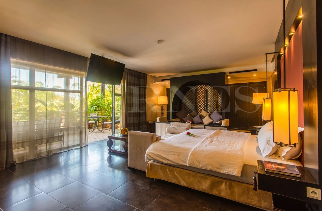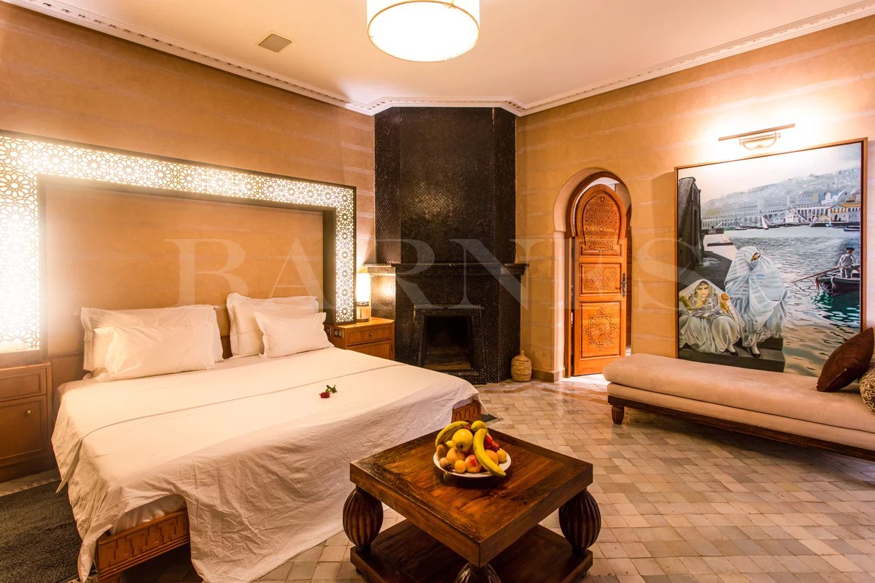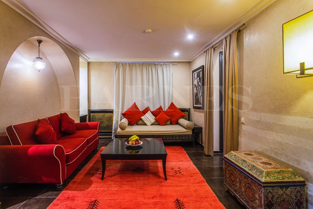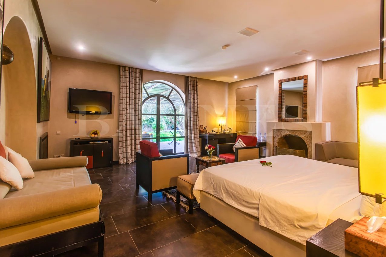Situé dans un endroit résidentiel de la palmeraie, ce palais d’hôtes, oeuvre d’un architecte renommé , vous offre dans un cadre exceptionnel ,planté d’oliviers et de palmiers, une grande villa offrant 10 suites de prestige, avec bar, salons, salle à manger le tout avec une vue sur des grandes piscines qu’offre le domaine. Agrémentée de bassins, cette villa sous séduira par son originalité et son confort. A l’abri des regards, 3 villas de 280 m2, chacune offrant 3 suites avec jardin et piscine privée ,offre un confort dans un luxe discret et de qualité. Pour le plaisir de tous, une grande piscine chauffée dans le parc, un spa hammam vous offrant toute la gamme de services que vous pouvez en attendre. La surface construite est de 3500 m2, cuisine professionnelle avec chambre froide, groupe électrogène de secours et 3 puits avec l’eau à 45 m de profondeur avec station de recyclage des eaux usées. Un domaine de charme rare à Marrakech. Une exploitation professionnelle permettra un retour sur investissement en 5 ans. A saisir