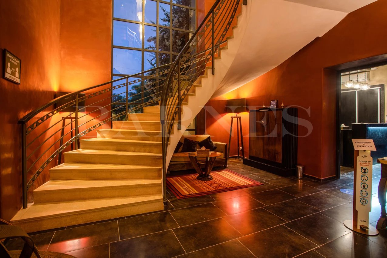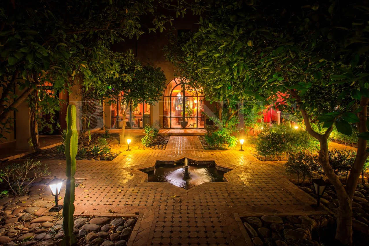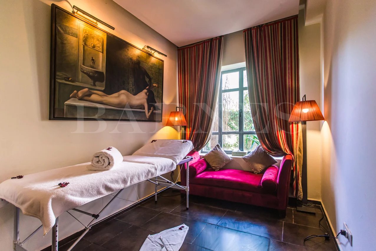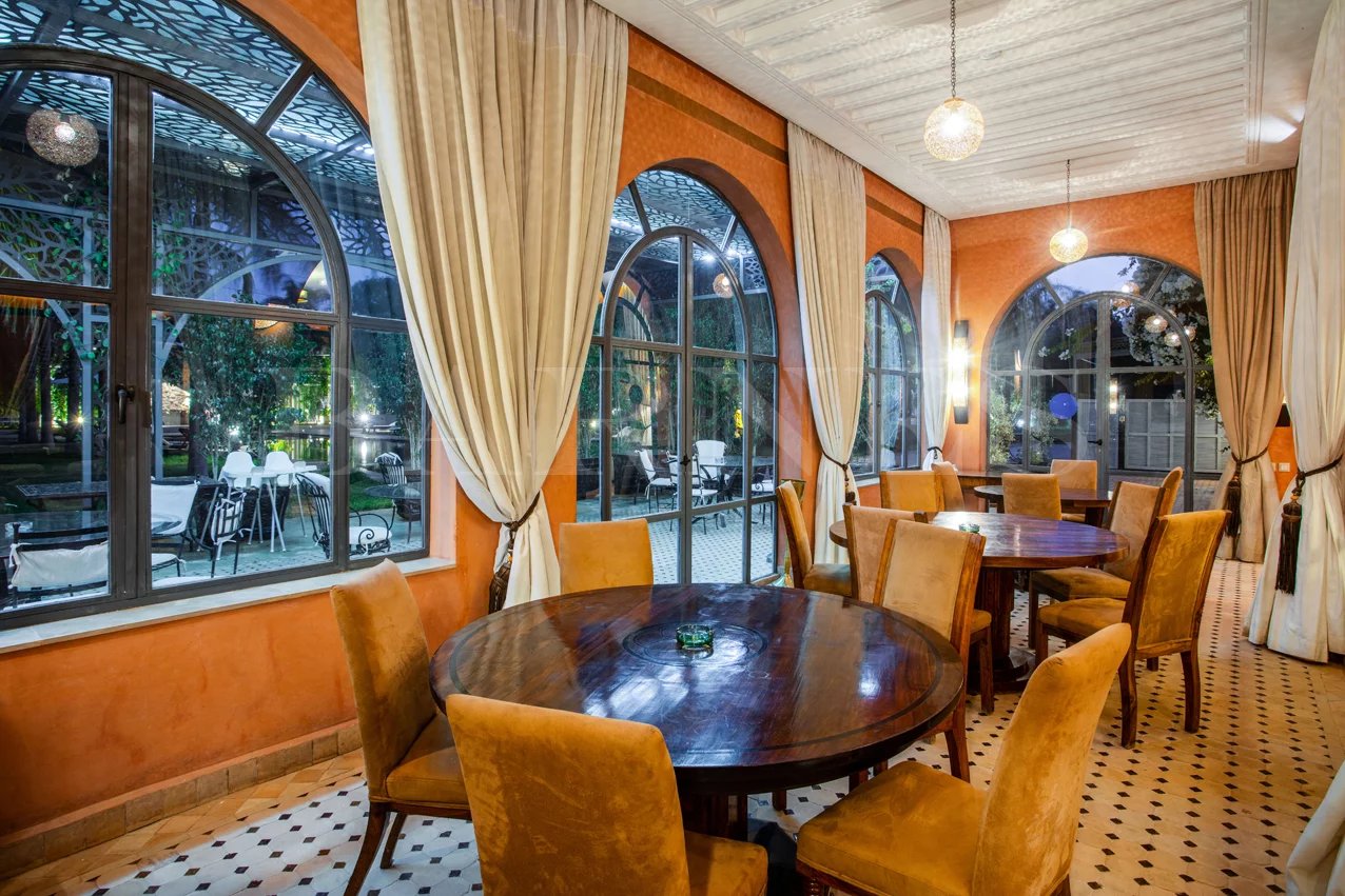 Situé dans un endroit résidentiel de la palmeraie, ce palais d’hôtes, oeuvre d’un architecte renommé , vous offre dans un cadre exceptionnel ,planté d’oliviers et de palmiers, une grande villa offrant 10 suites de prestige, avec bar, salons, salle à manger le tout avec une vue sur des grandes piscines qu’offre le domaine. Agrémentée de bassins, cette villa sous séduira par son originalité et son confort. A l’abri des regards, 3 villas de 280 m2, chacune offrant 3 suites avec jardin et piscine privée ,offre un confort dans un luxe discret et de qualité. Pour le plaisir de tous, une grande piscine chauffée dans le parc, un spa hammam vous offrant toute la gamme de services que vous pouvez en attendre. La surface construite est de 3500 m2, cuisine professionnelle avec chambre froide, groupe électrogène de secours et 3 puits avec l’eau à 45 m de profondeur avec station de recyclage des eaux usées. Un domaine de charme rare à Marrakech. Une exploitation professionnelle permettra un retour sur investissement en 5 ans. A saisir