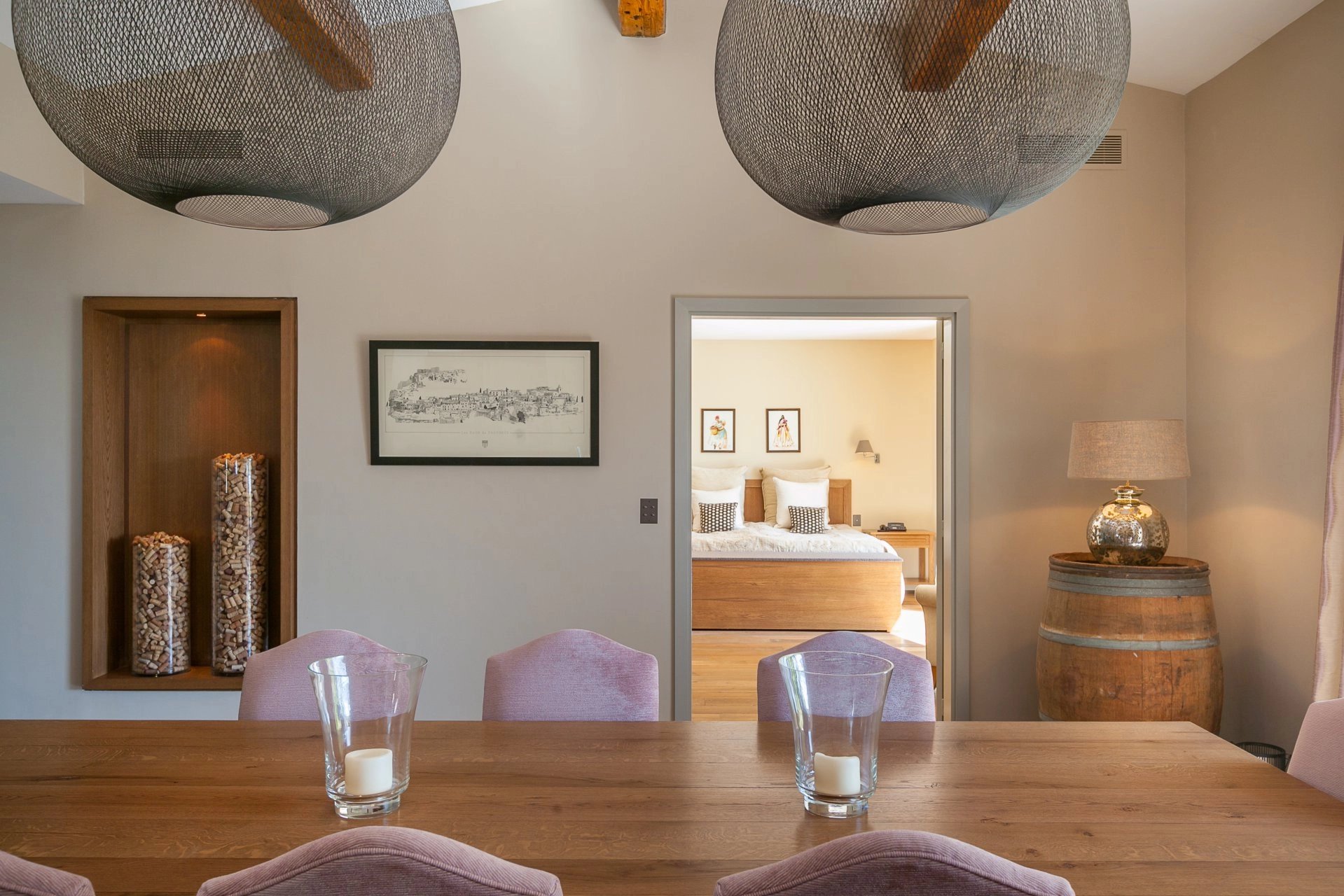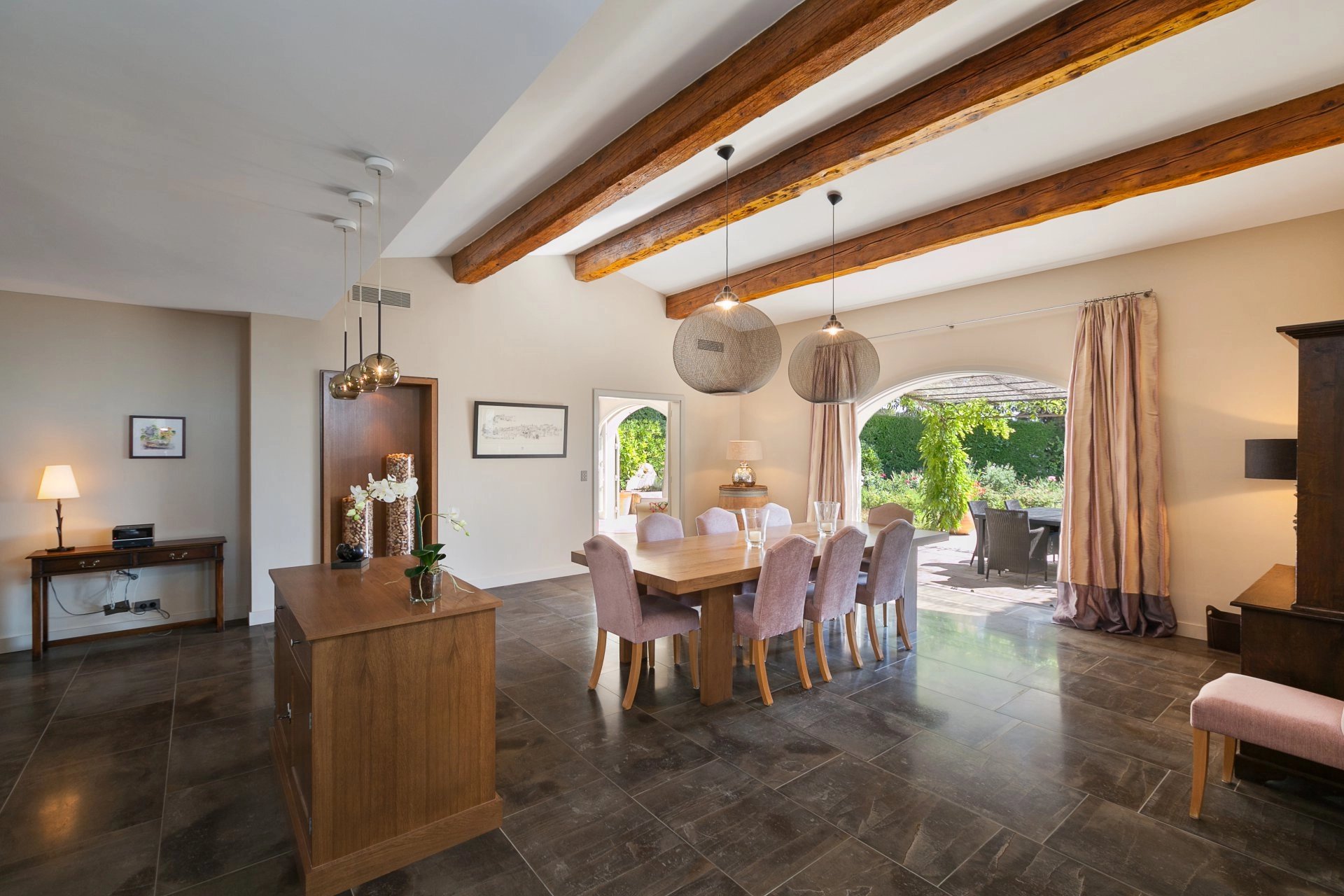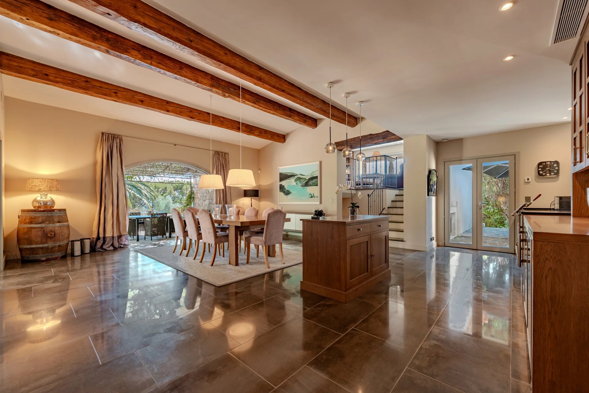 Le hall d'entrée de la villa mène directement à une grande salle à manger avec une belle hauteur sous plafond, ainsi qu’à une cuisine ouverte de haut de gamme, le point central de vos moments conviviaux, avec un accès direct aux terrasses depuis toutes les pièces.