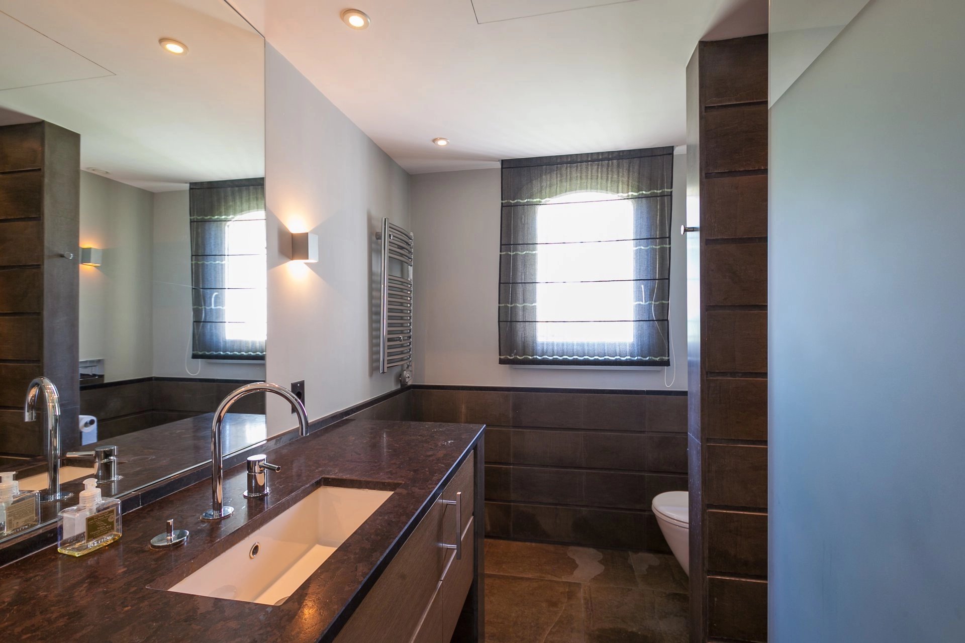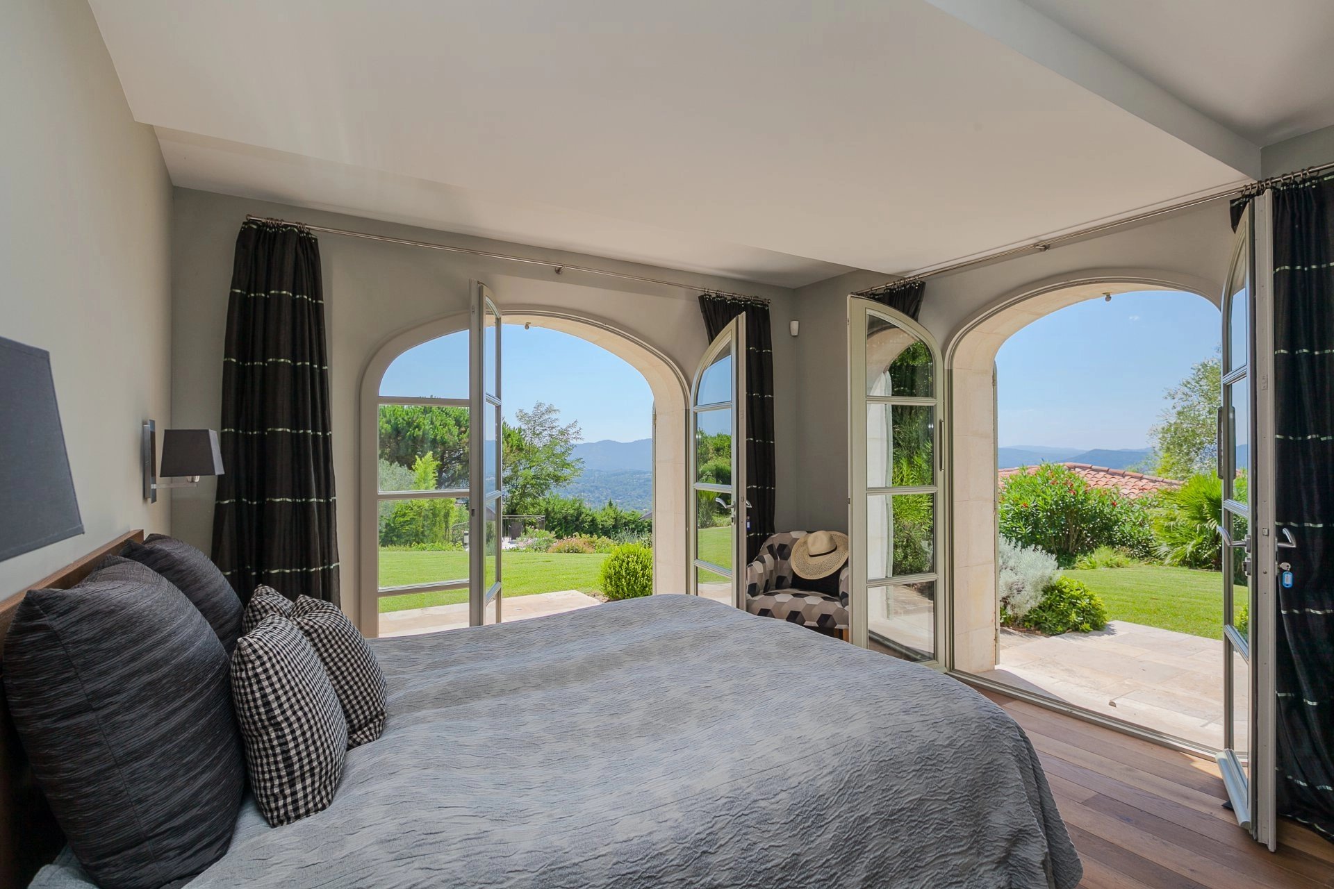 La suite principale avec dressing et salle de bains spacieuse s'ouvre également sur une terrasse par de belles portes-fenêtres.