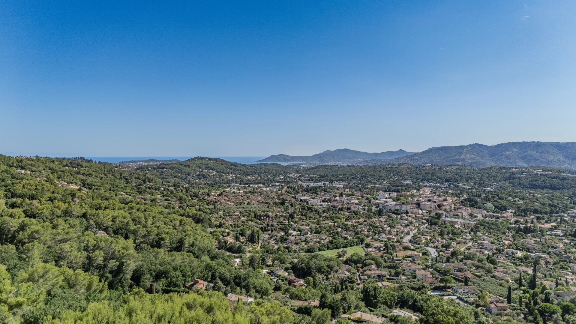 Le magnifique terrain de 5 110 m² situé au calme absolu, offre une vue panoramique incomparable à 260° sur la mer, la baie de Mandelieu et les collines de l'Estérel !