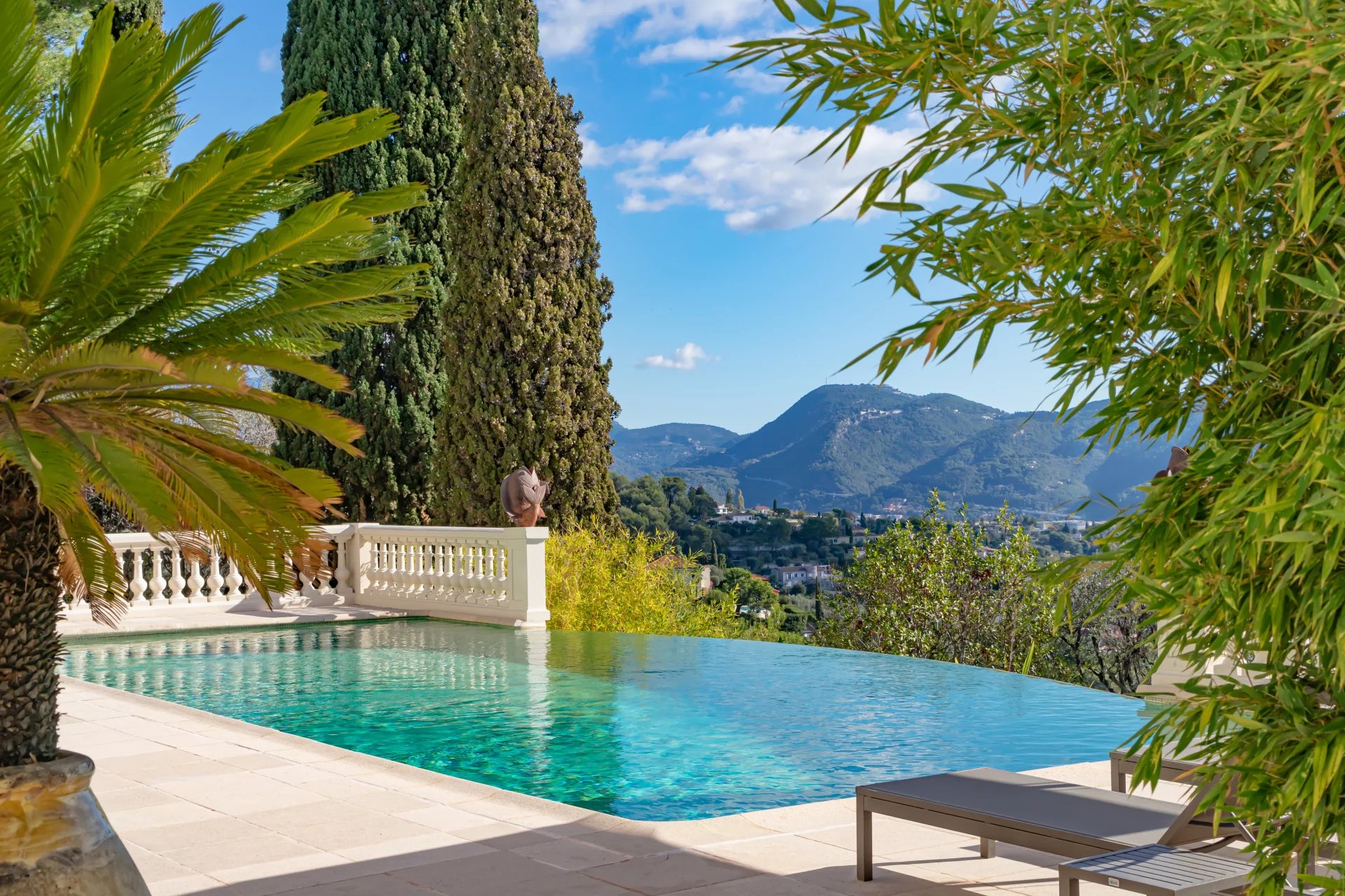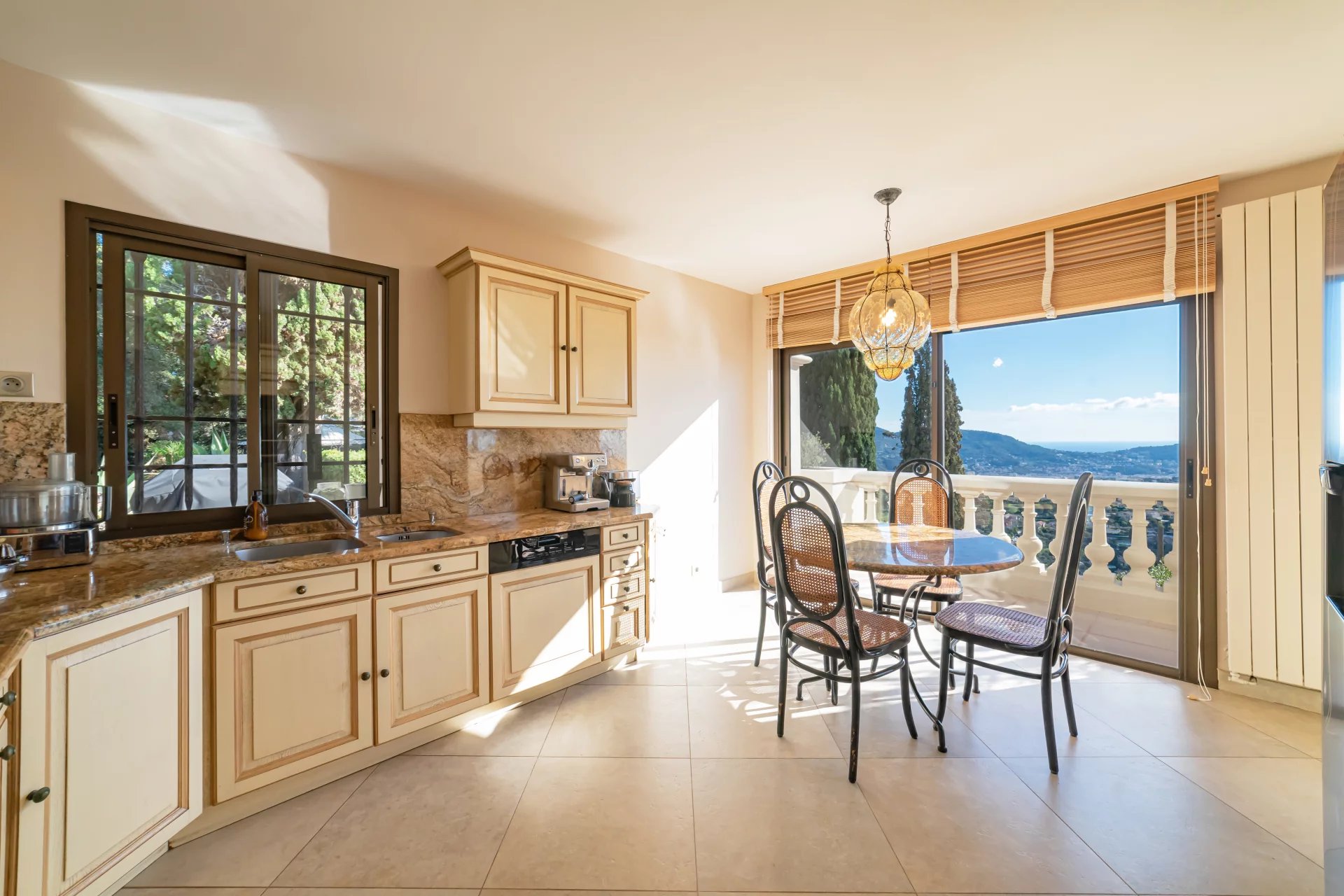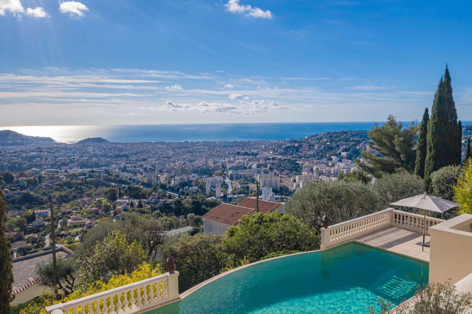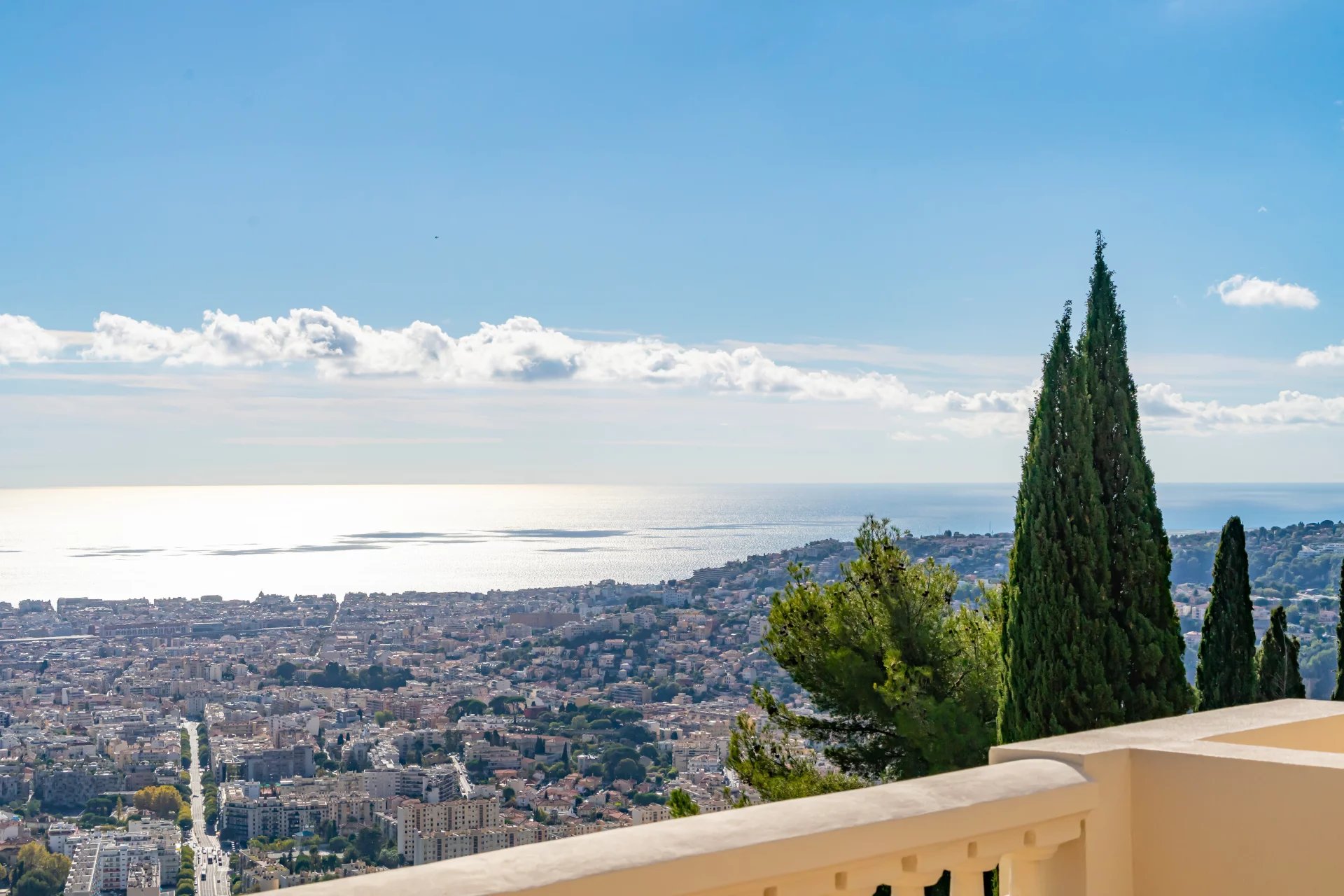 Située dans un domaine discret et privilégié, en position dominante exposée Sud-Est, cette propriété de style moderne, parfaitement entretenue, offre une vue panoramique imprenable sur la Méditerranée jusqu’au Cap d’Antibes ainsi que sur les collines niçoises des Monts Vinaigrier et Mont Boron et bien au-delà.