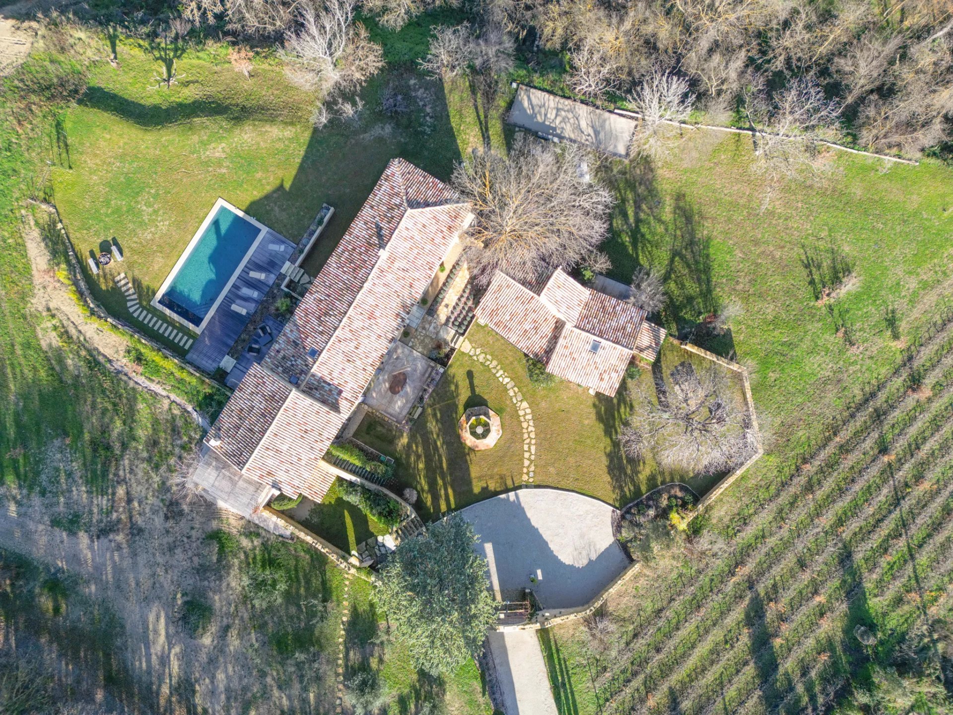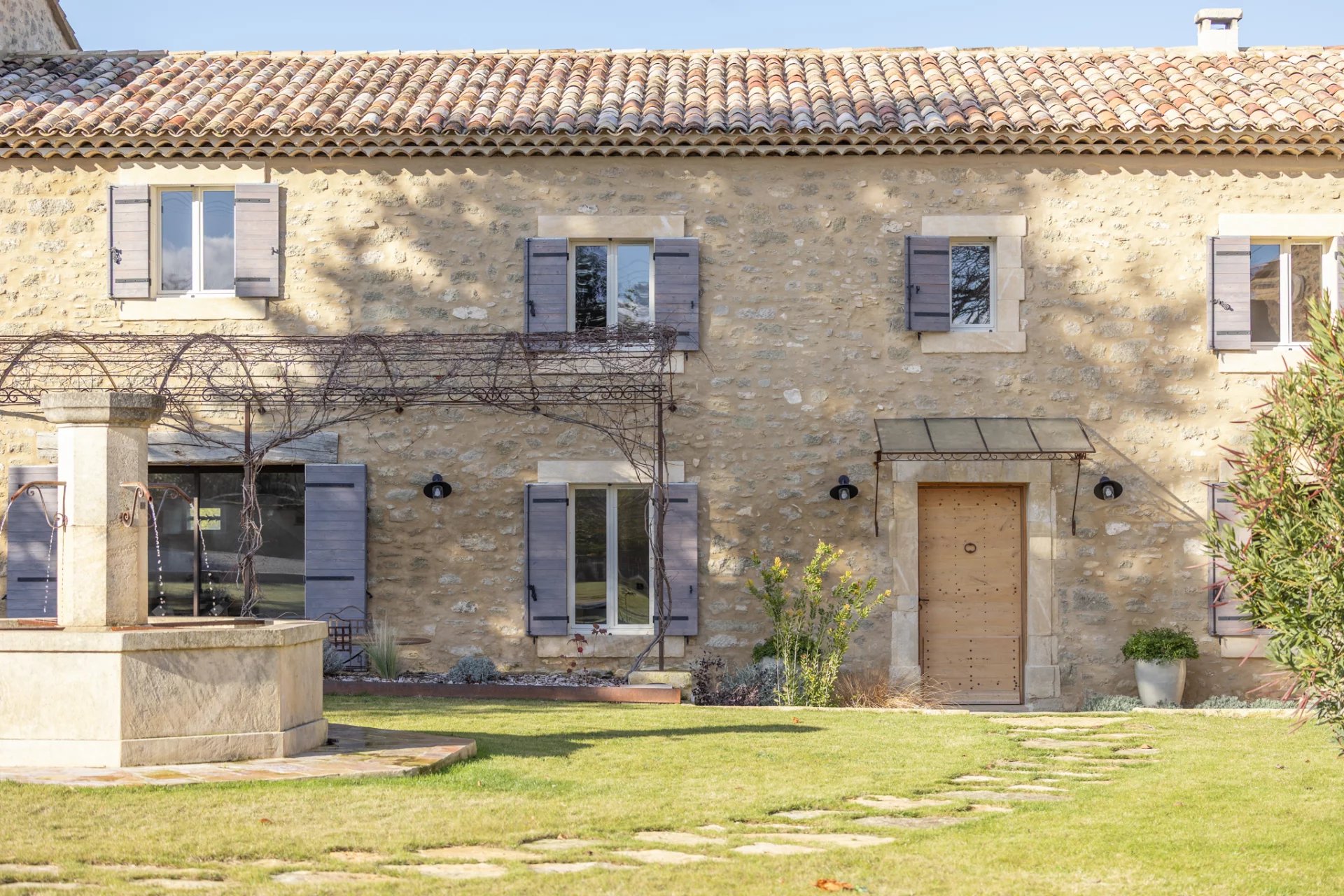 Les extérieurs invitent pleinement à la vie provençale : multiples terrasses aux expositions différentes, une grande terrasse couverte, un jardin paysager, une magnifique cour agencée autour d'une fontaine rappelant la place centrale d'un village provençal, et une somptueuse piscine chauffée de 12 x 5 m offrant une vue dégagée sur la campagne environnante, les Monts de Vaucluse et le Mont Ventoux.