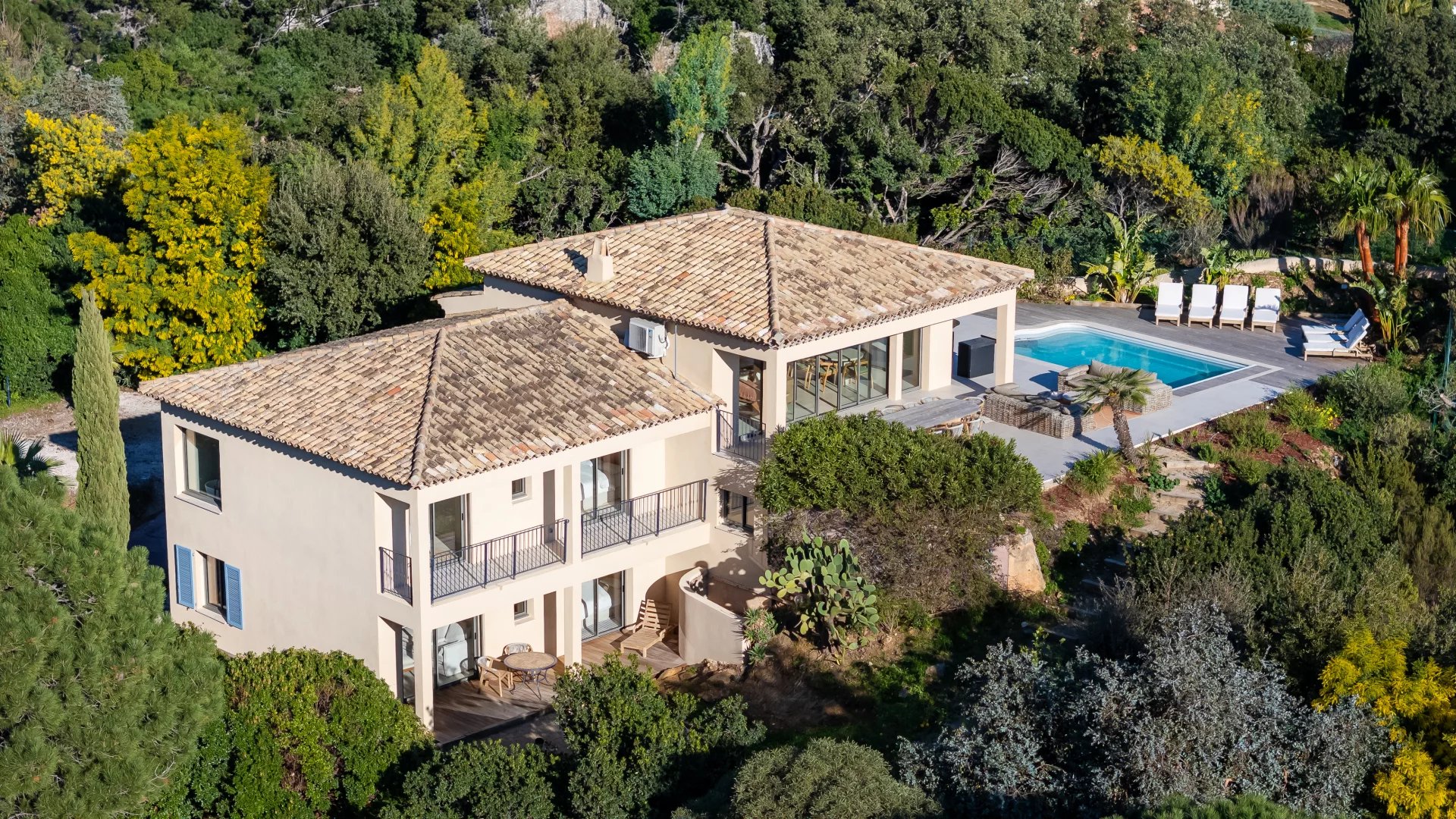 Nichée sur les hauteurs, elle profite d’une exposition plein sud, offrant une vue imprenable sur la mer, les îles d’Or et le Cap Nègre.
