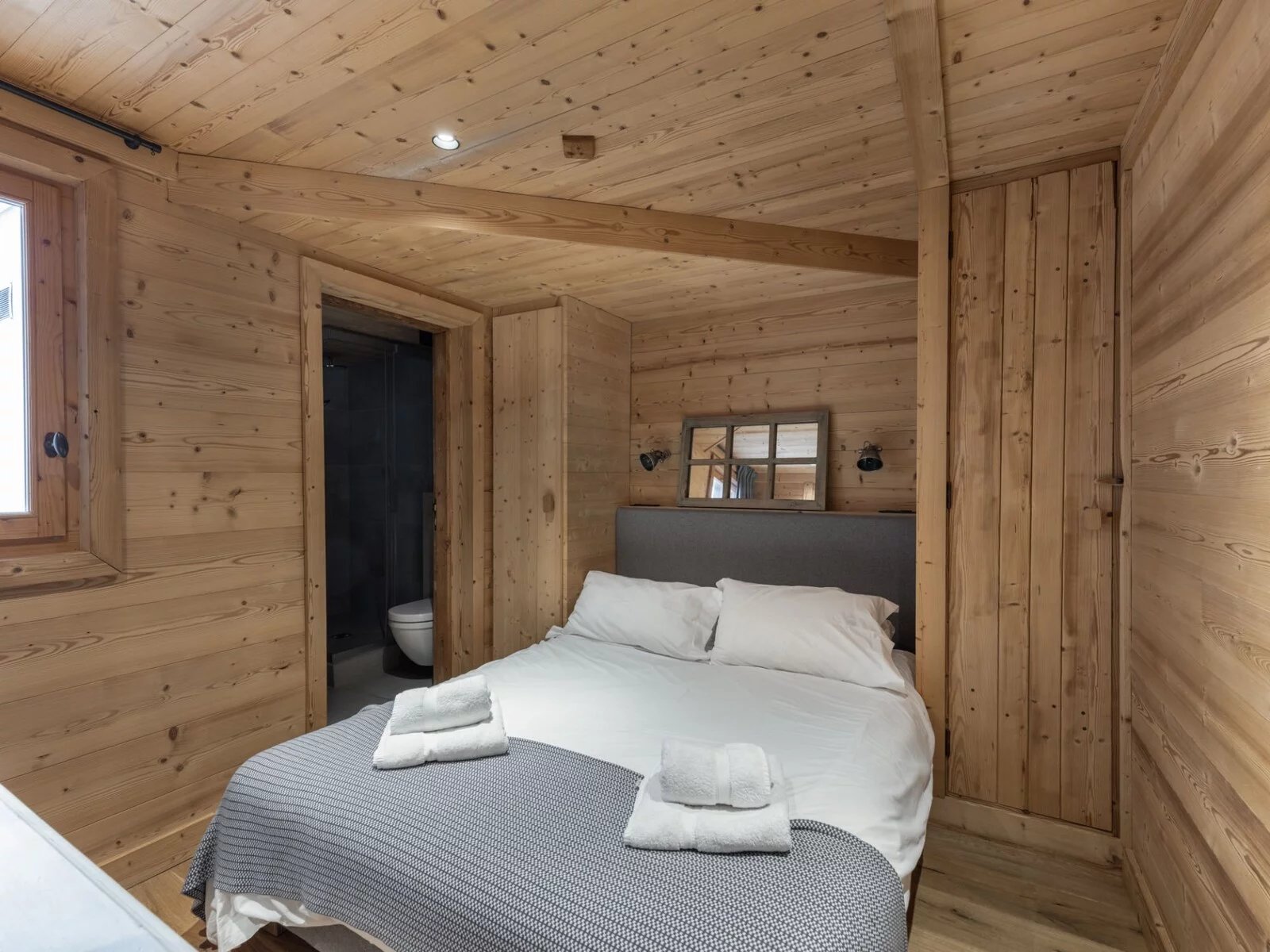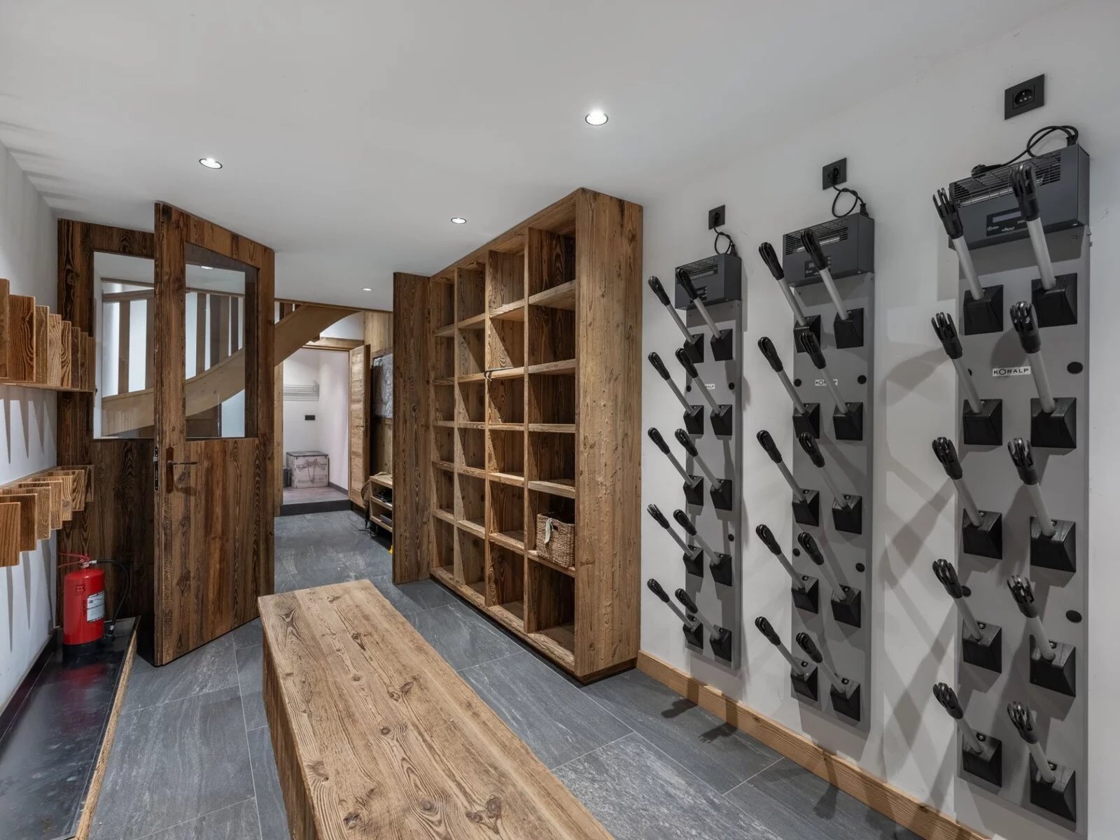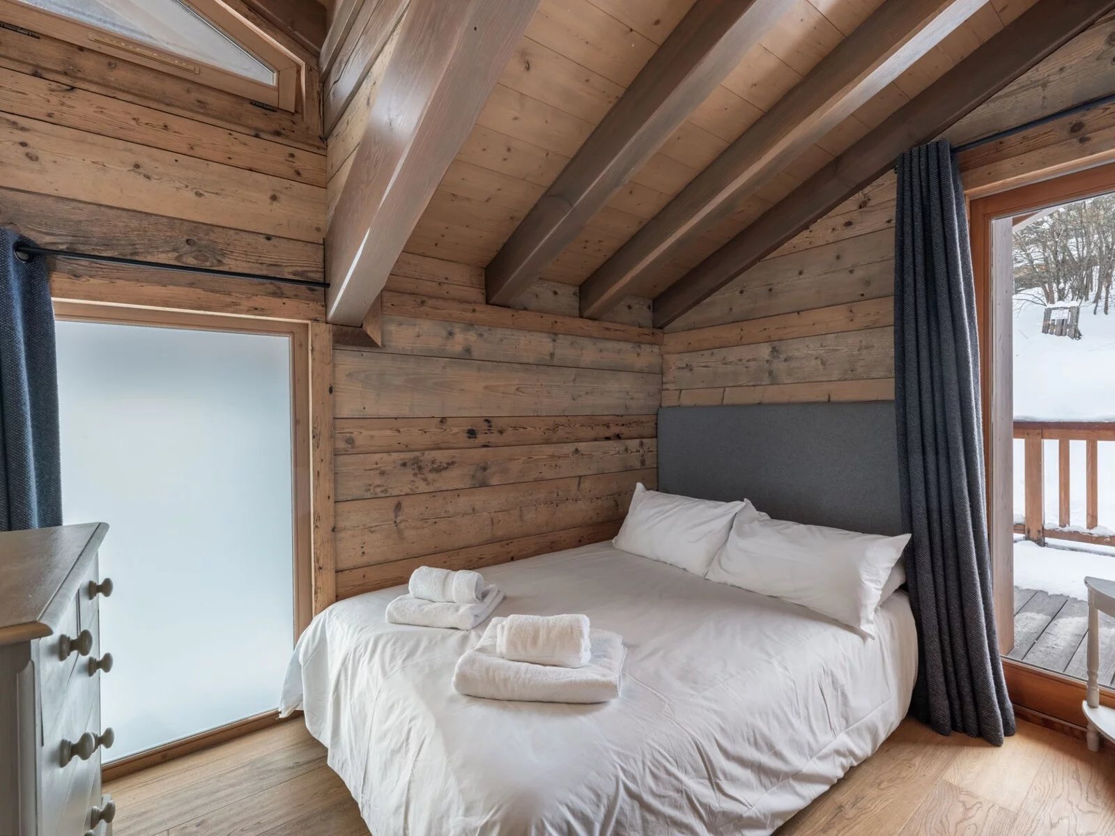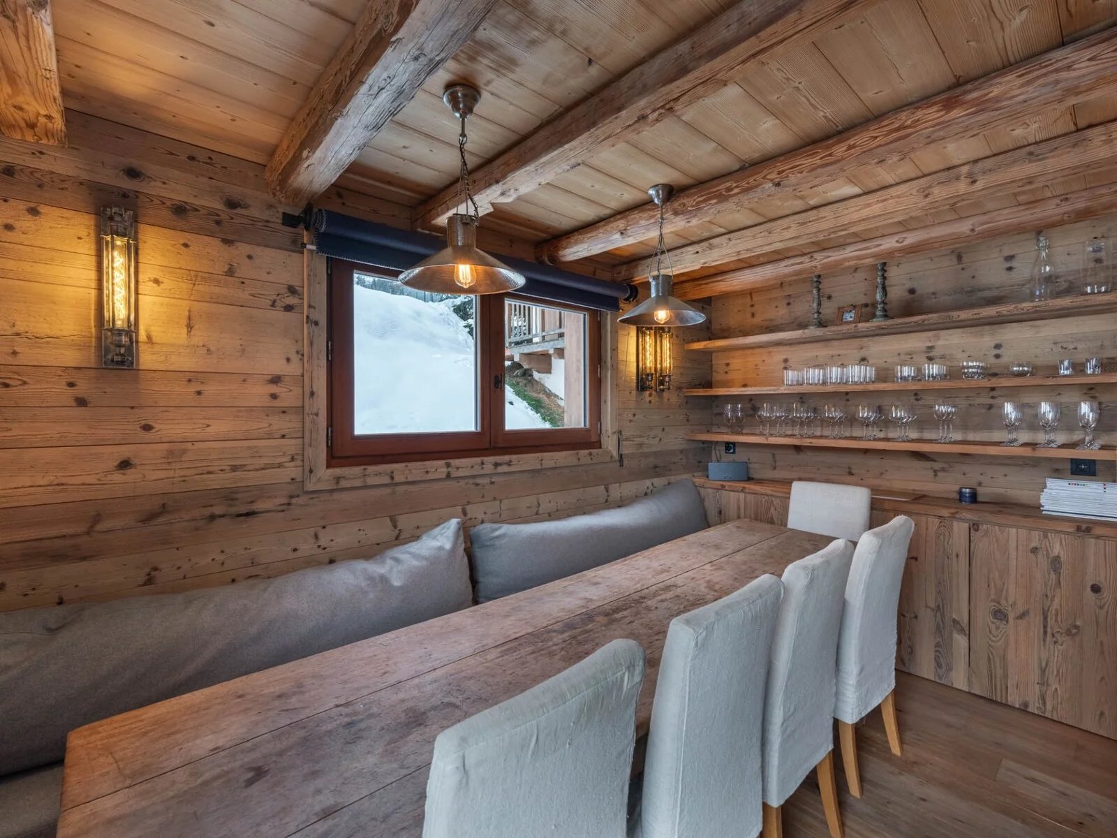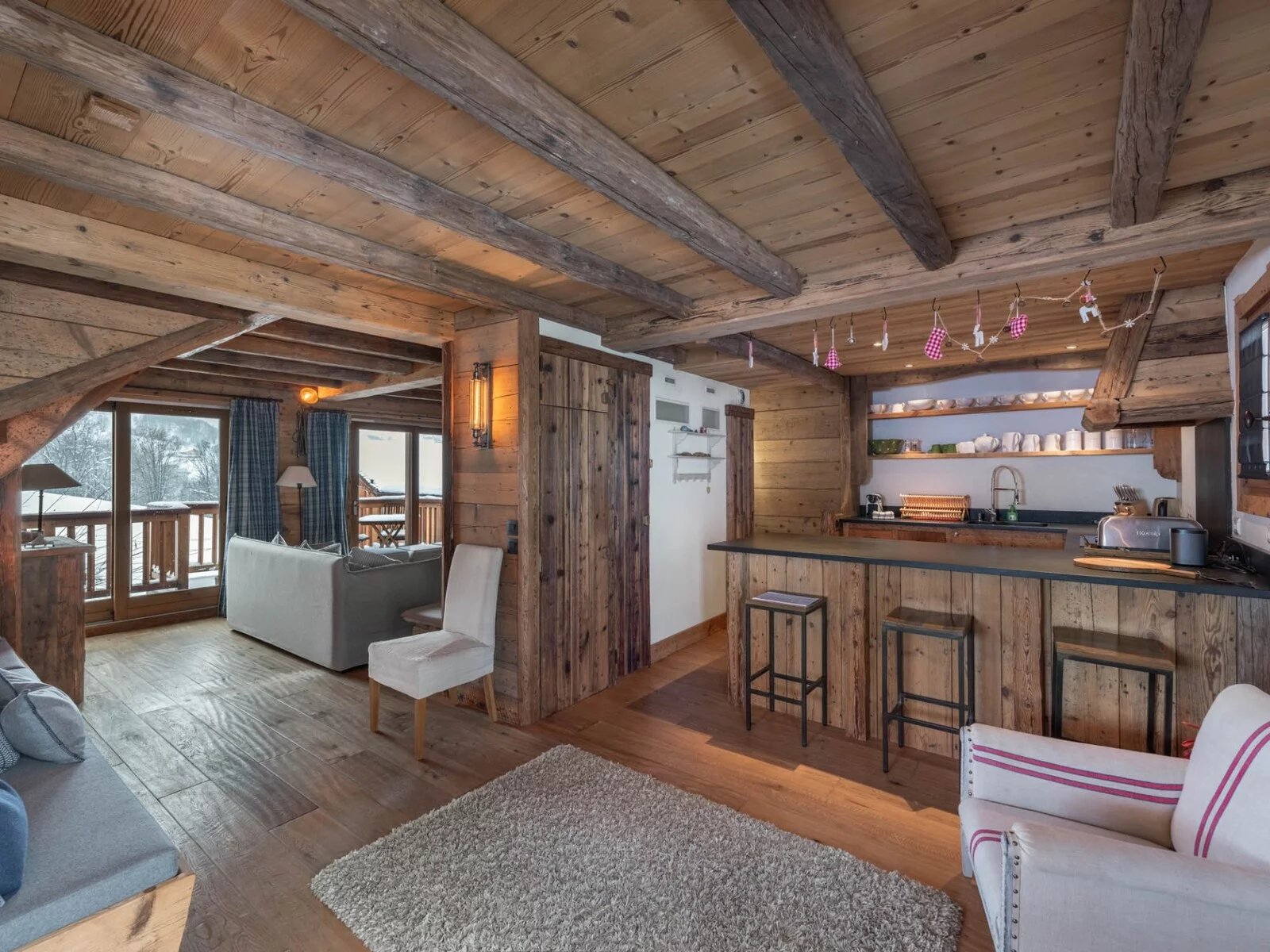 Il propose 7 chambres doubles en suite, un niveau complet dédié à l'espace de vie avec une grande cuisine équipée et ouverte sur une grande salle à manger et un salon exposé sud avec terrasse. Le rez-de-chaussée est aménagé avec un grand ski room (et son mur de chauffe chaussures), un coin salon TV et une buanderie.