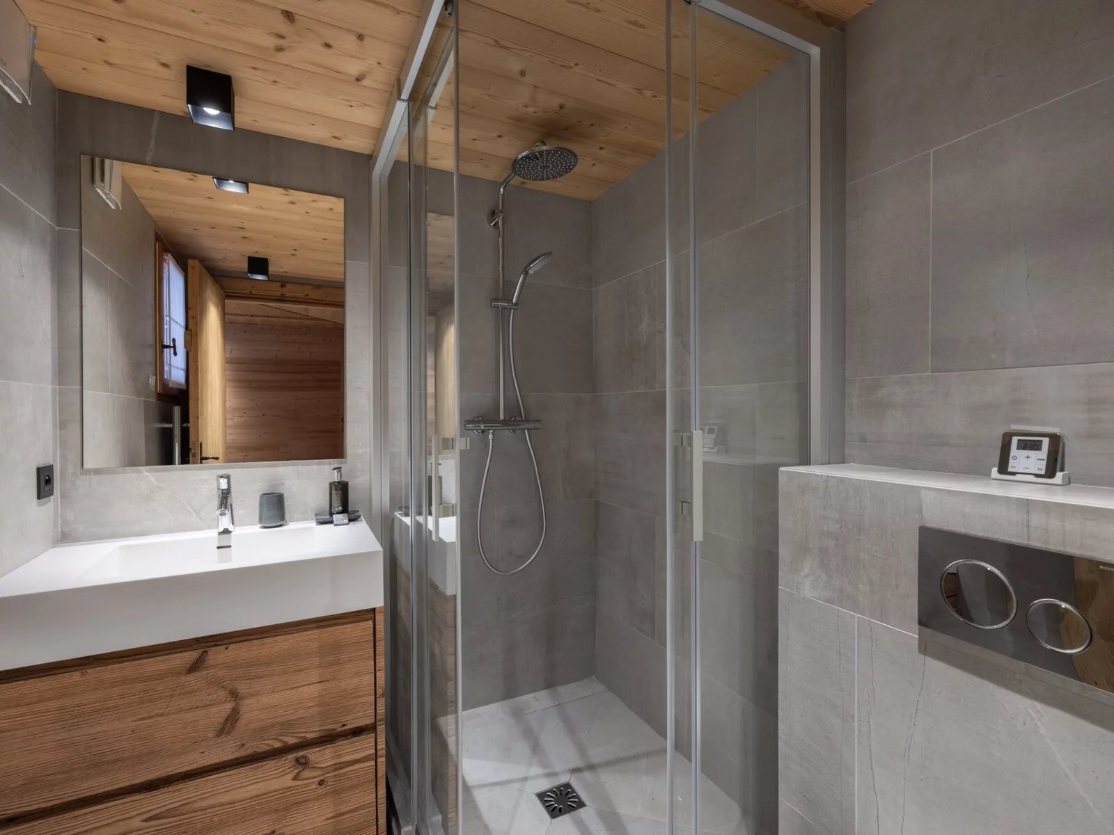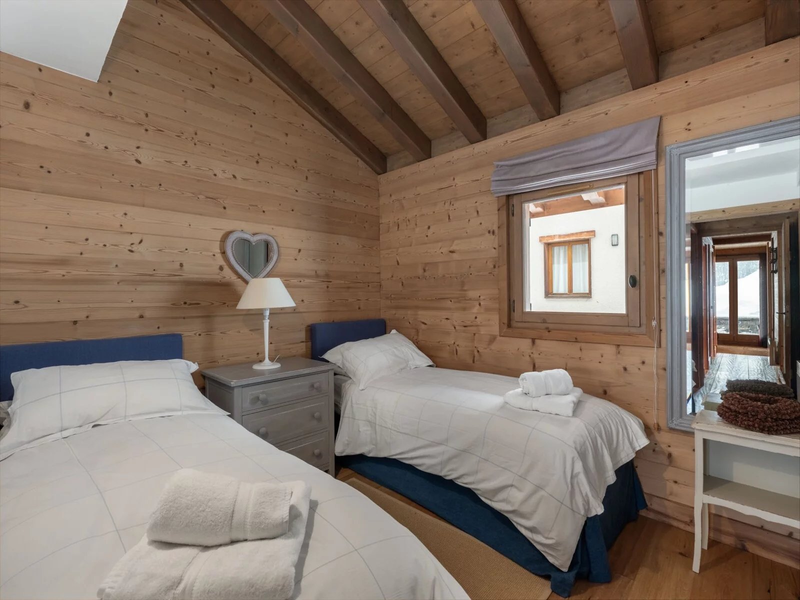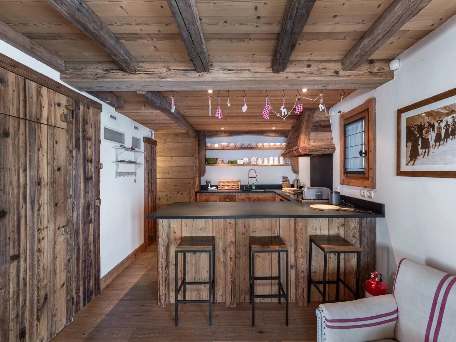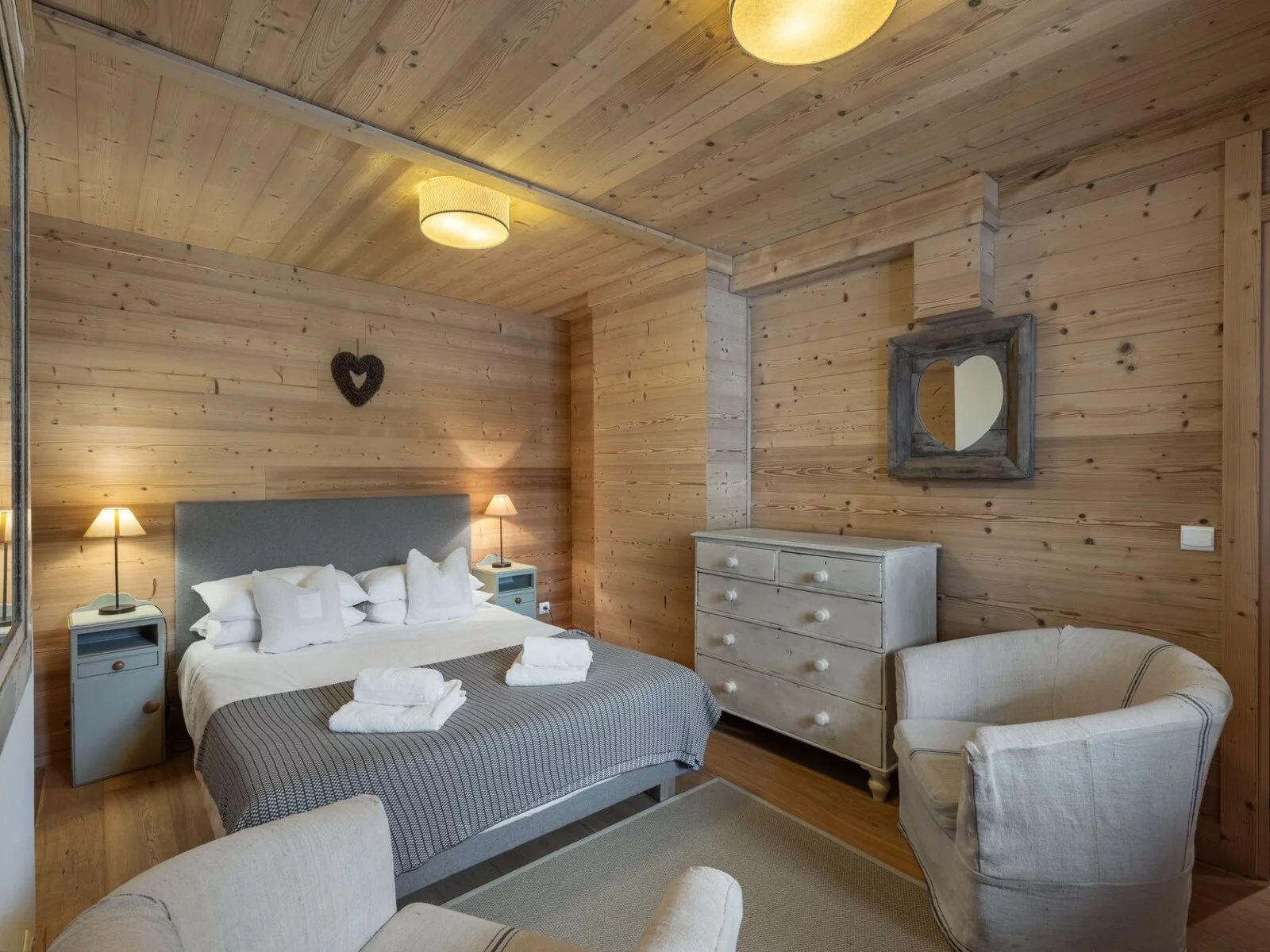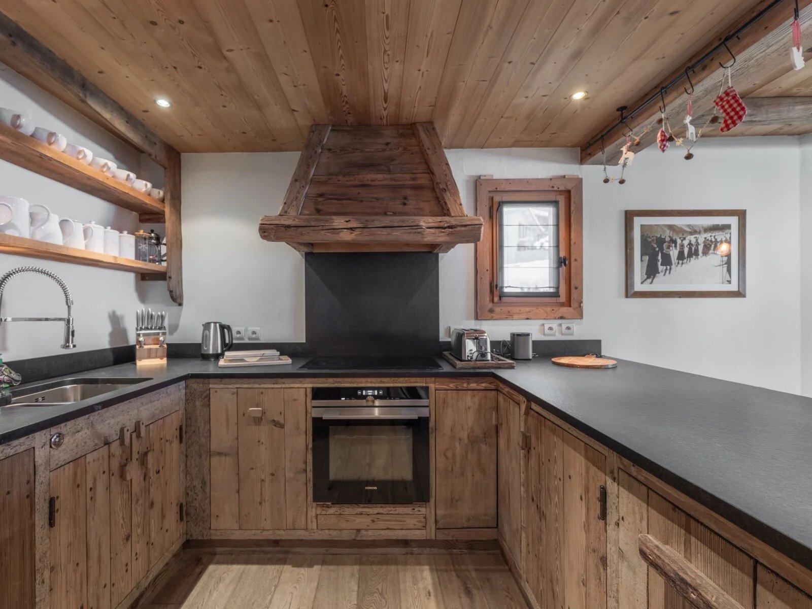 Il propose 7 chambres doubles en suite, un niveau complet dédié à l'espace de vie avec une grande cuisine équipée et ouverte sur une grande salle à manger et un salon exposé sud avec terrasse. Le rez-de-chaussée est aménagé avec un grand ski room (et son mur de chauffe chaussures), un coin salon TV et une buanderie.