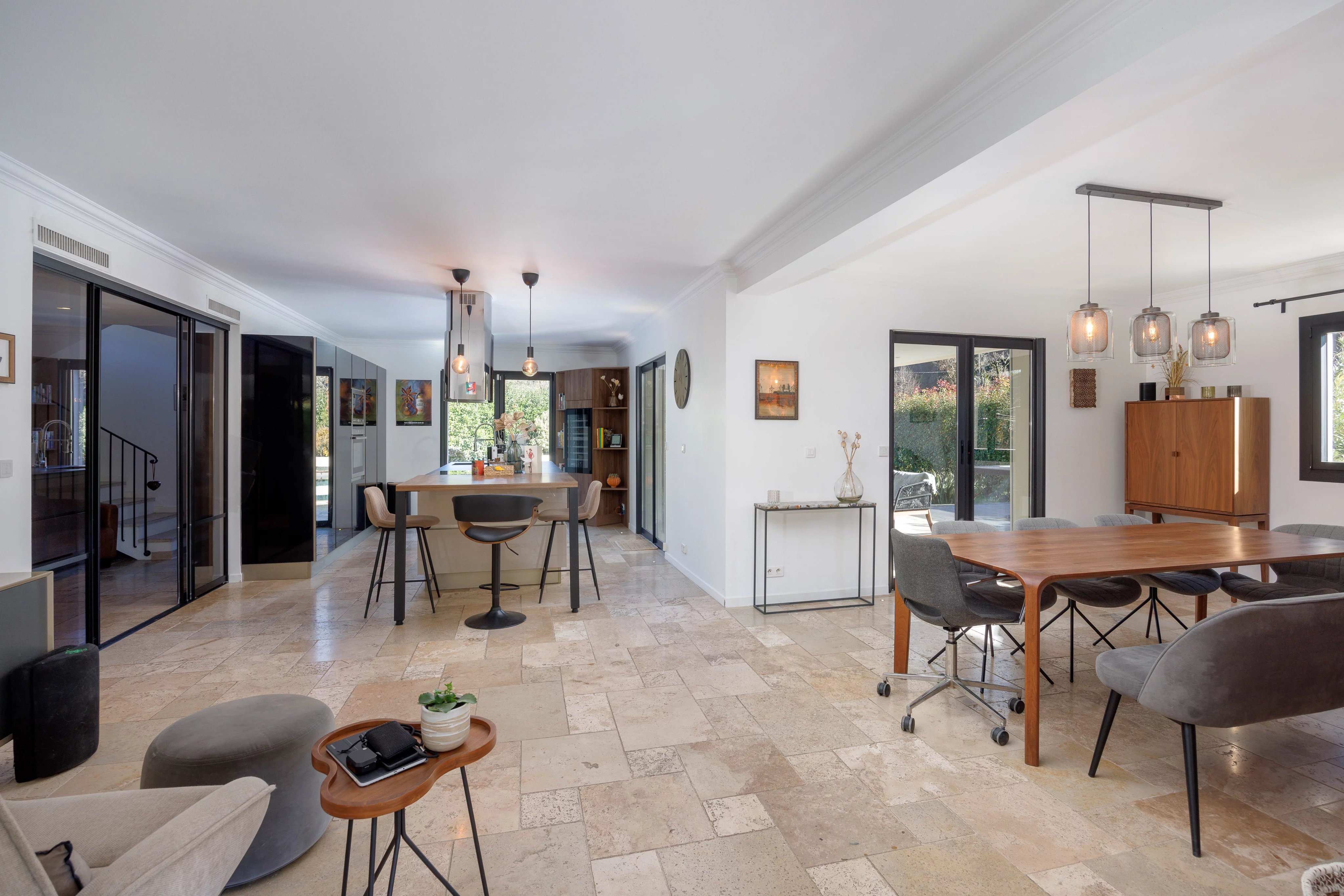L’entrée s’ouvre sur un vaste espace de vie baigné de lumière, comprenant un séjour et une cuisine ouverte avec îlot central, largement ouverts sur l’extérieur grâce à de grandes baies vitrées à galandage. La salle à manger est élégamment séparée du séjour par une verrière d’atelier, apportant fluidité, perspective et luminosité à l’ensemble.