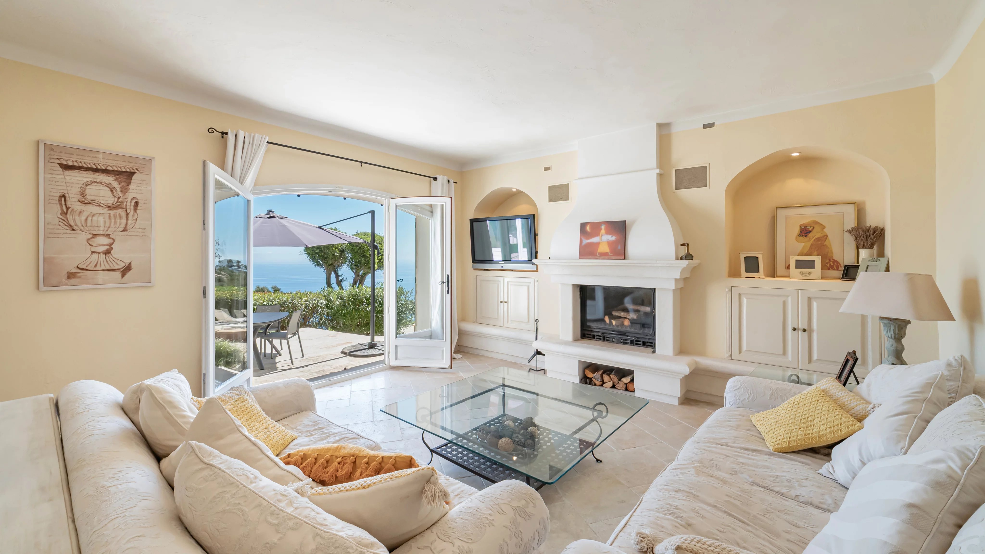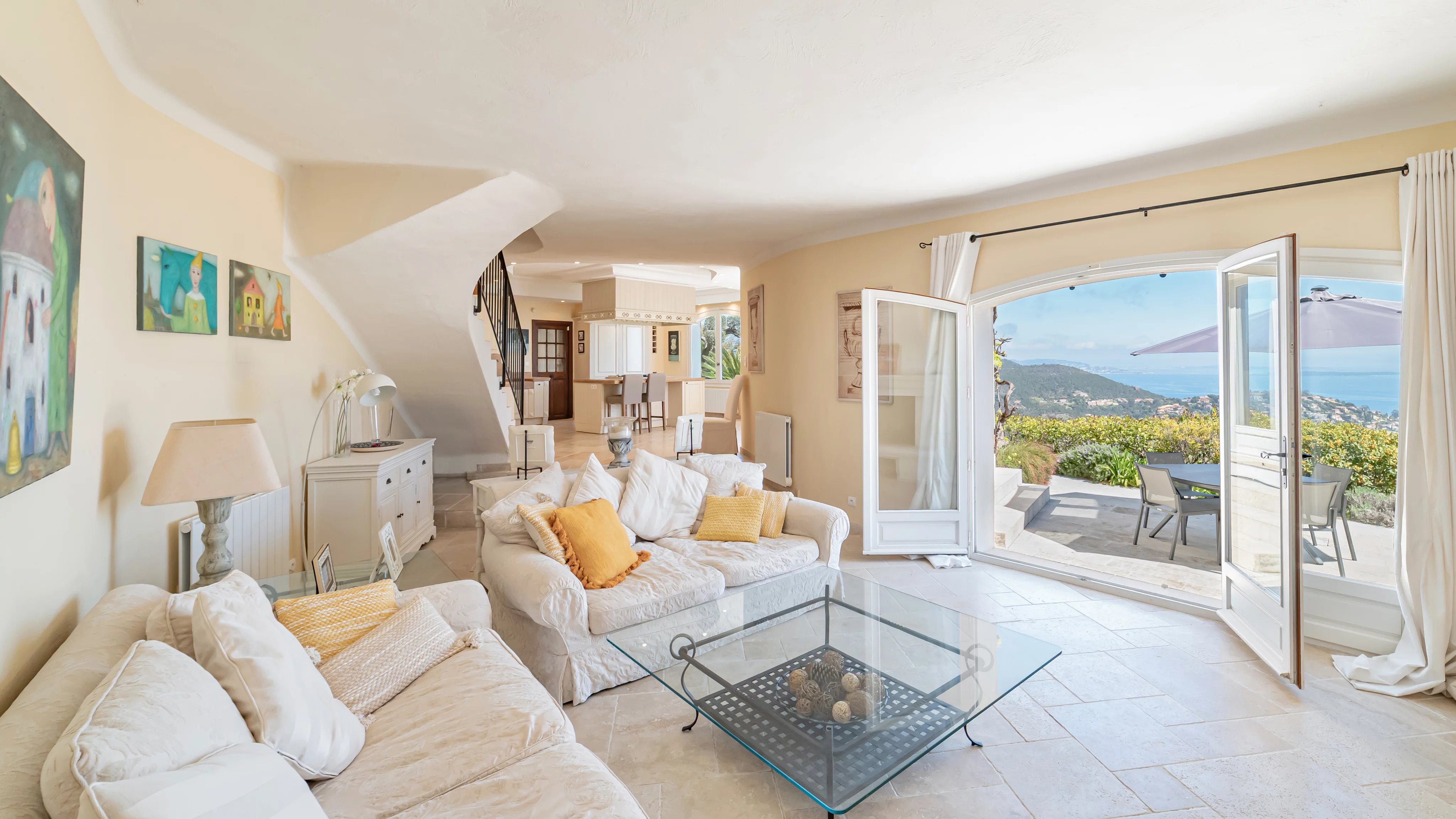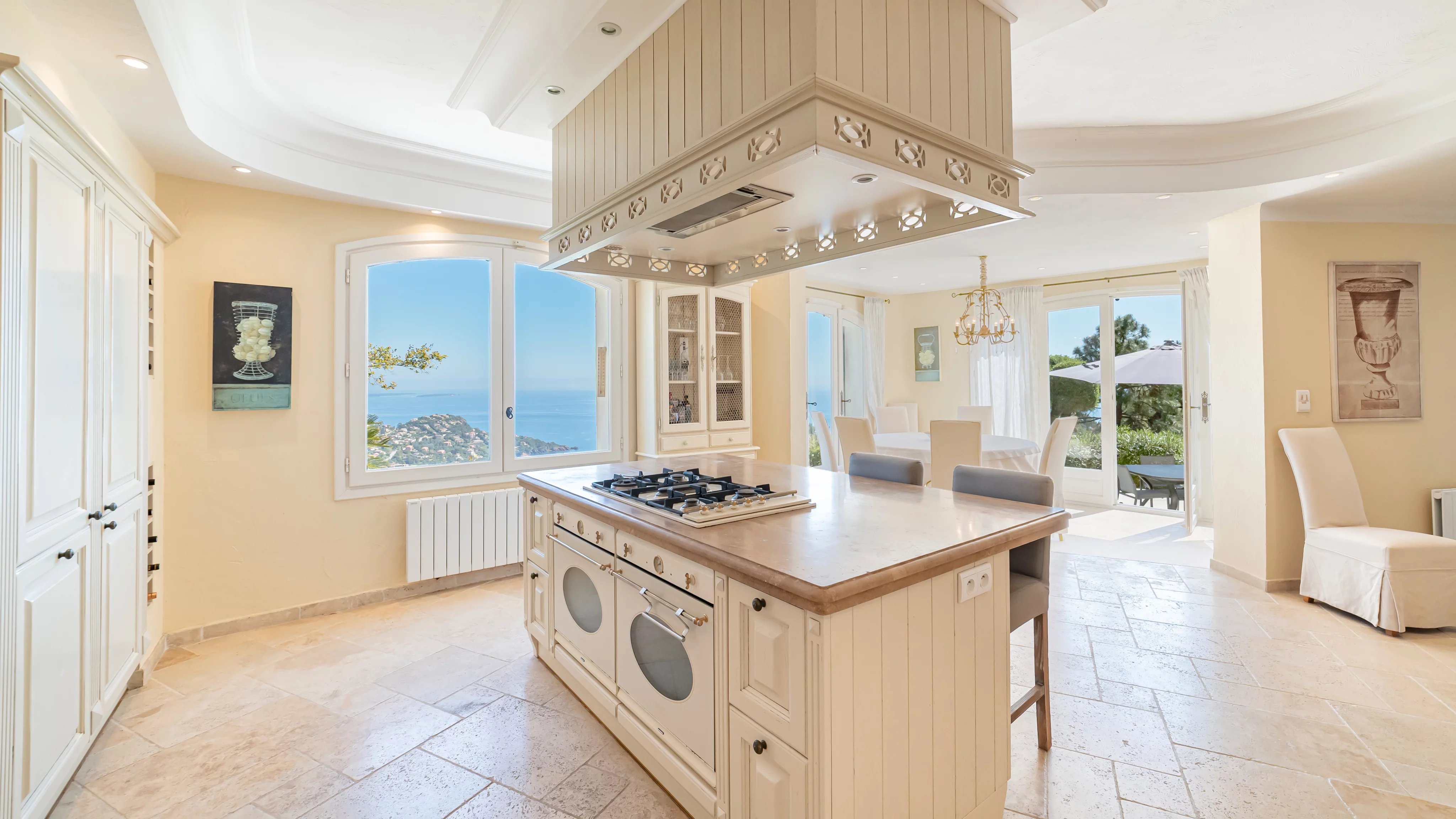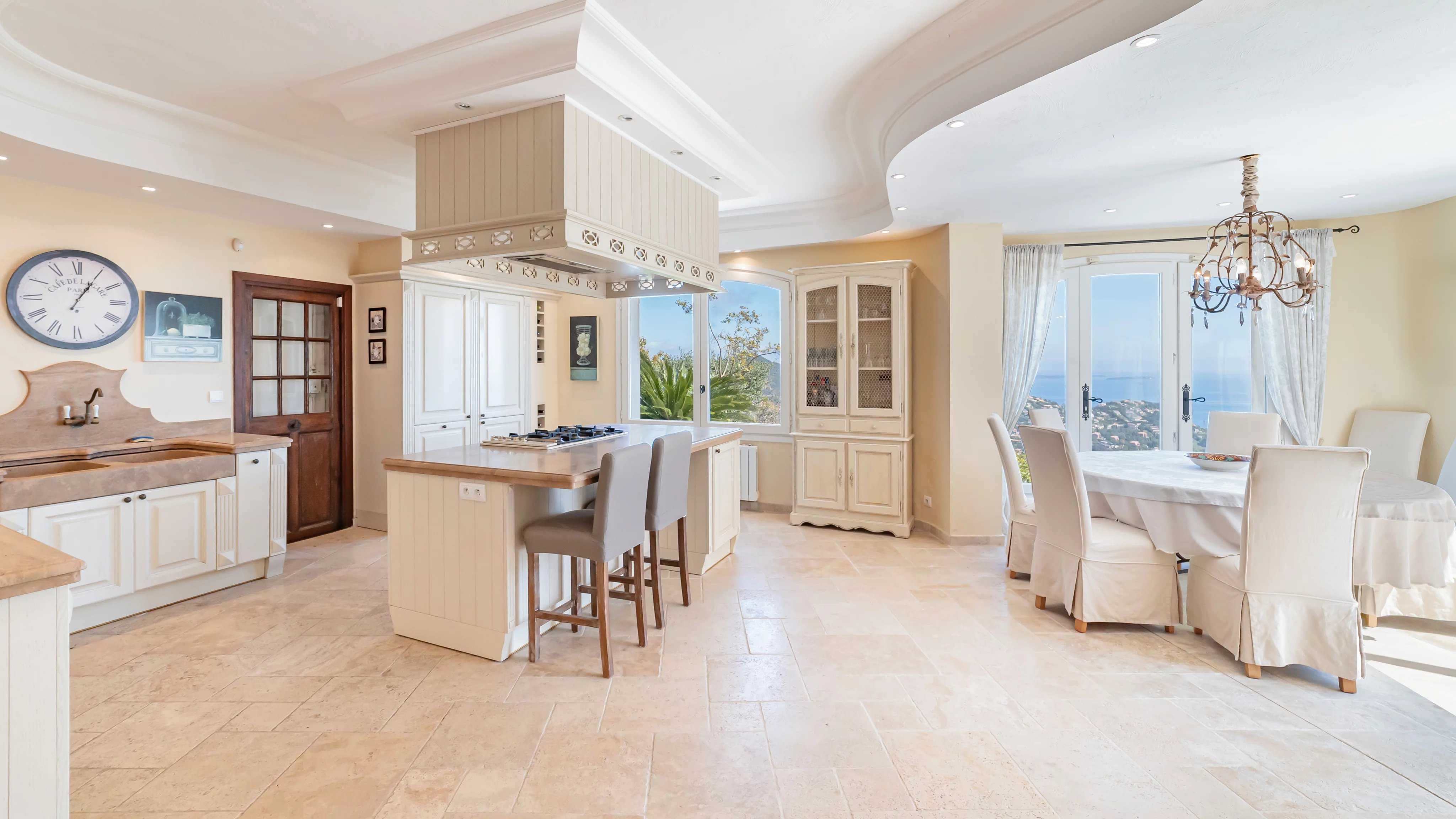 - Une vaste pièce de vie baignée de lumière, comprenant un séjour avec cheminée, une salle à manger et une cuisine ouverte, l’ensemble largement tourné vers la mer.