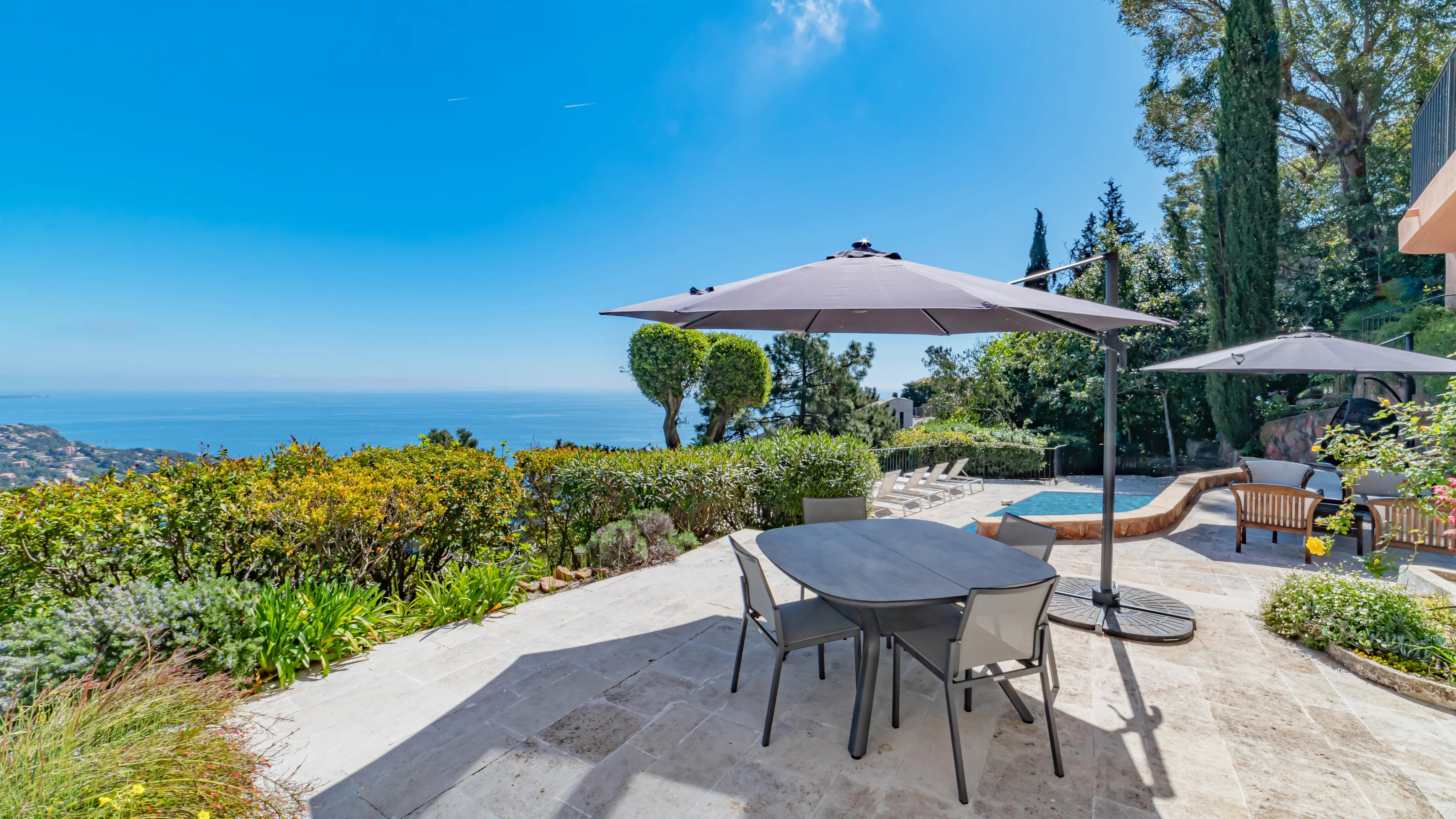 De larges terrasses prolongent les espaces intérieurs, accompagnées d’une piscine offrant une vue dominante sur la Méditerranée.