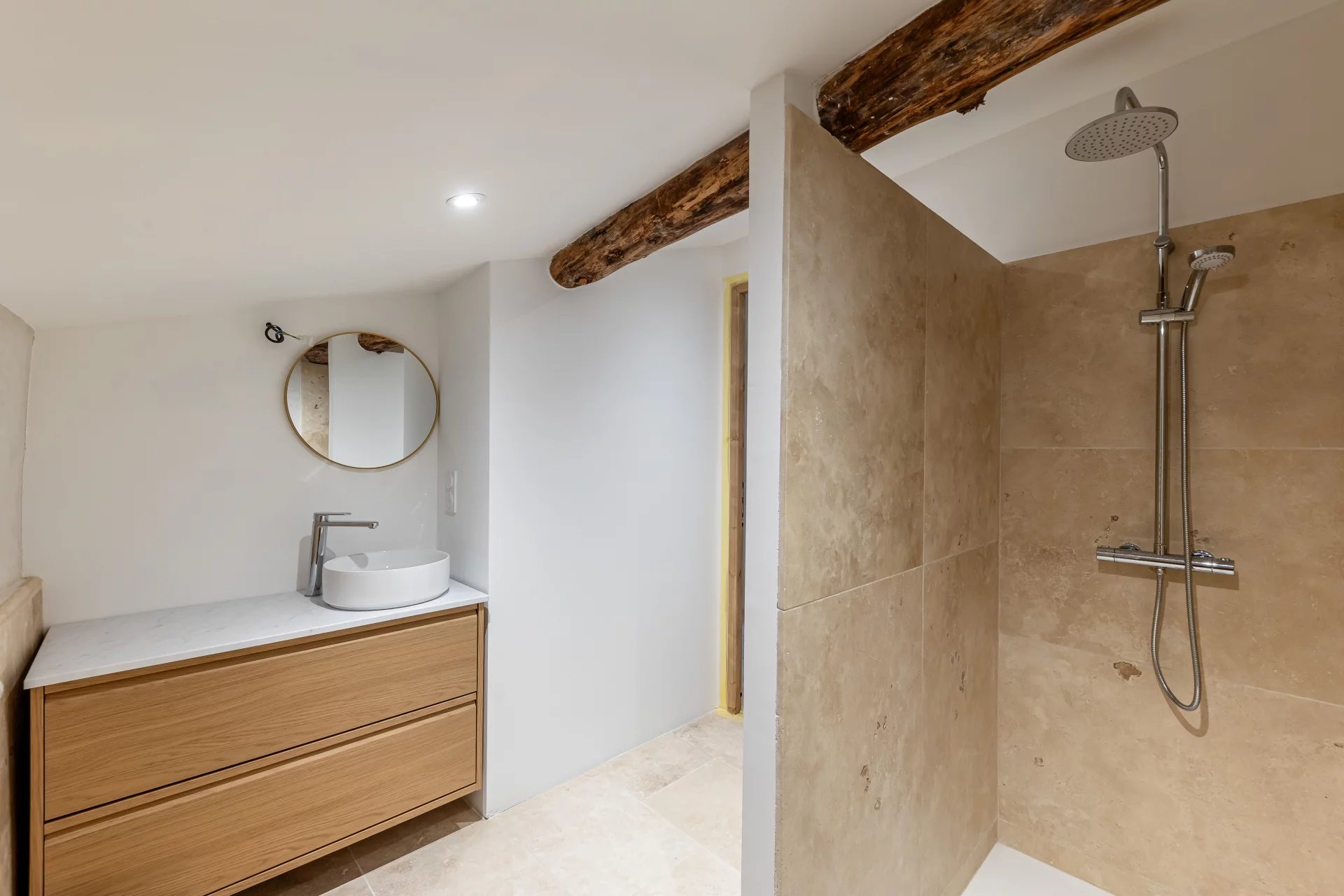 L’ensemble se compose de plusieurs bâtiments, mêlant espaces rénovés avec soin et volumes encore ouverts à l’imagination. La maison principale occupe l’espace avec une circulation fluide entre les pièces de vie, la chambre parentale du rez-de-chaussée, et les espaces nocturnes situés à l’étage. Les matériaux nobles, pierres, bois, sols en travertin, créent une atmosphère douce, tandis que les aménagements contemporains s’intègrent avec discrétion.